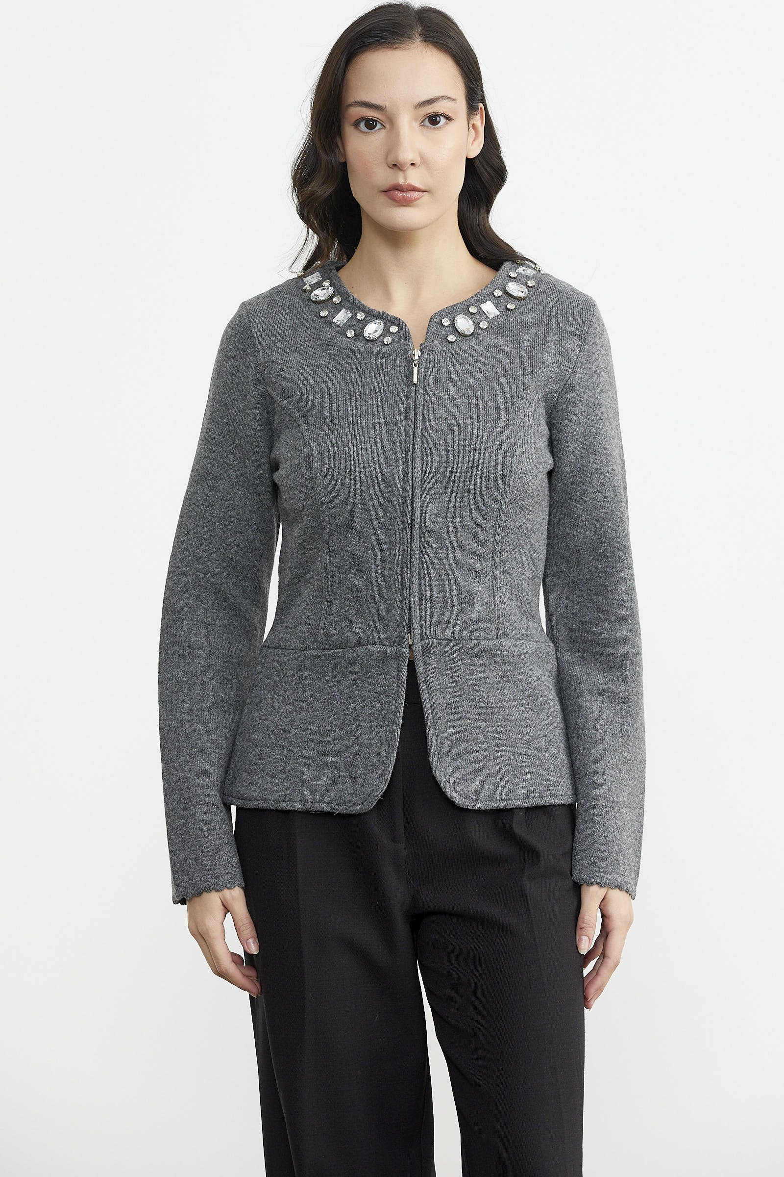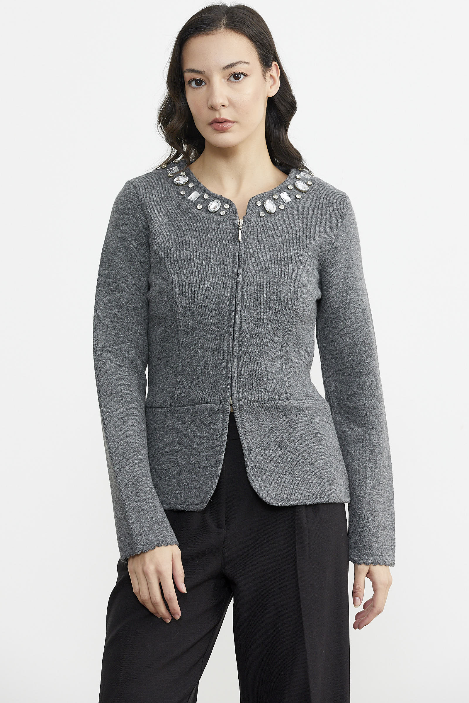 Taş Detaylı Kısa Yünlü Triko Ceket - Koyu Gri