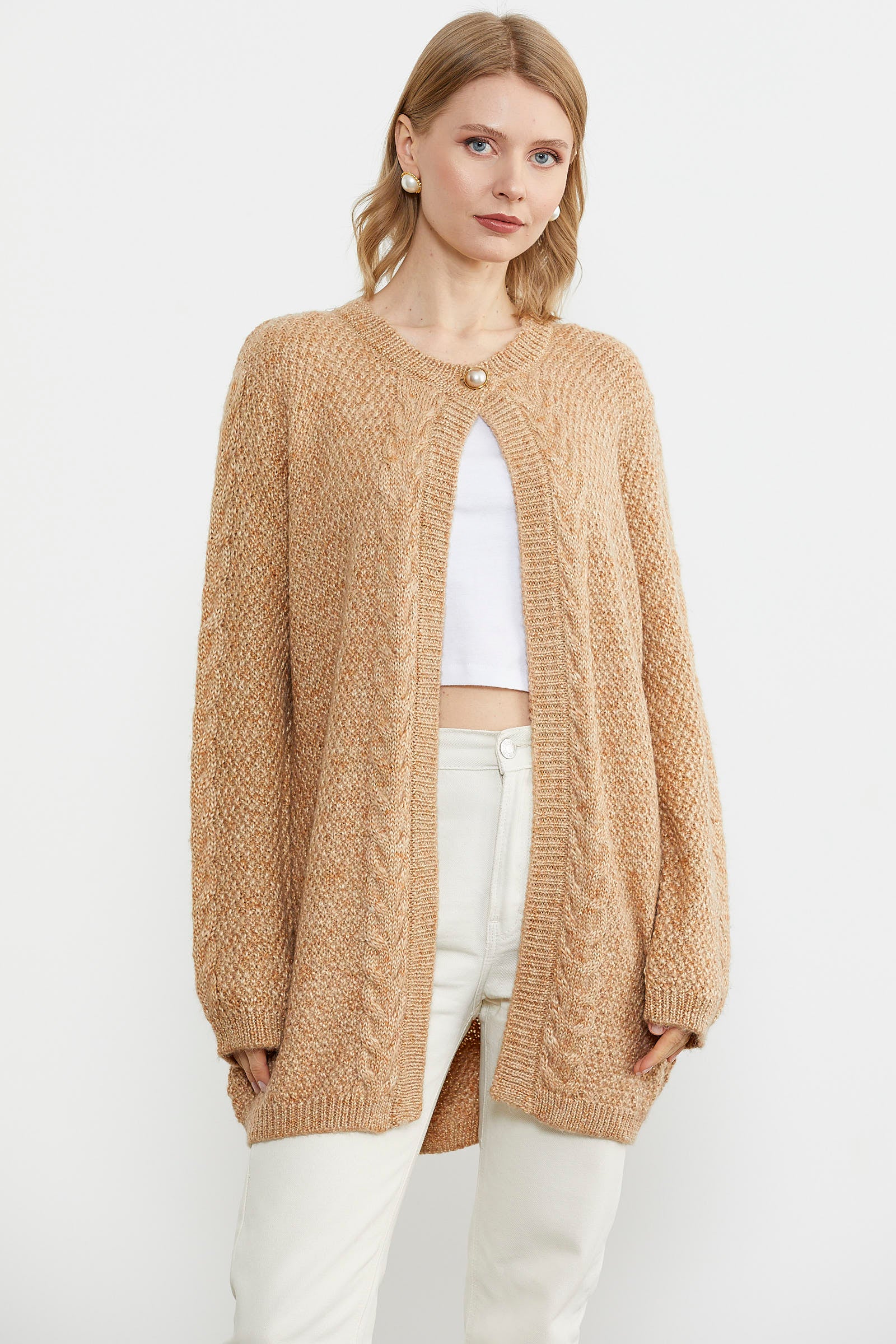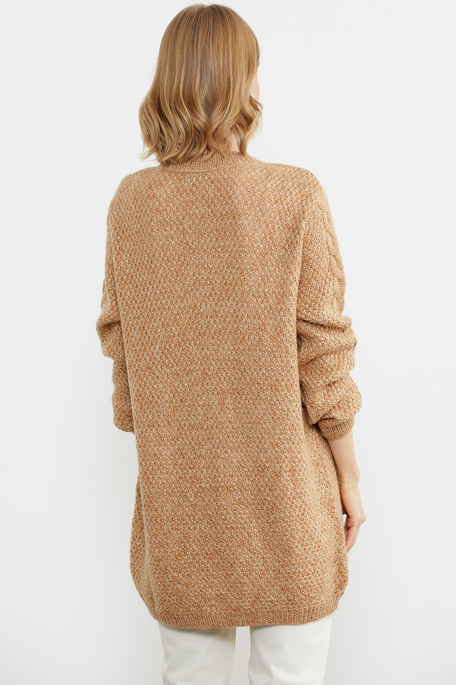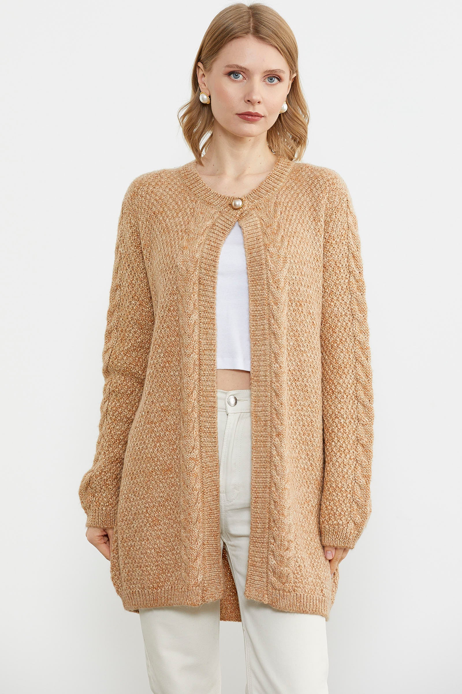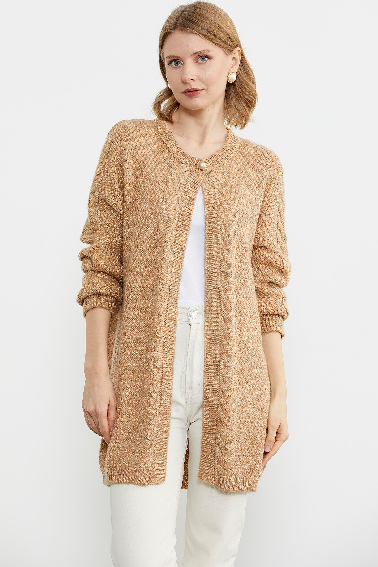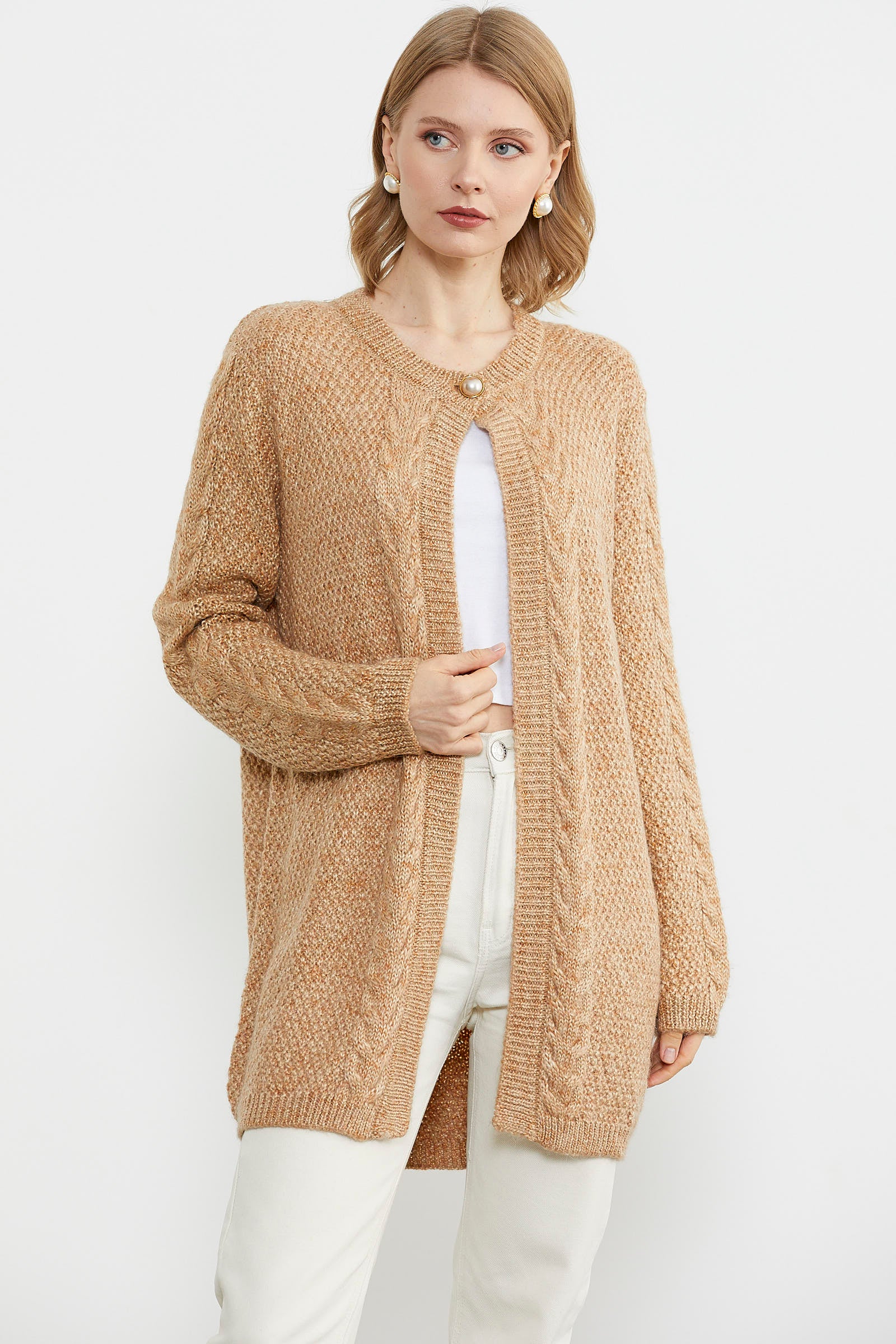Tek Düğme Uzun Triko Hırka - Kamel