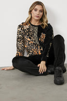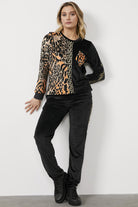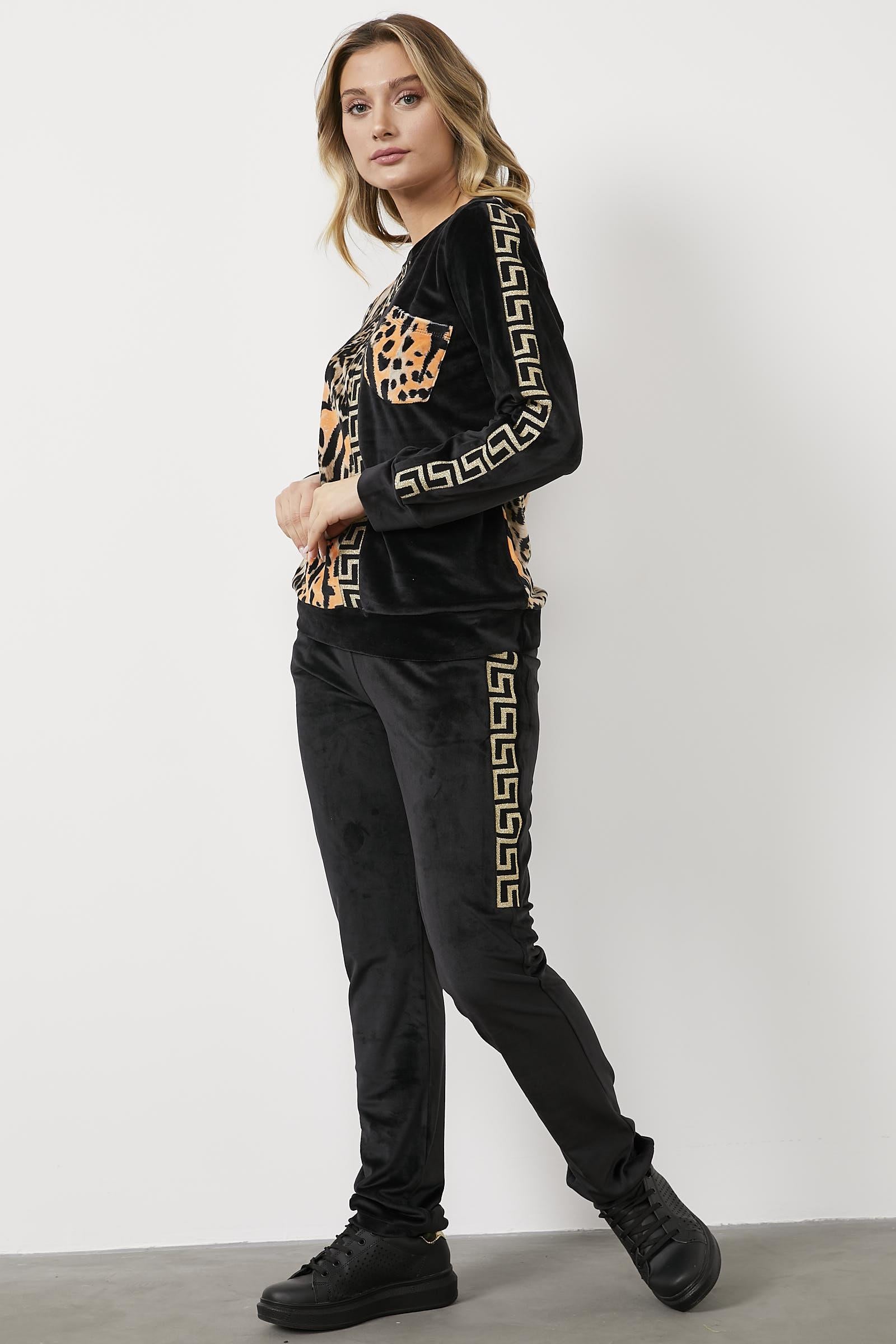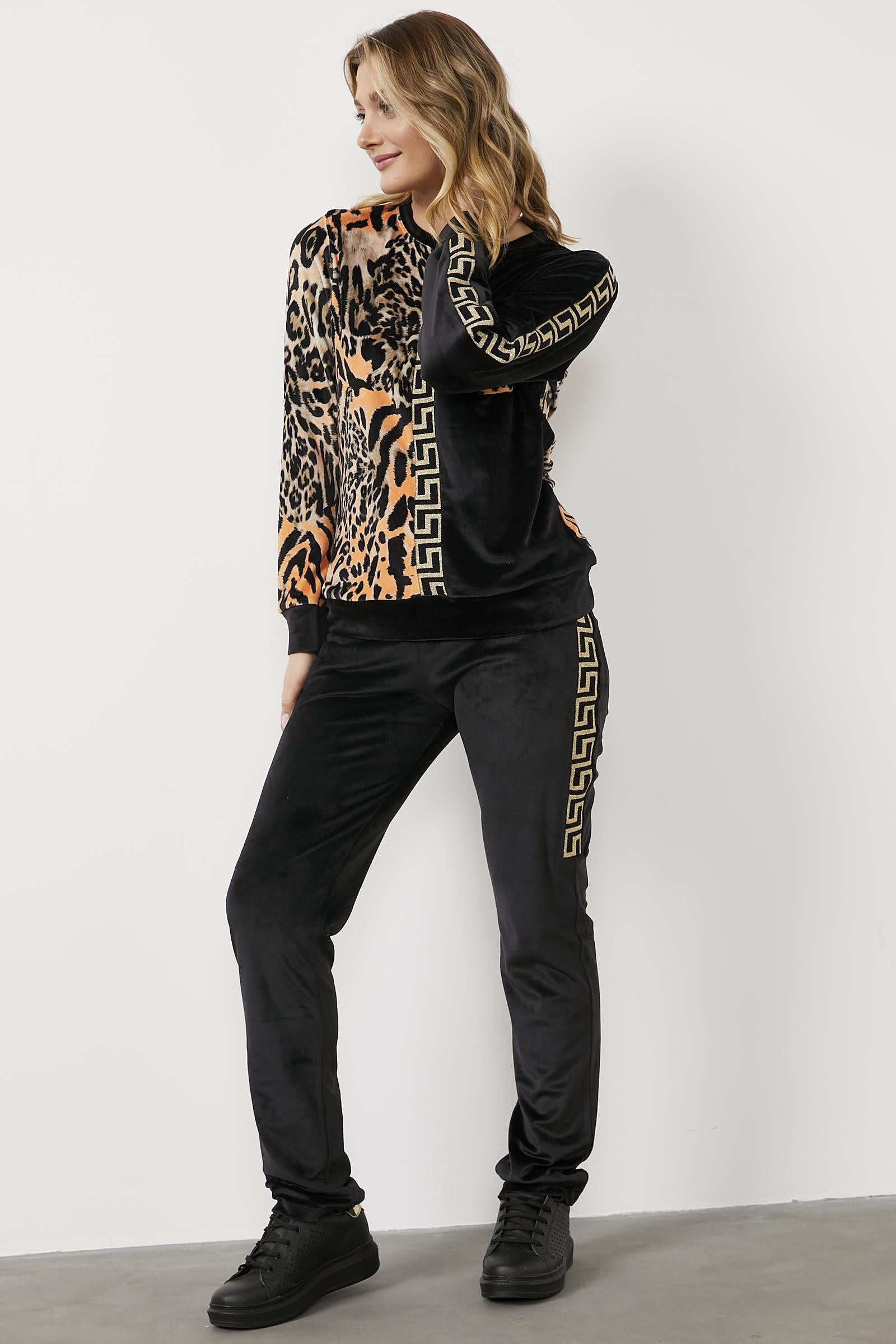 Yumuşak dokulu kadife kumaştan üretilen, sıfır yaka, uzun kollu, leopar desenli sweatshirt ve beli büzgü bağlamalı, boru paça alttan oluşan takımın konforunu hissedin.