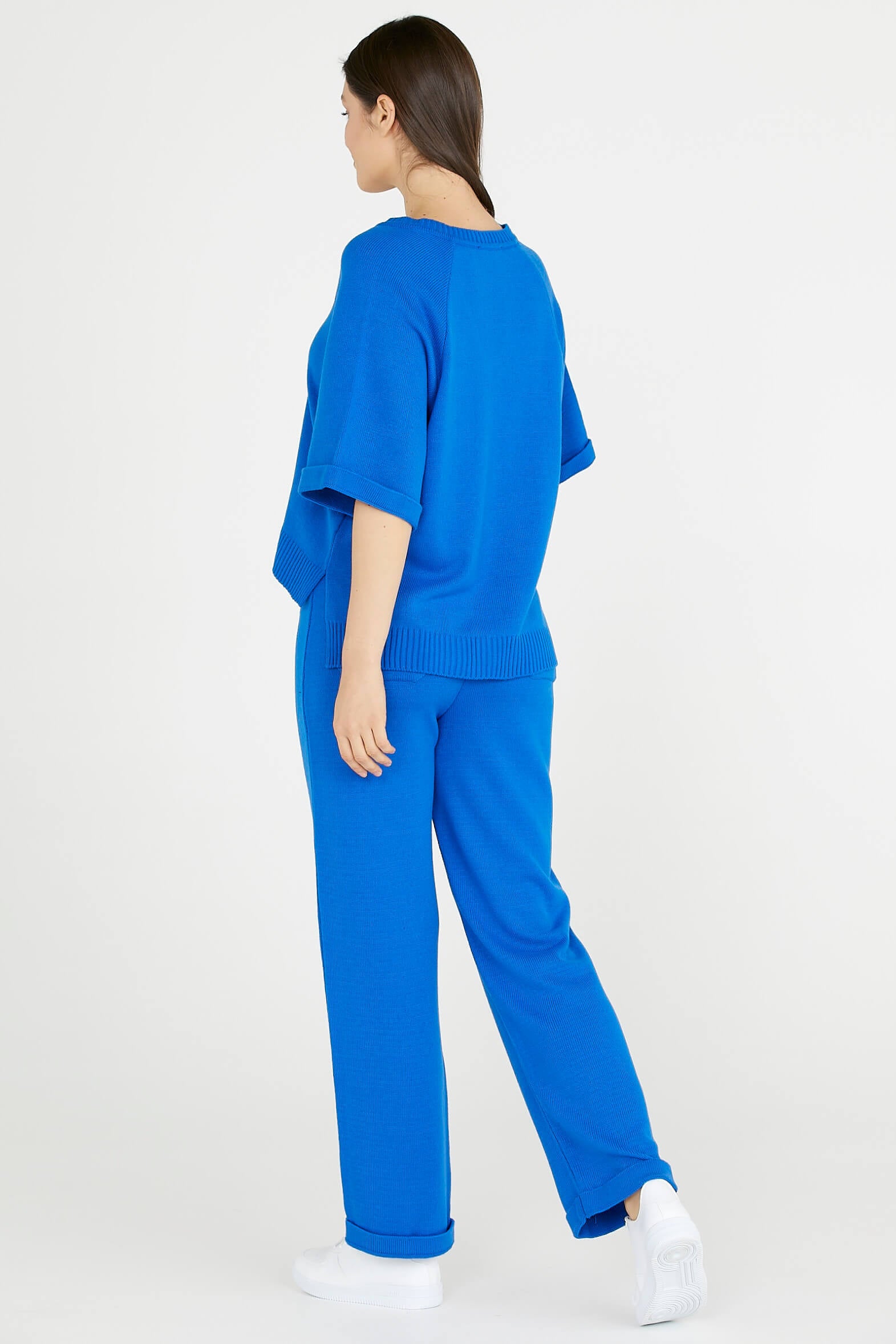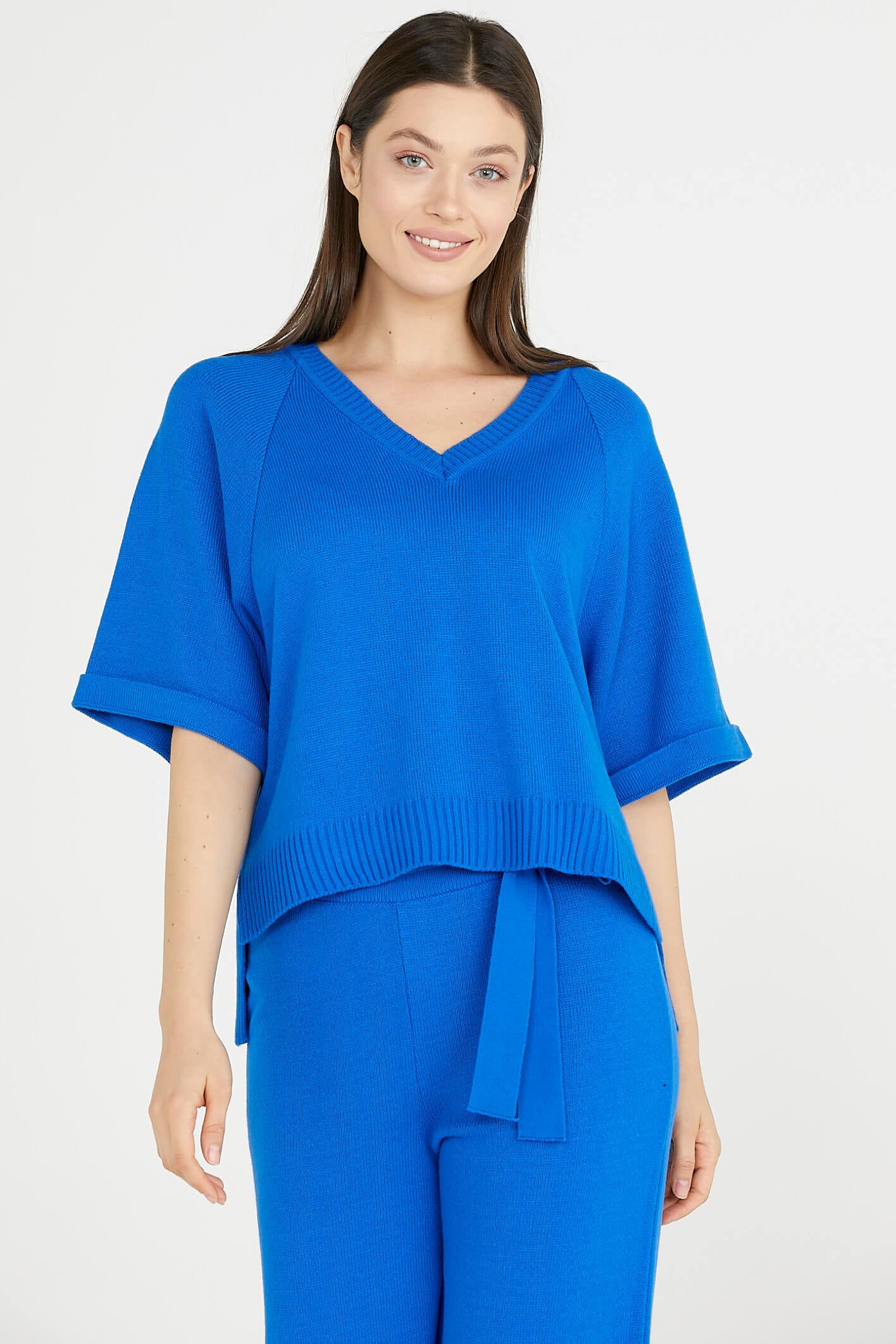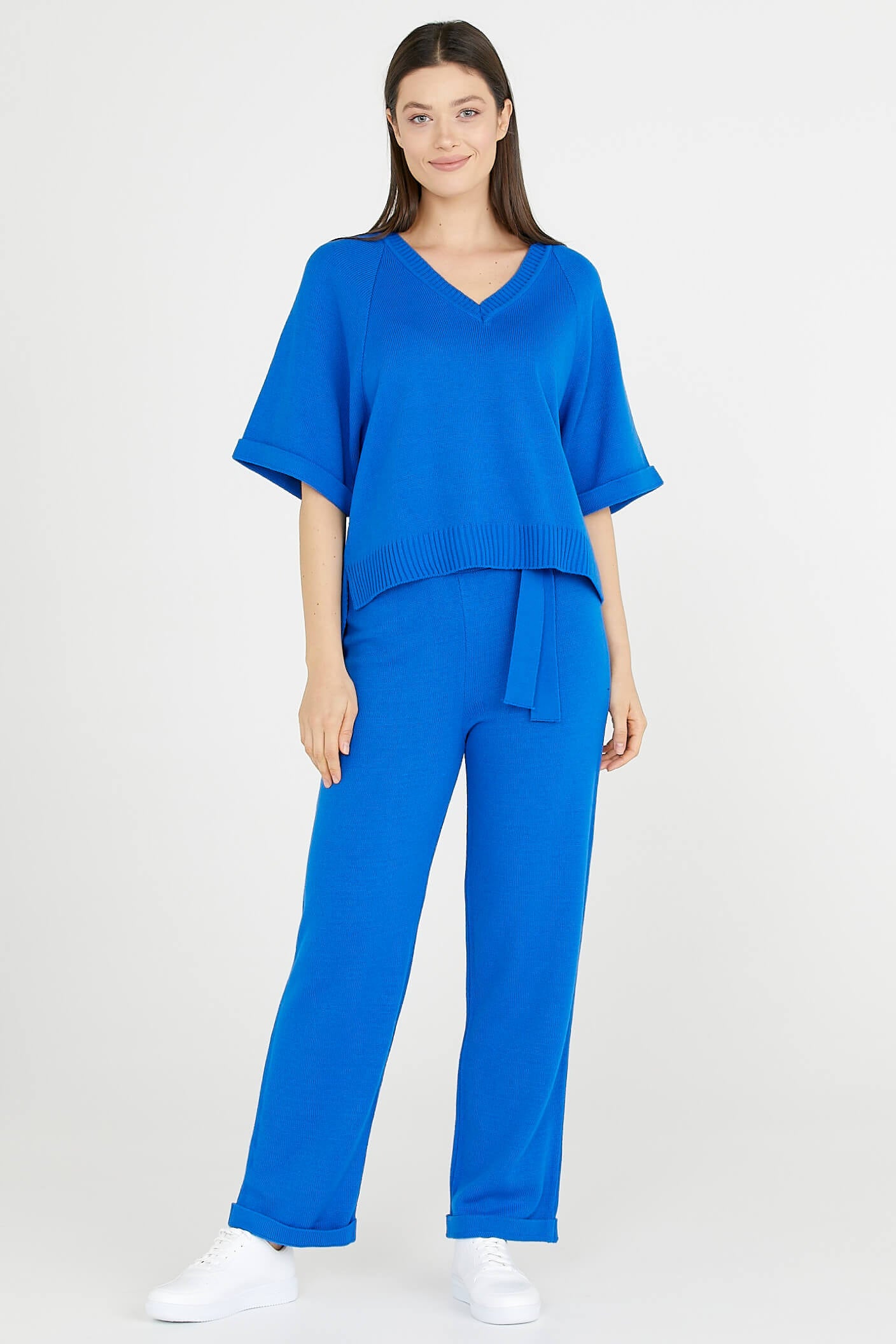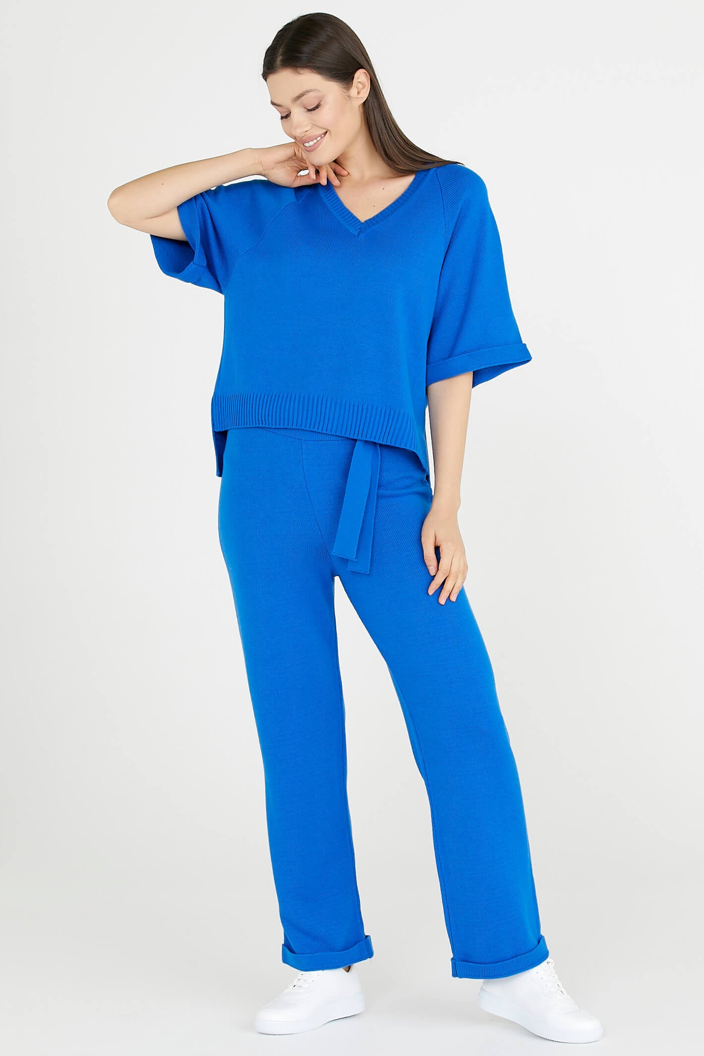 V yaka, yarım kollu, yanları yırtmaçlı kazak ve düz paça, beli kuşak detaylı pantolondan oluşan bu triko takım ile siz de etkileyici görünümler yaratın.