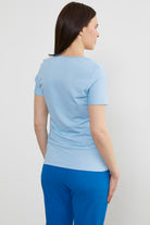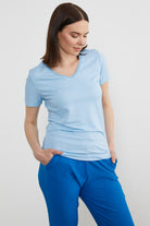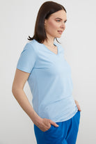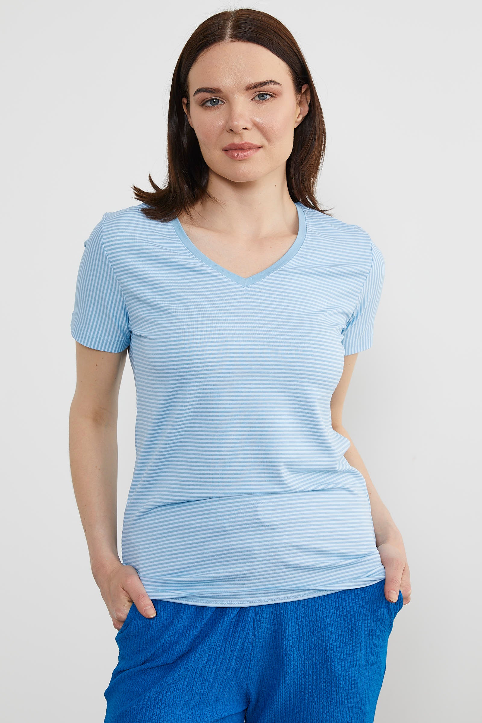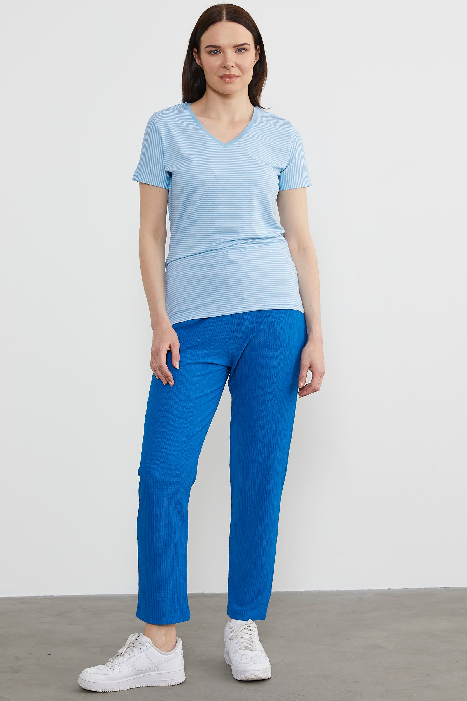V Yaka Biye Detaylı Çizgili Tişört - Mavi