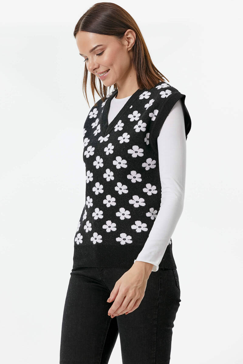 V Yaka Çiçek Motifli Triko Süveter - Siyah
