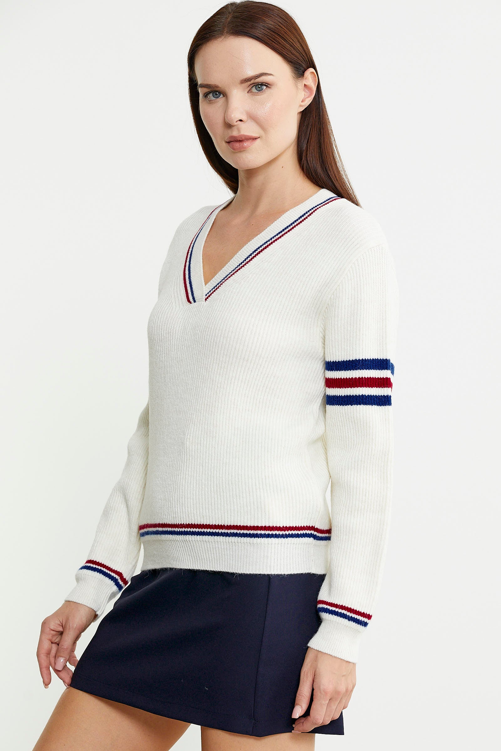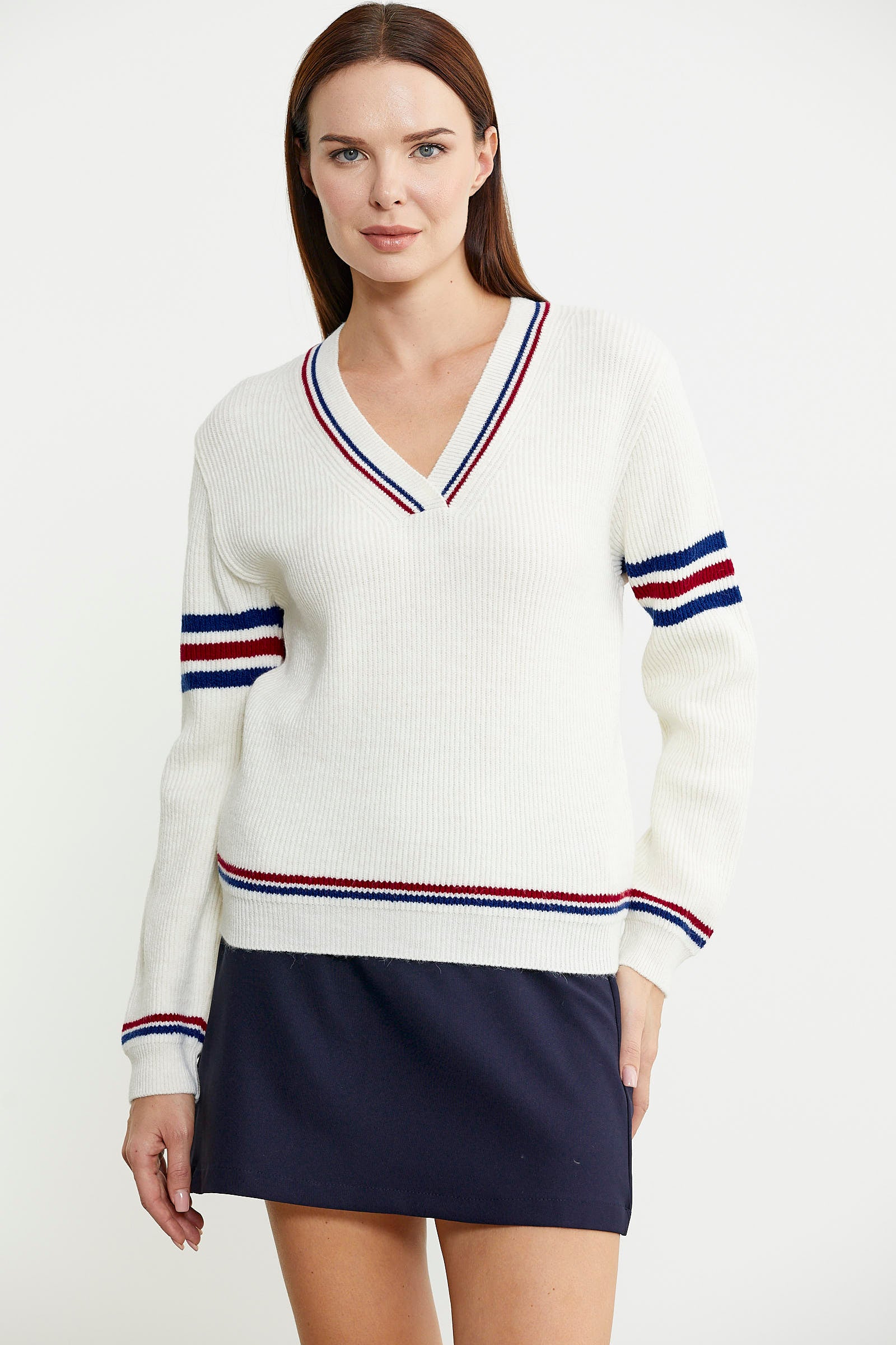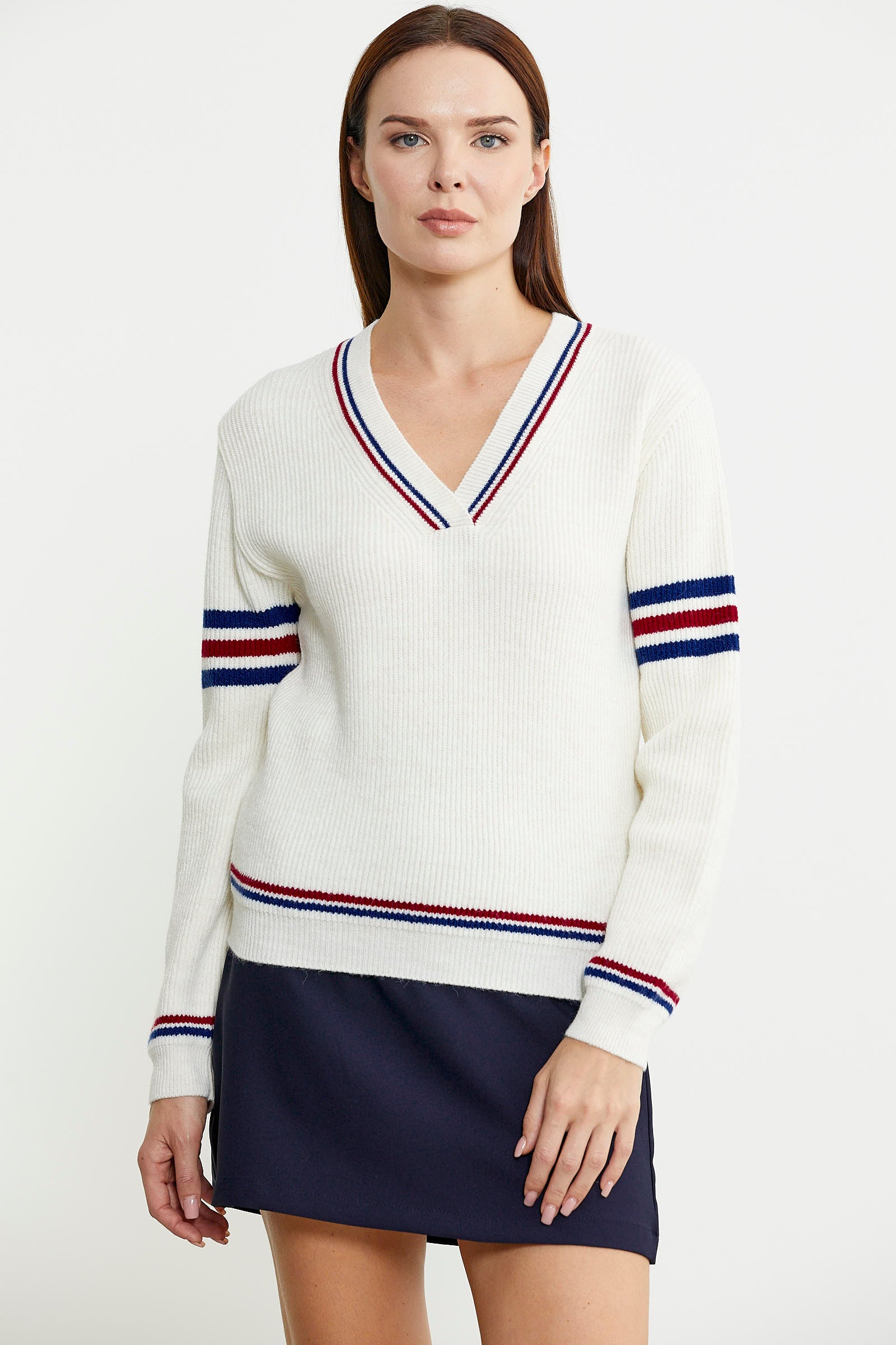 Basic V yaka triko kazak modelinde yaka, kol ve etek ucunda kullanılan farklı renk ince çizgi detaylarıyla modern görünüm sağlanmıştır.