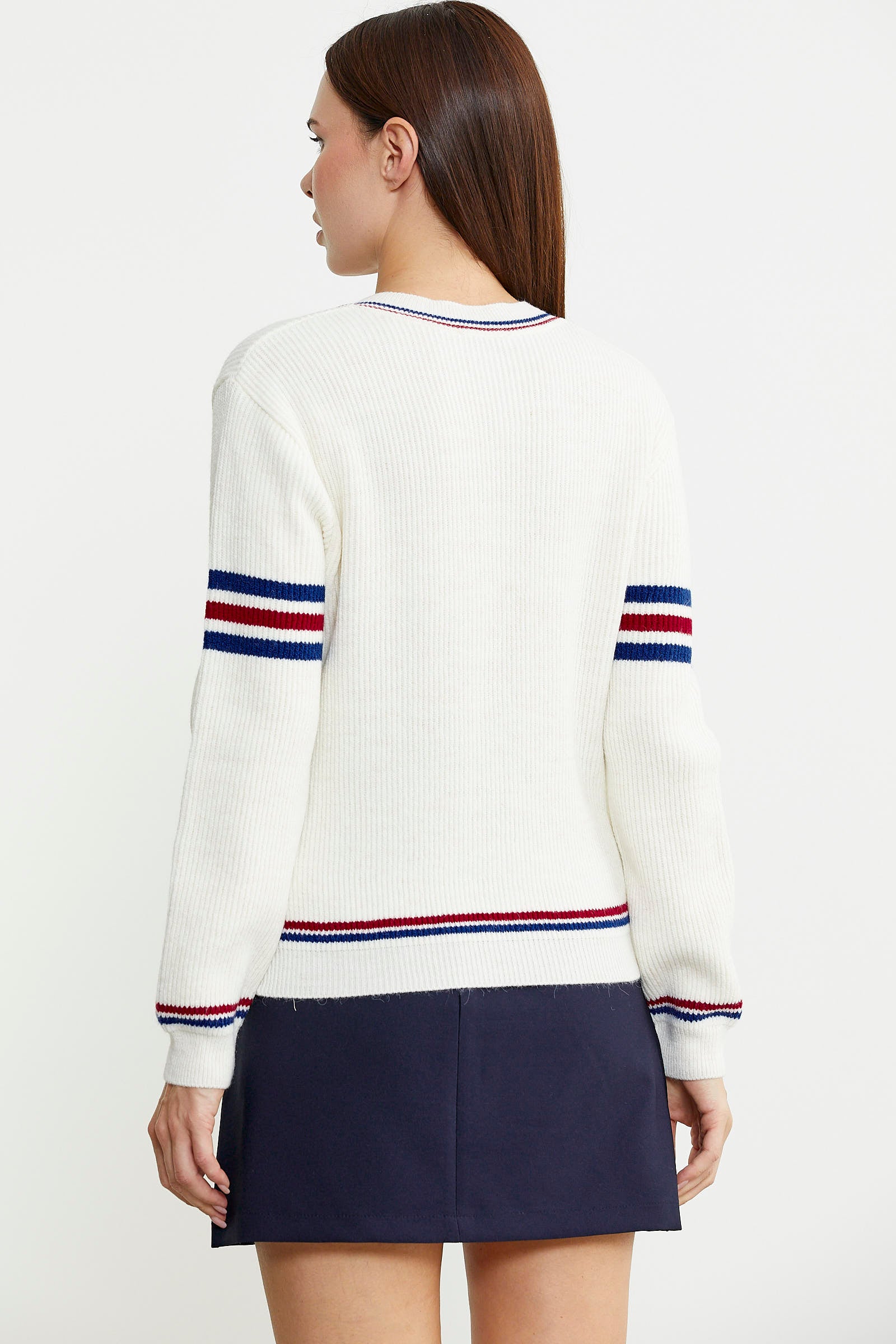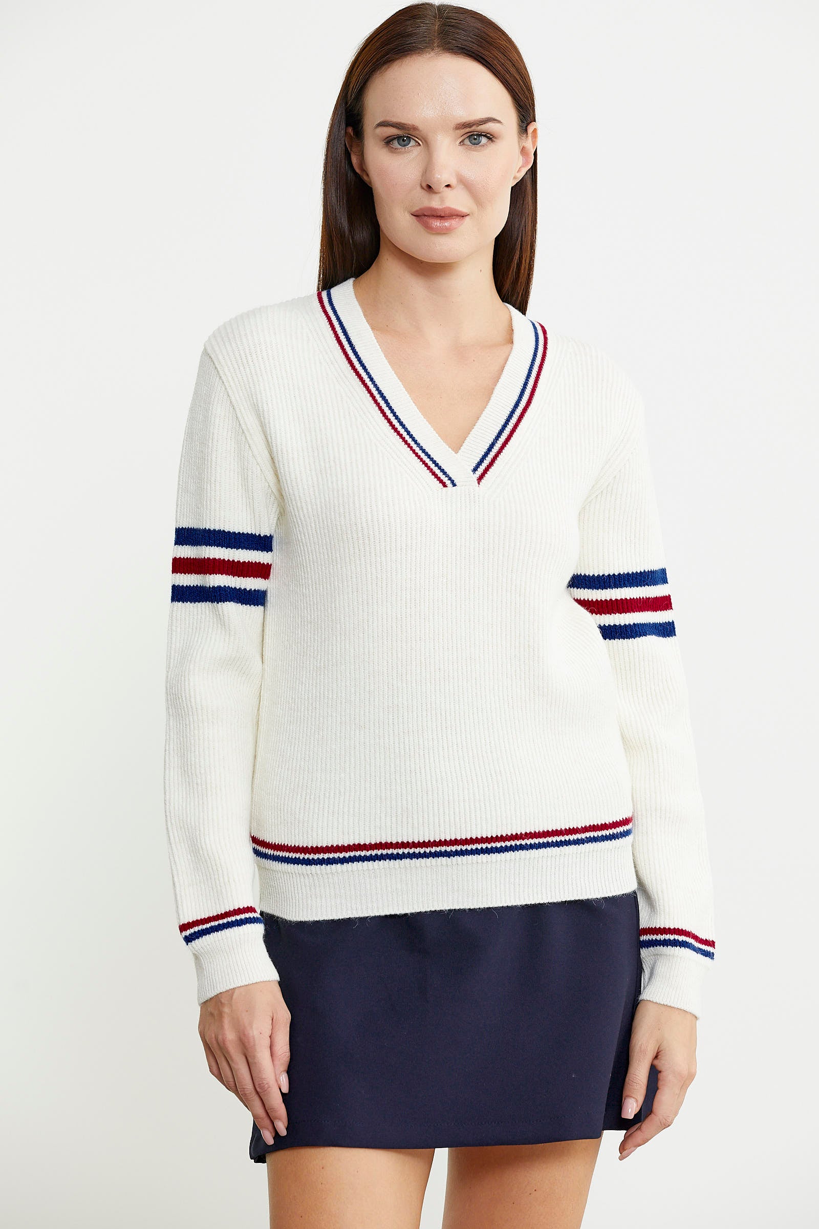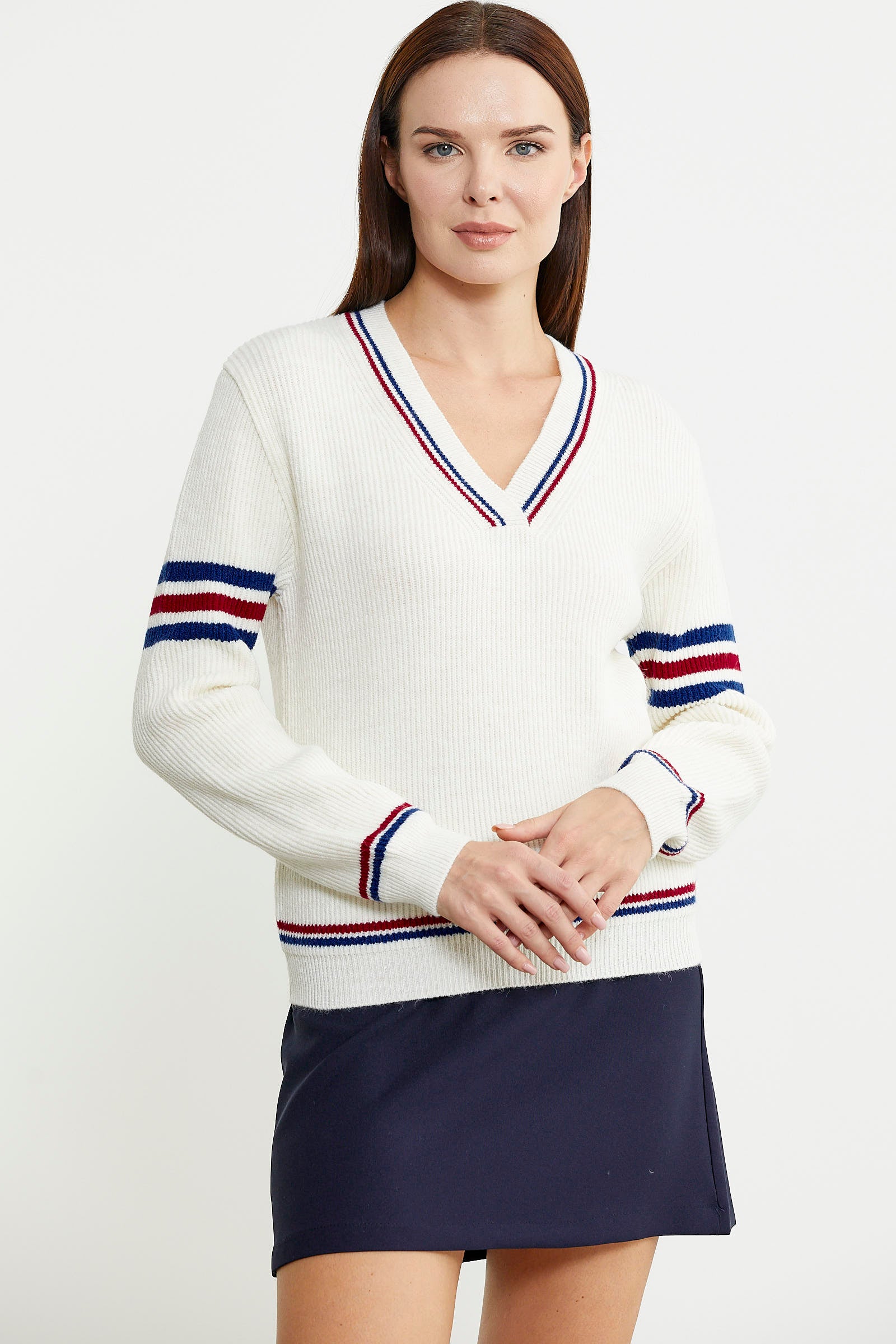 Basic V yaka triko kazak modelinde yaka, kol ve etek ucunda kullanılan farklı renk ince çizgi detaylarıyla modern görünüm sağlanmıştır.