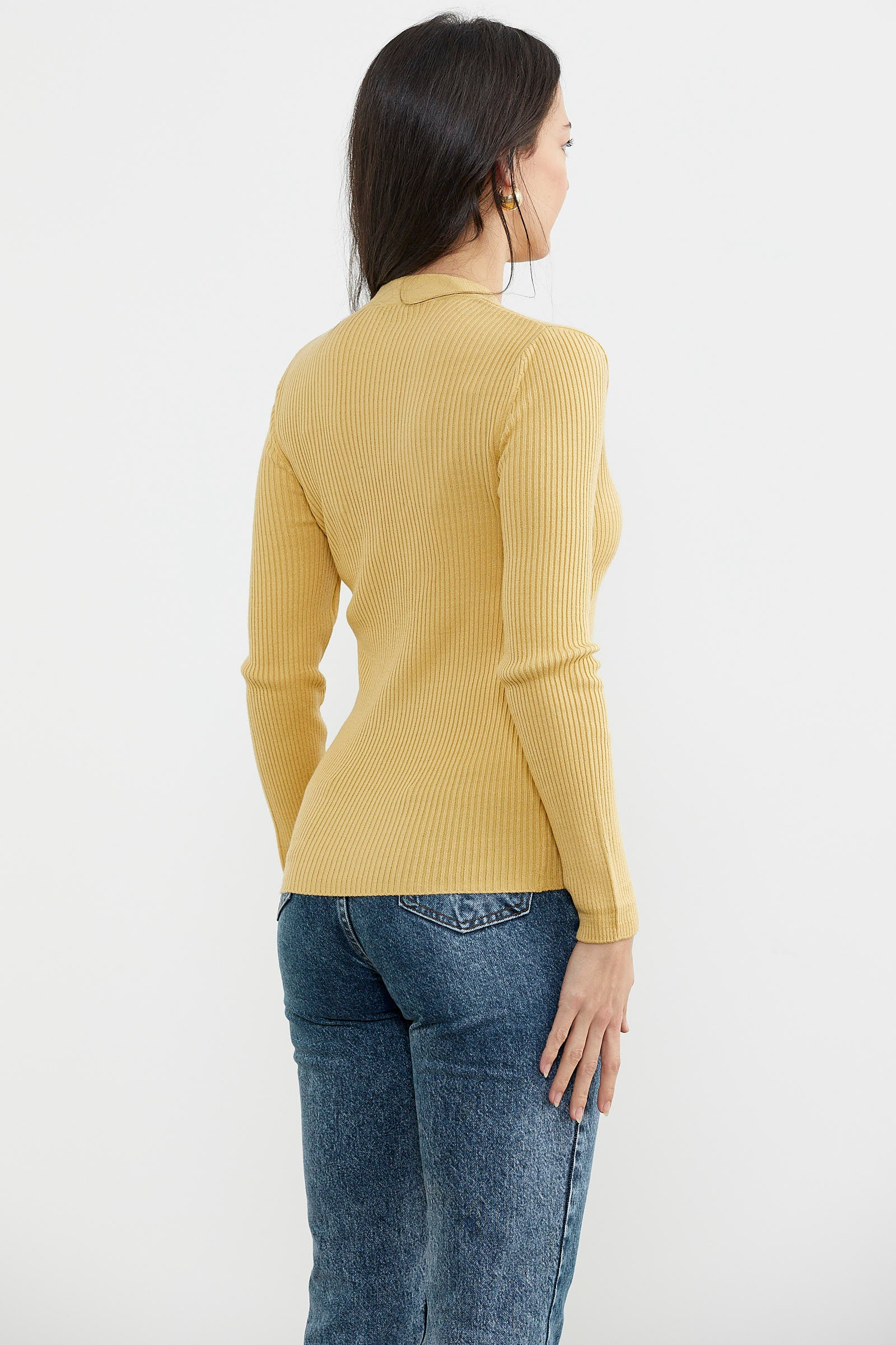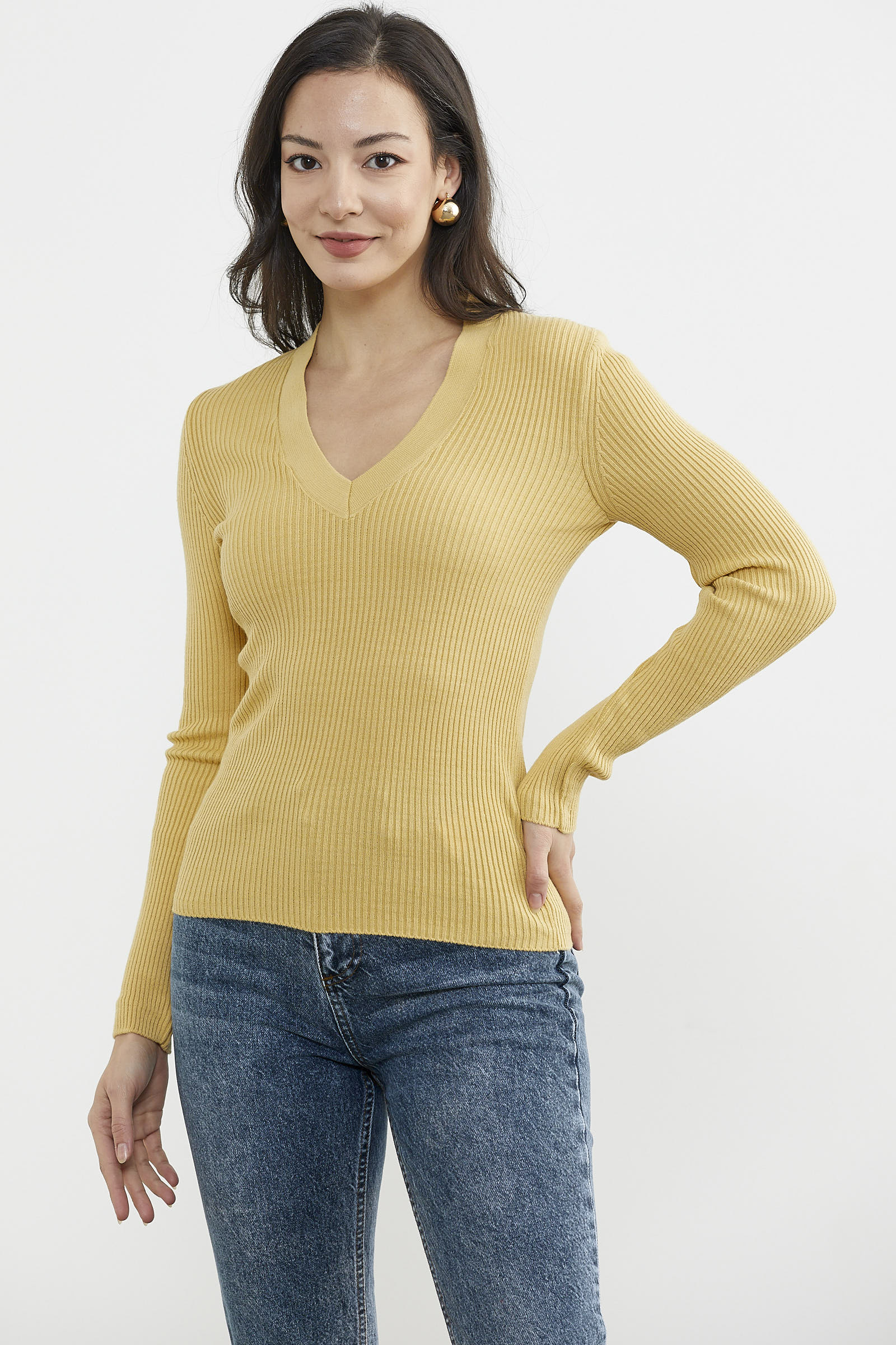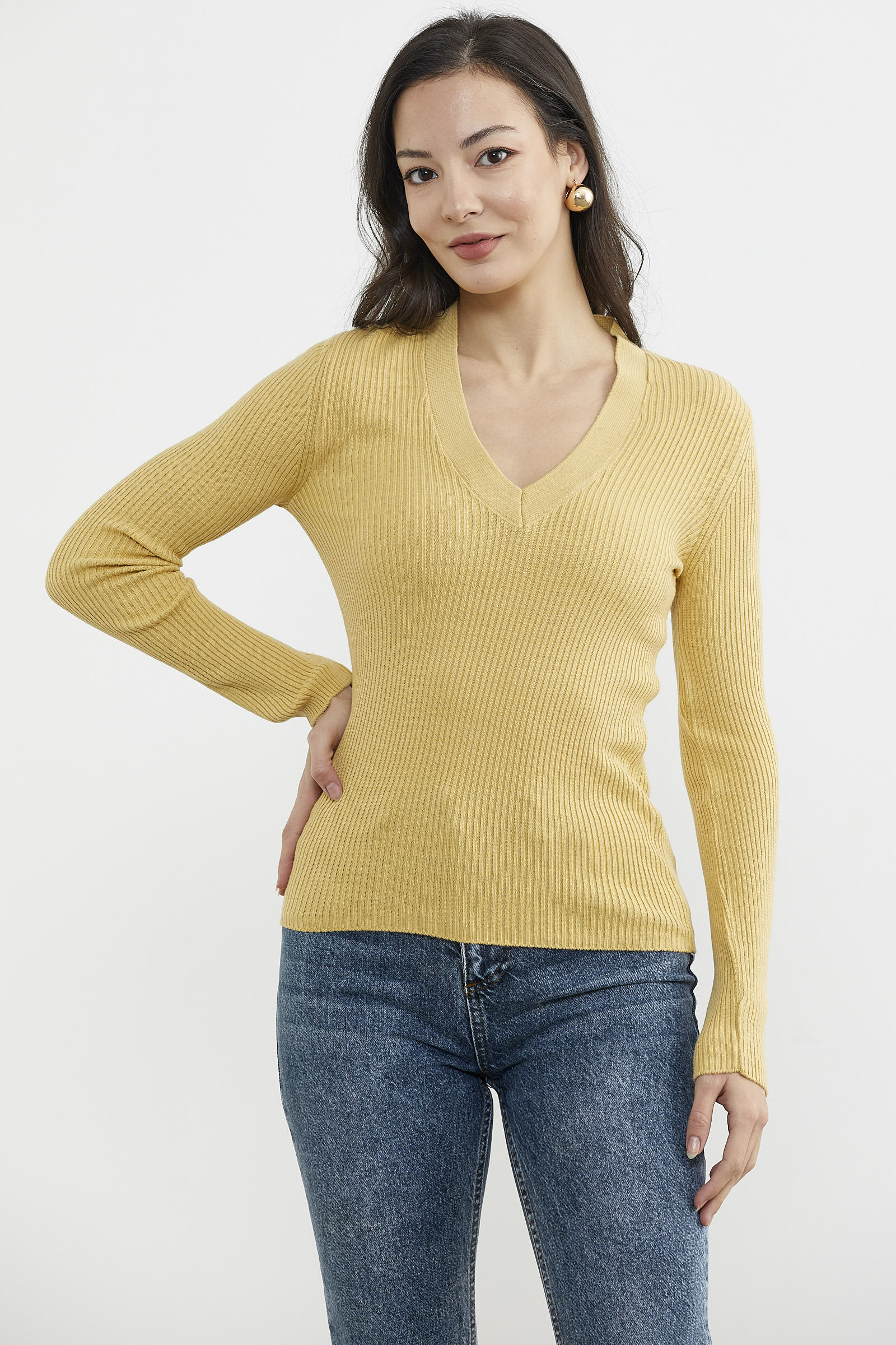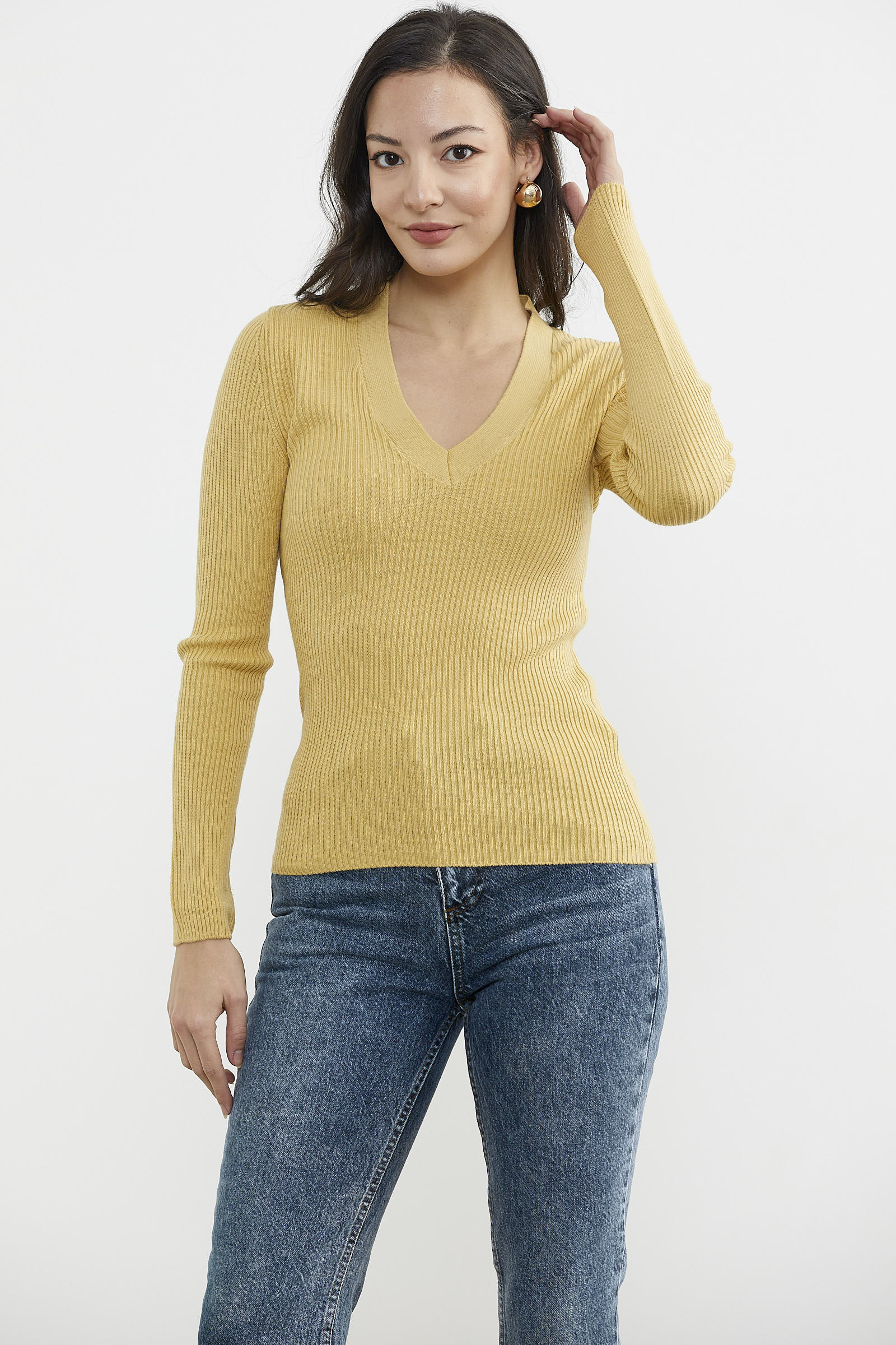 V Yaka Derbili Basic Triko Kazak - Sarı
