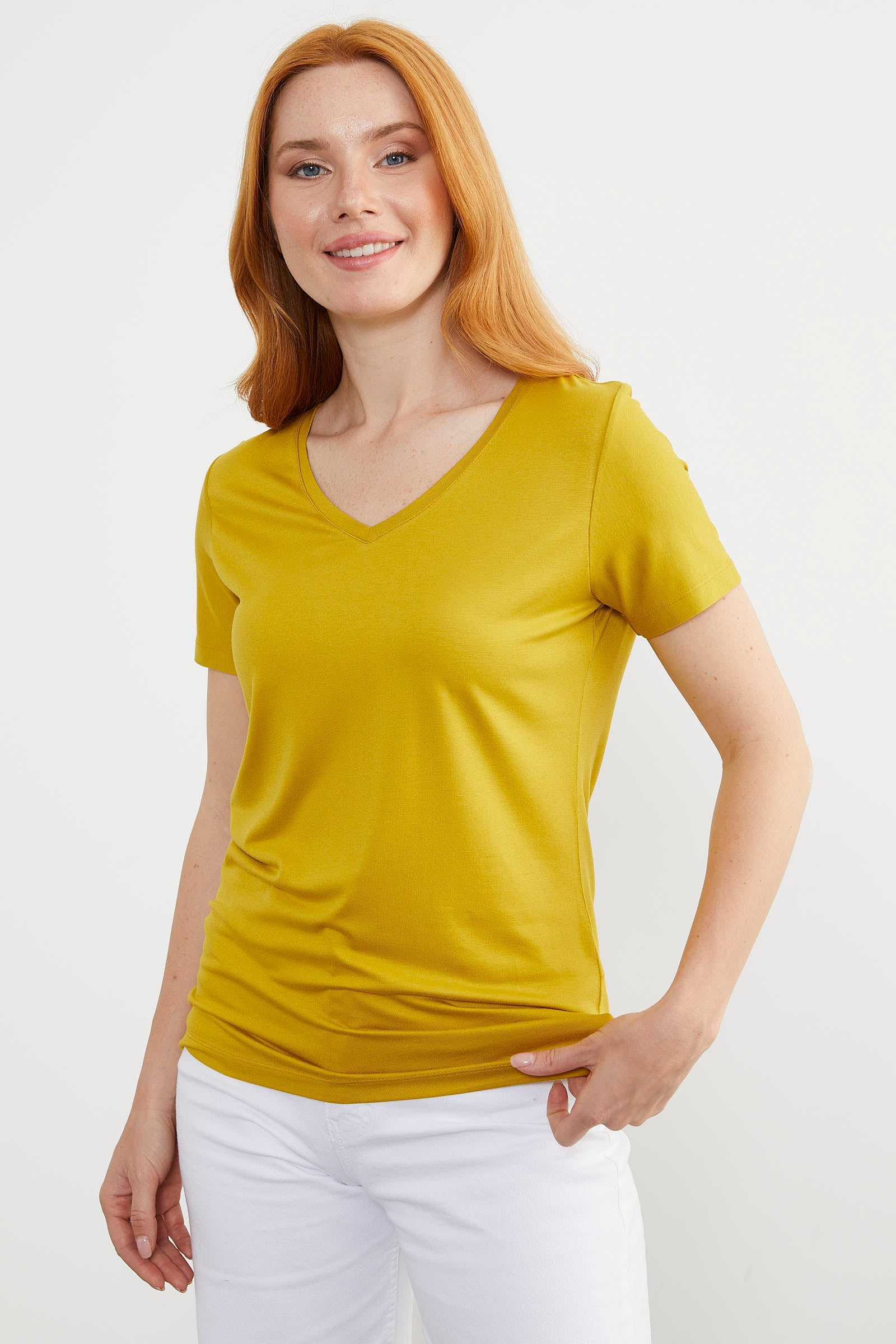 Yaz mevsiminde gardıroplarınızın kurtarıcı parçası; V yaka, kısa kollu, dökümlü ve rahat basic tişört.