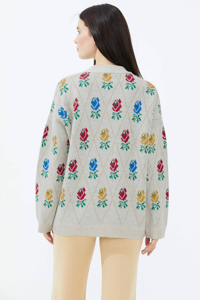 V Yaka Düğmeli Gül Desenli Triko Hırka - Açık Bej