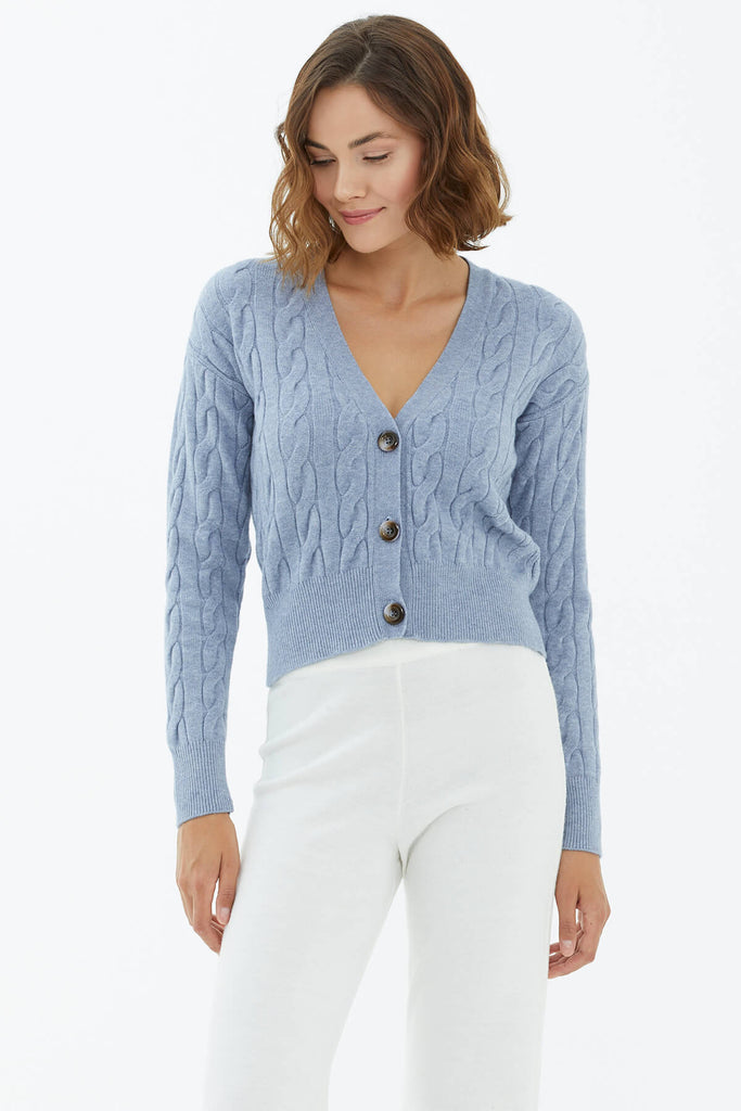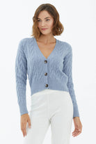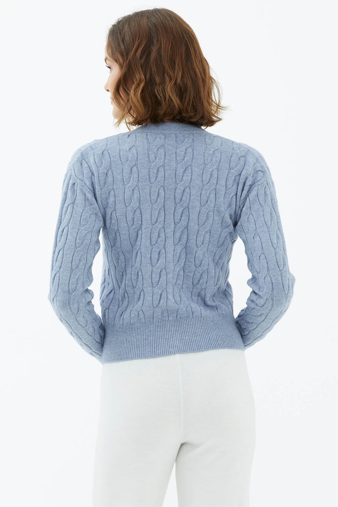 V Yaka Düğmeli Saç Örgülü Triko Hırka - Mavi