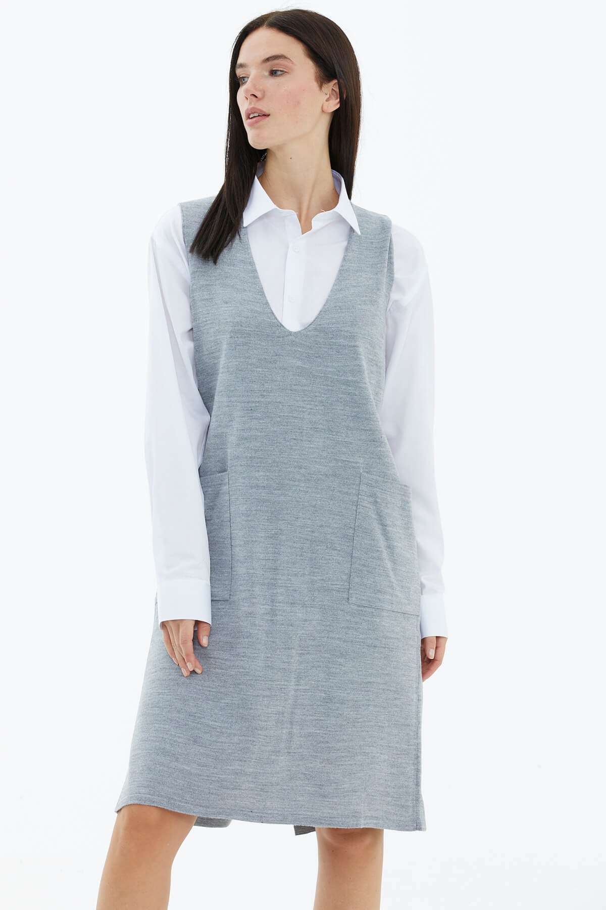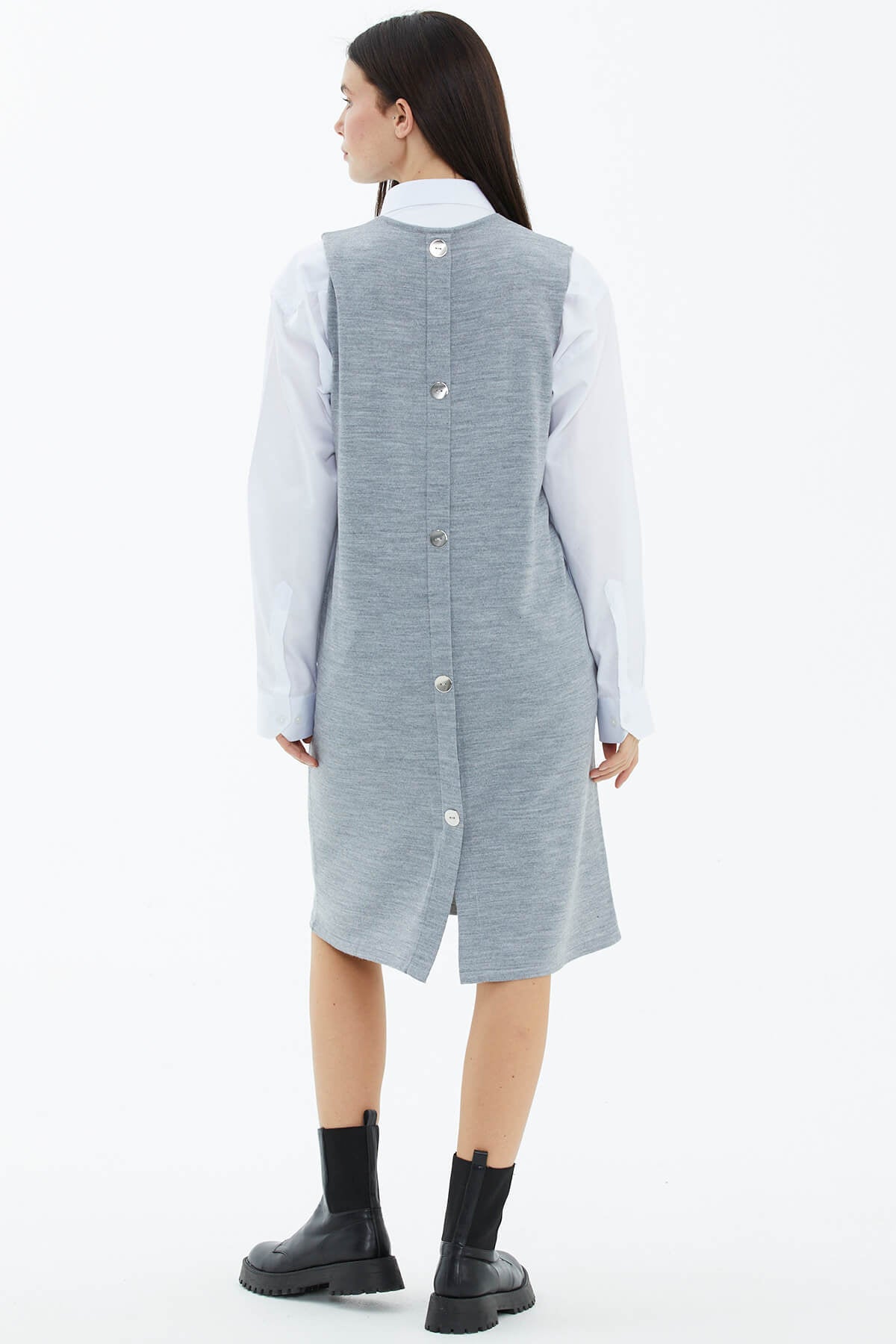 V yaka triko elbise ile gündelik yaşamınıza yön verin! İster basic tişörtler ile isterseniz de gömlek ile kombinlenebilir. Sırt kısmı düğme aksesuarlı olan triko elbiseye dolabınızda yer açın.