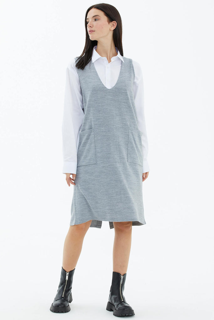 V Yaka Kolsuz Arkası Düğmeli Triko Elbise - Gri
