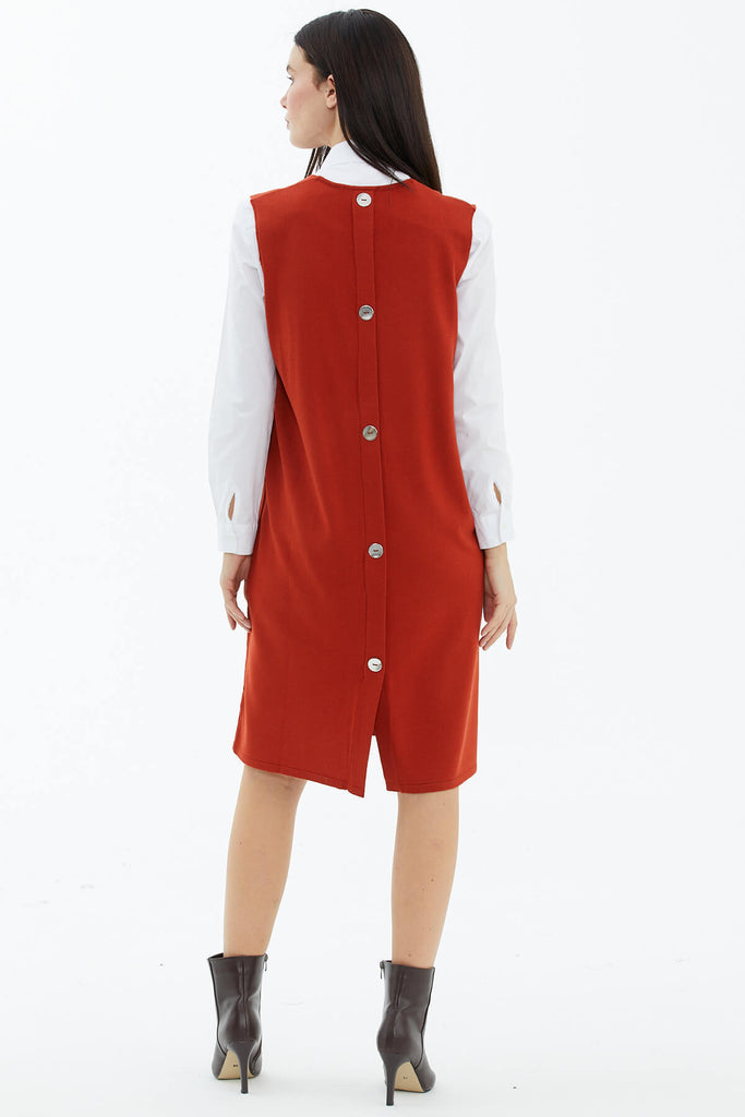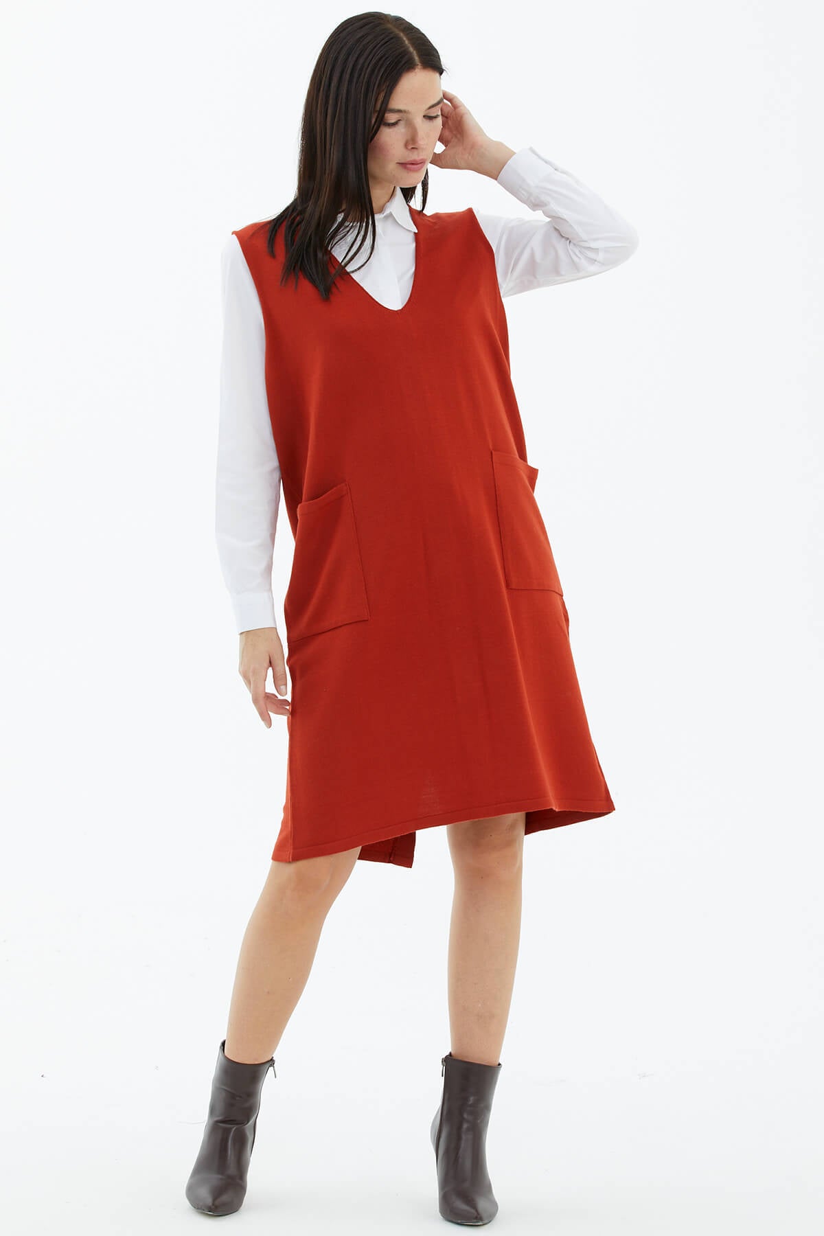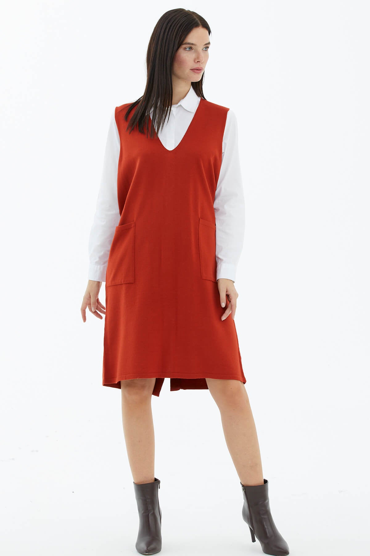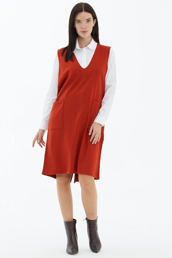 V yaka triko elbise ile gündelik yaşamınıza yön verin! İster basic tişörtler ile isterseniz de gömlek ile kombinlenebilir. Sırt kısmı düğme aksesuarlı olan triko elbiseye dolabınızda yer açın.