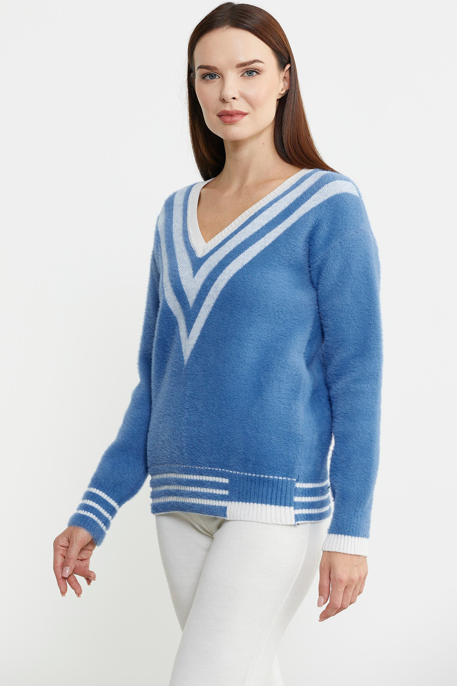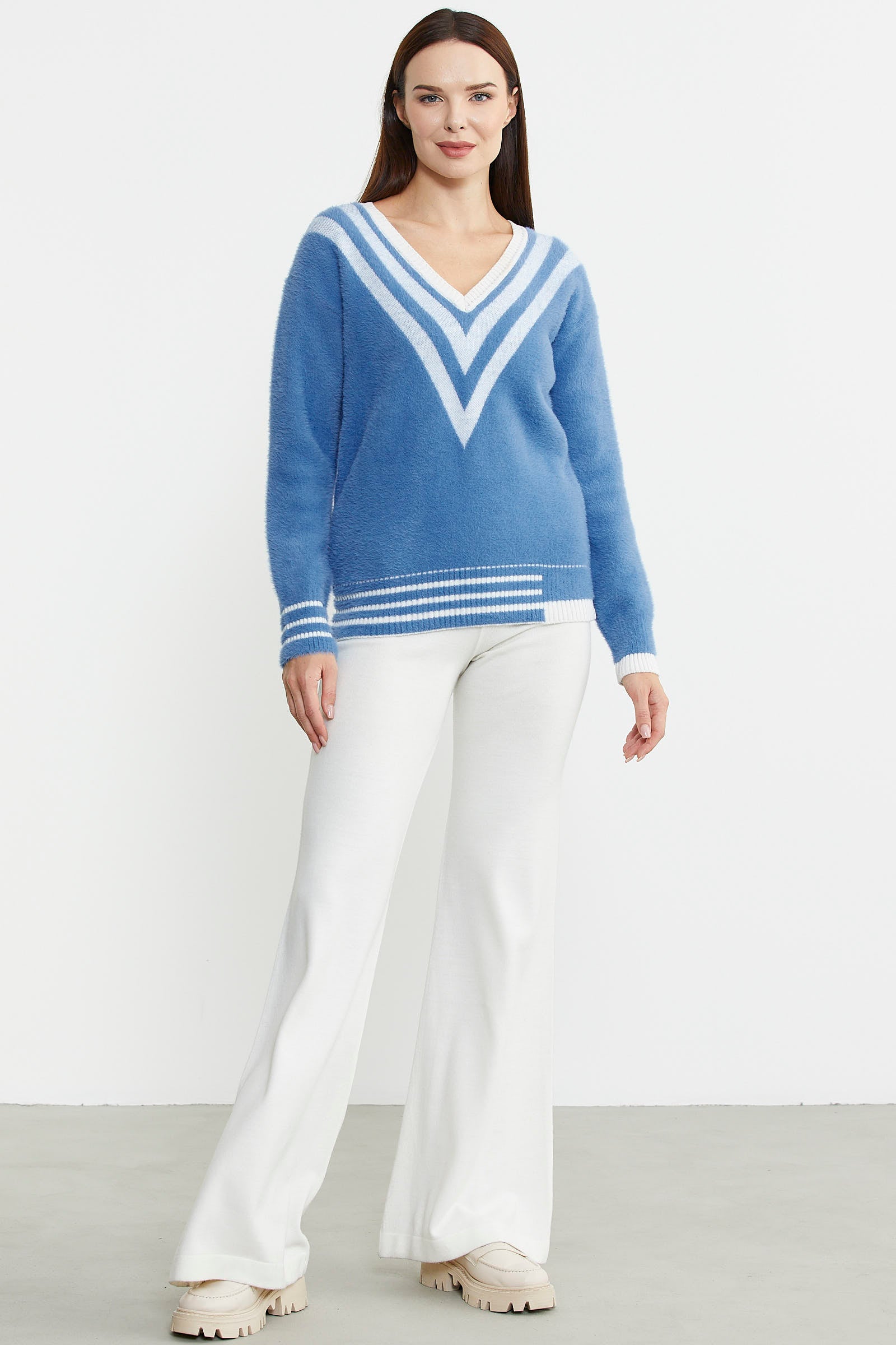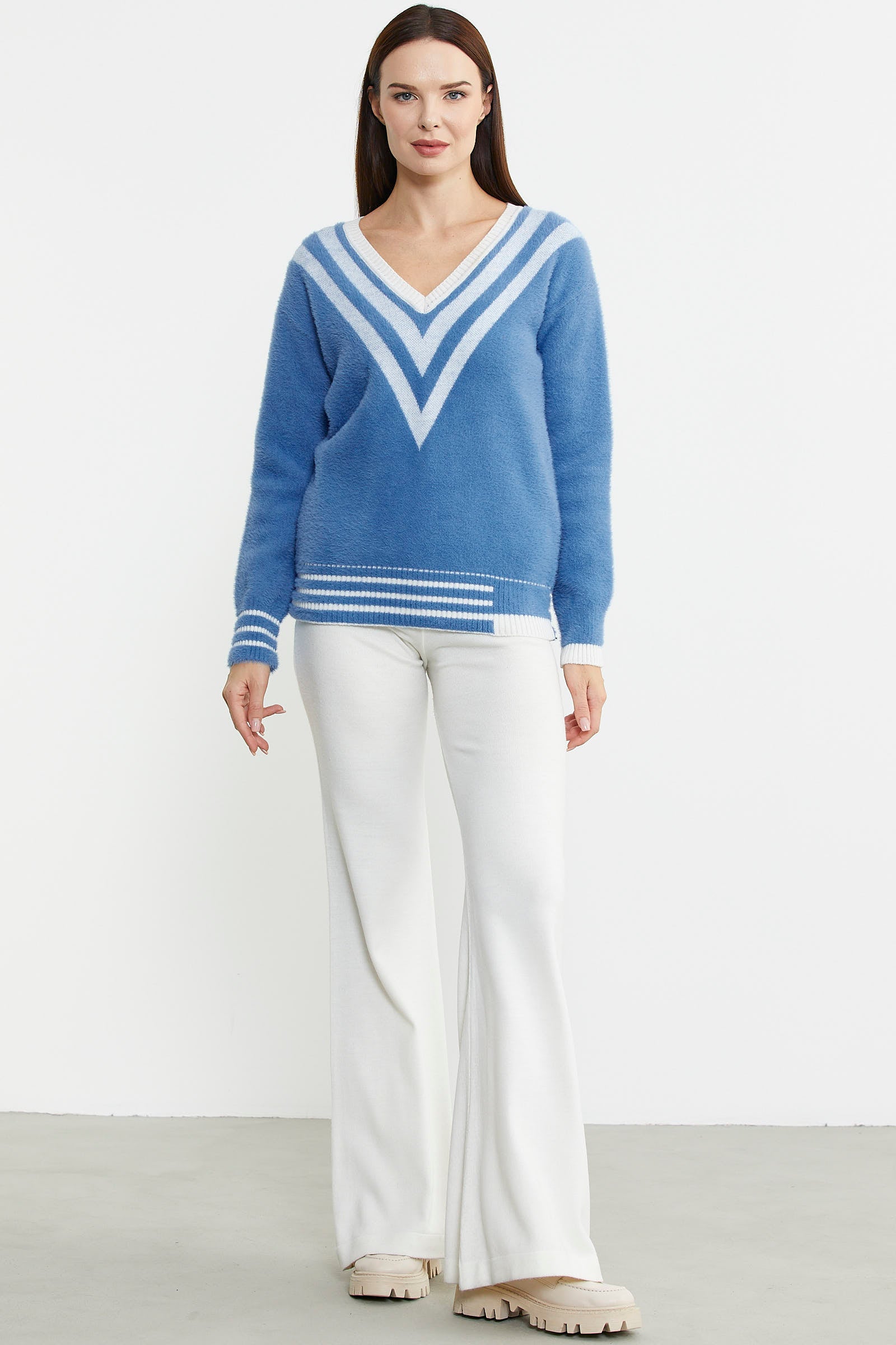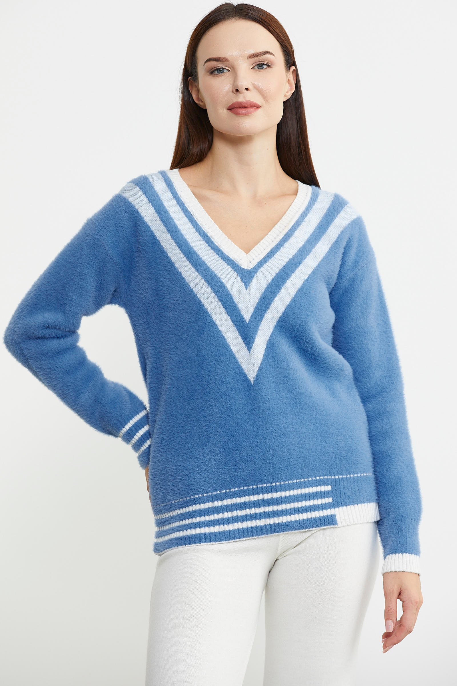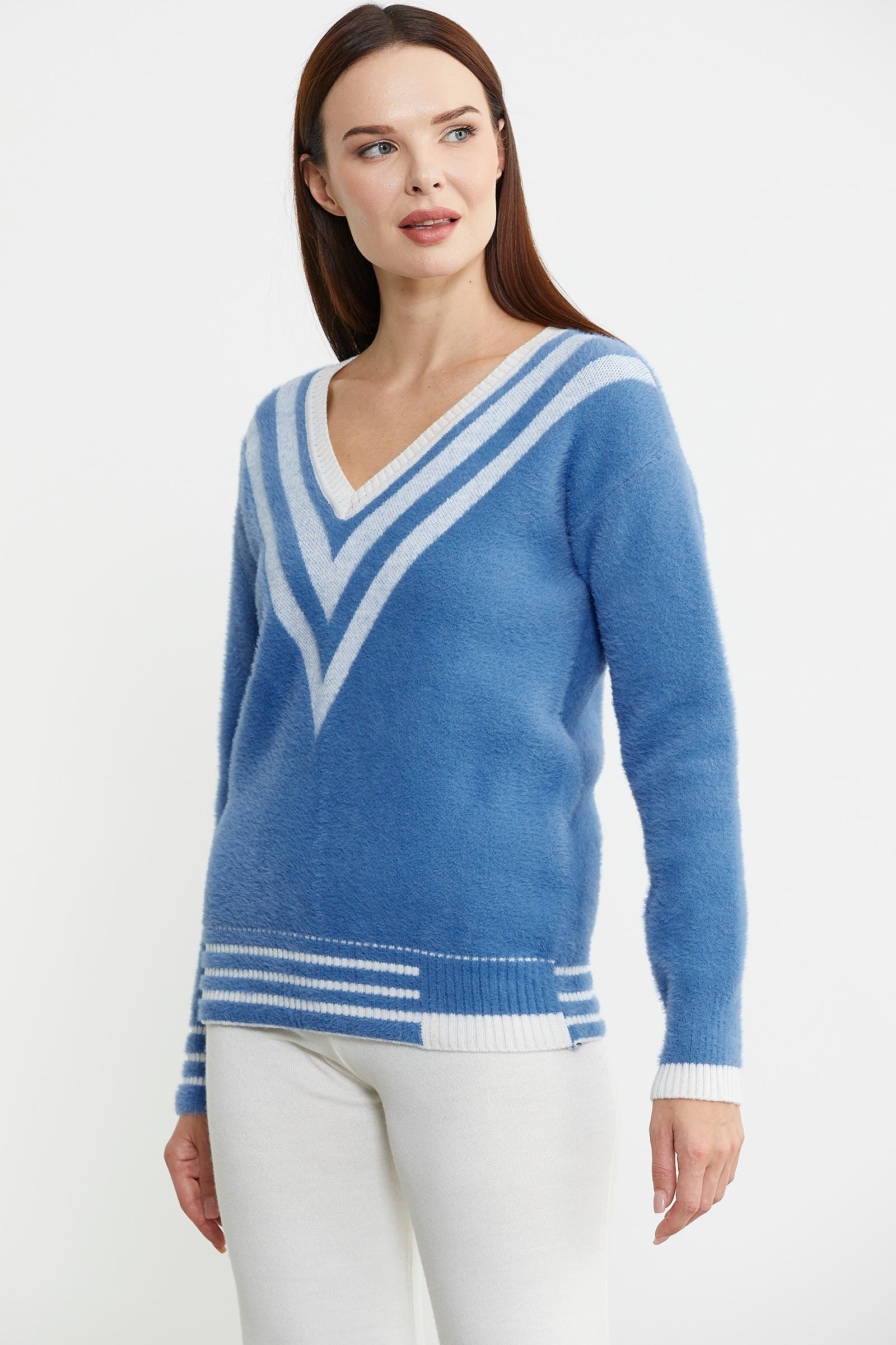 V Yaka Renk Kombinli Triko Kazak - Mavi