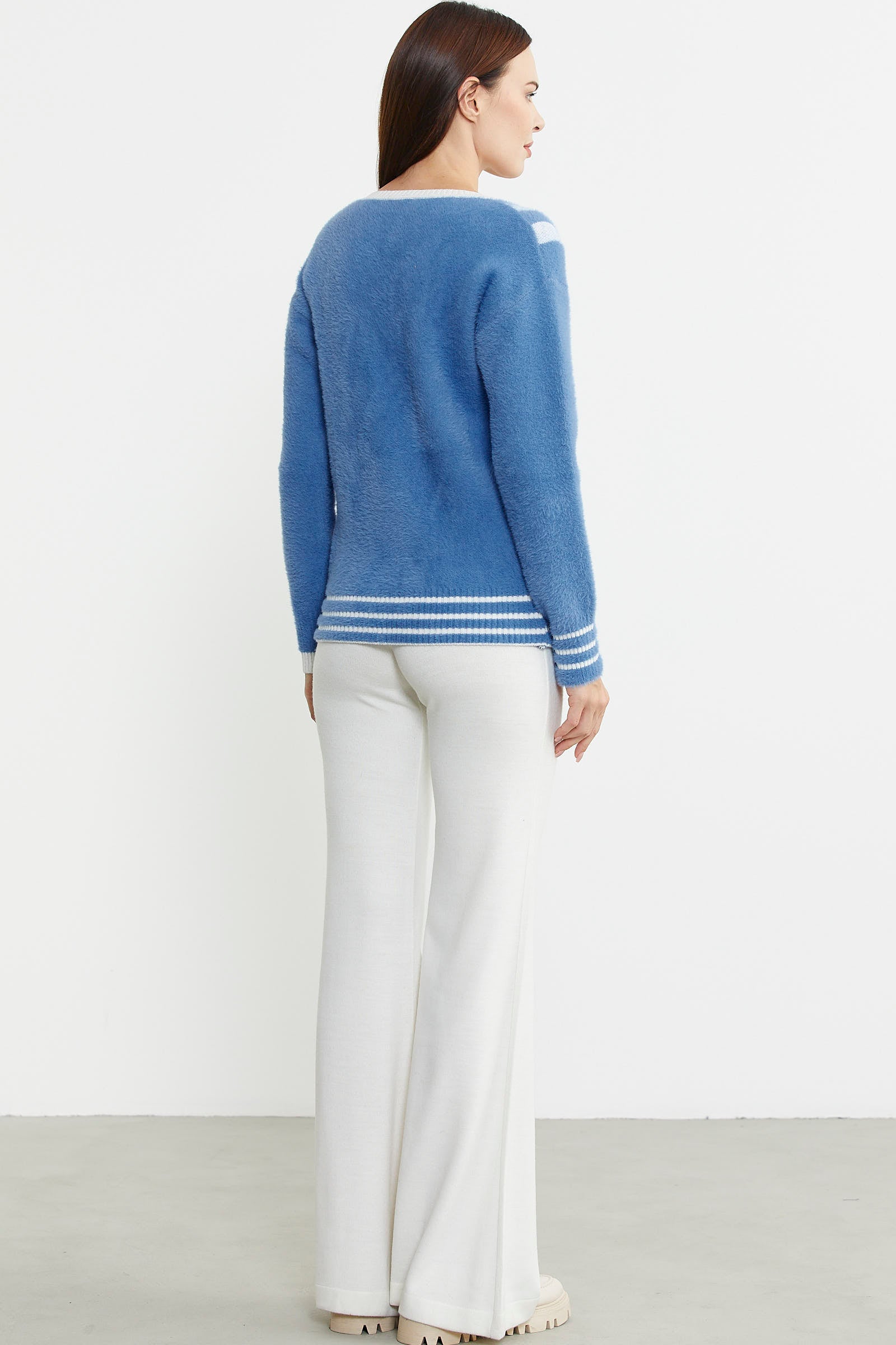 Tiftik ve yünün, sağlam ve konforlu yapısı öne çıkartılarak tasarlandı. Geniş V yaka olan triko kazak rahat kalıptır.