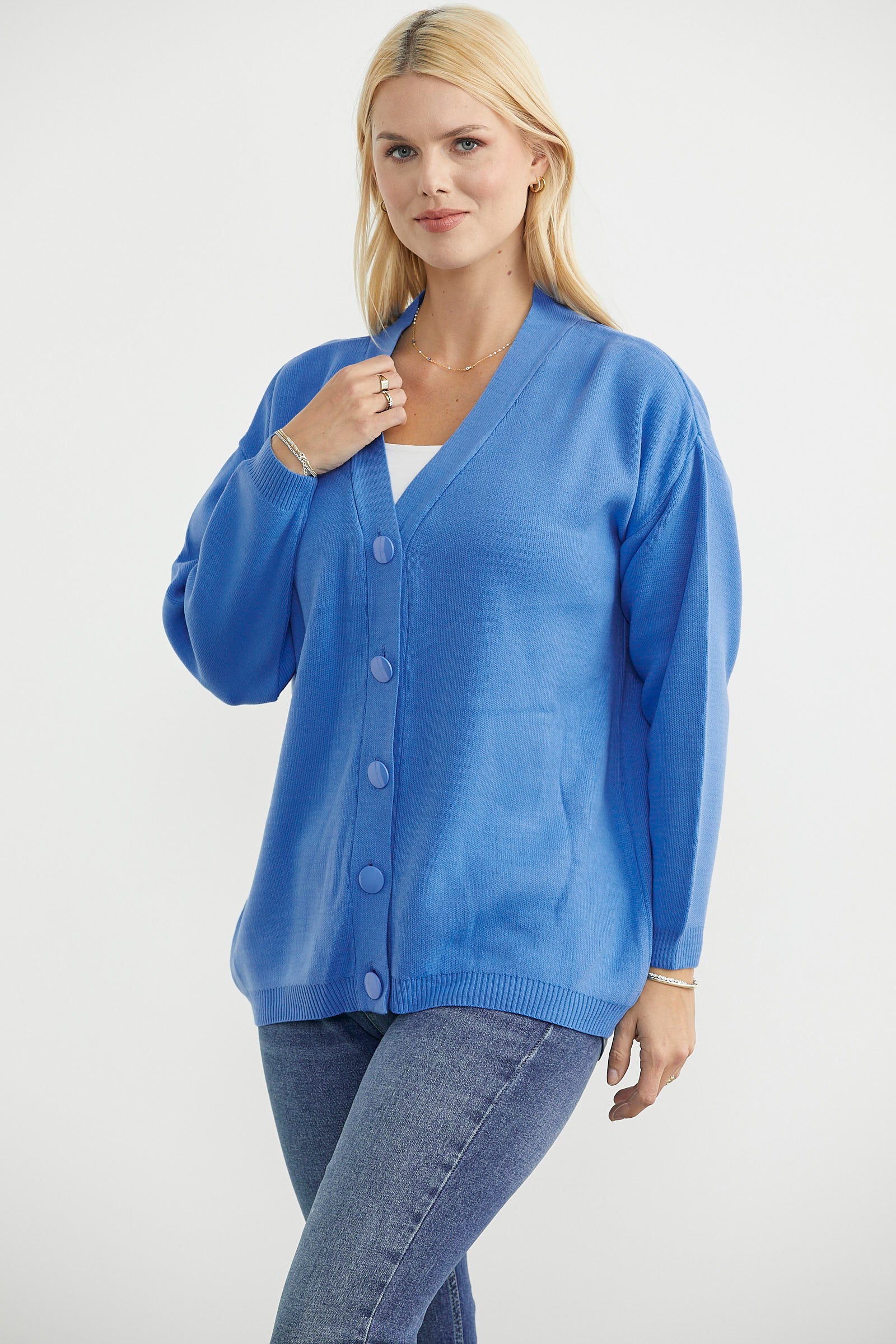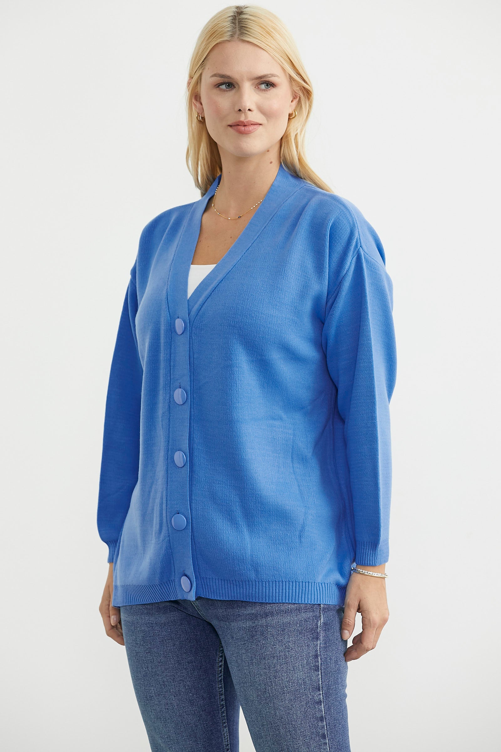 Rahat kalıp, V yaka, düğme kapamalı basic triko hırka.