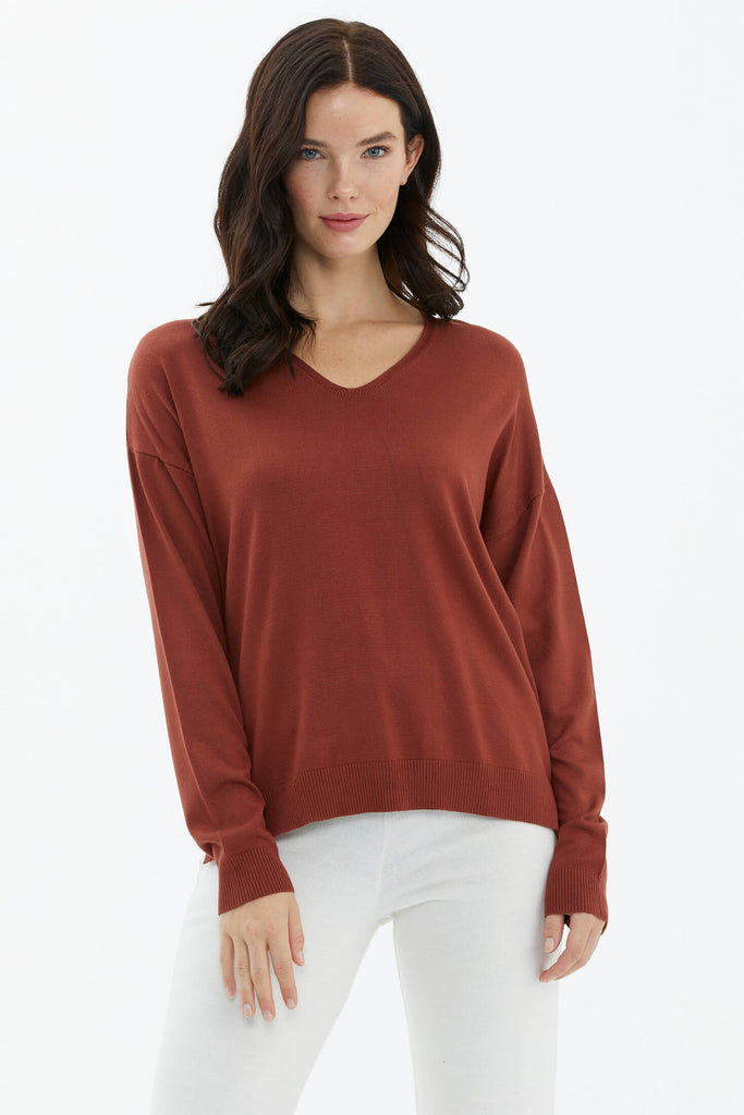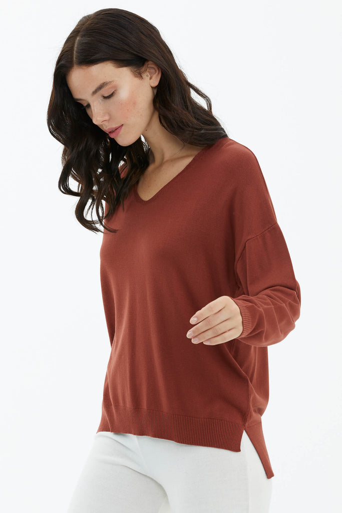 V Yaka Triko Dökümlü Kazak - Kiremit