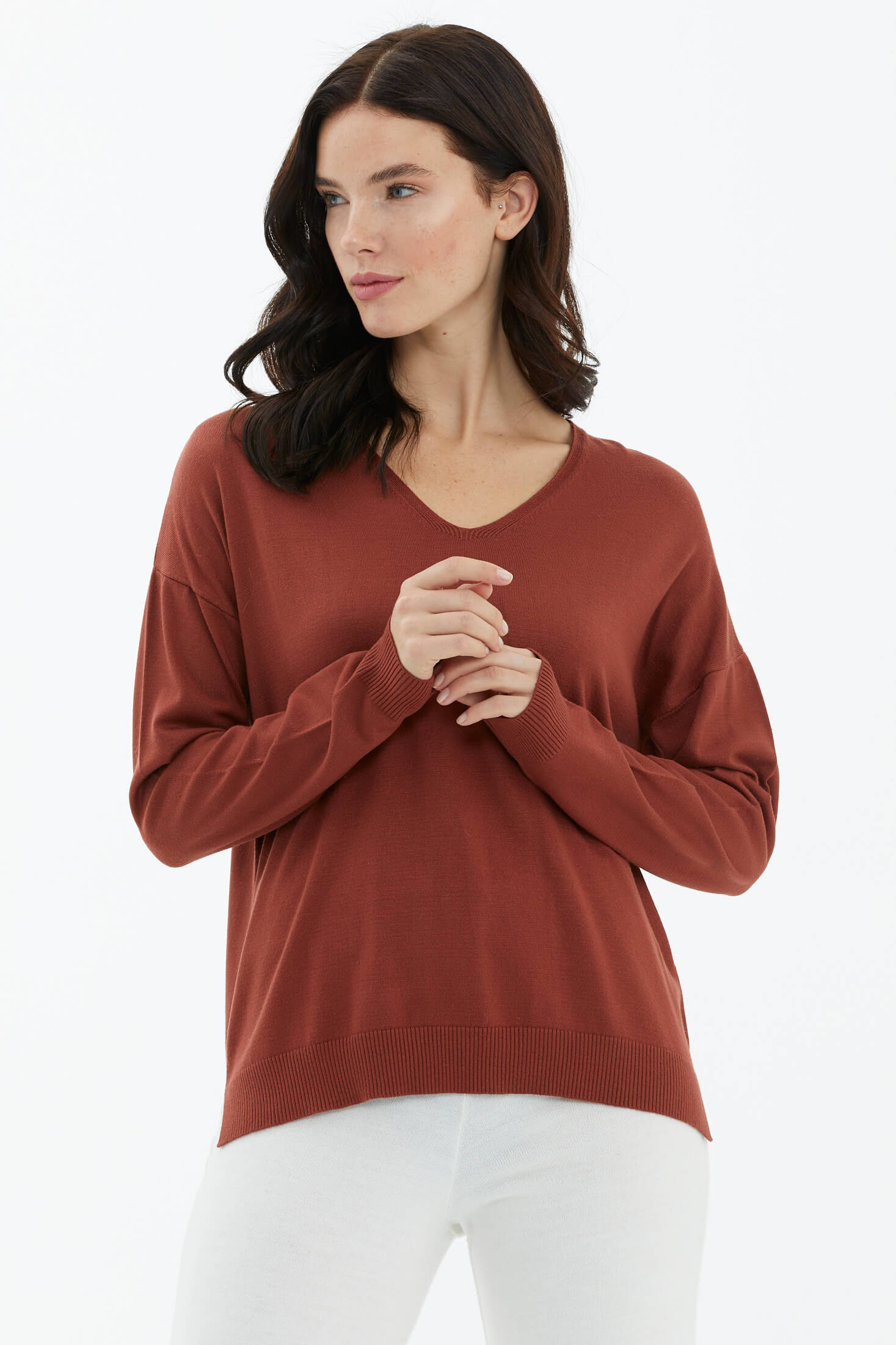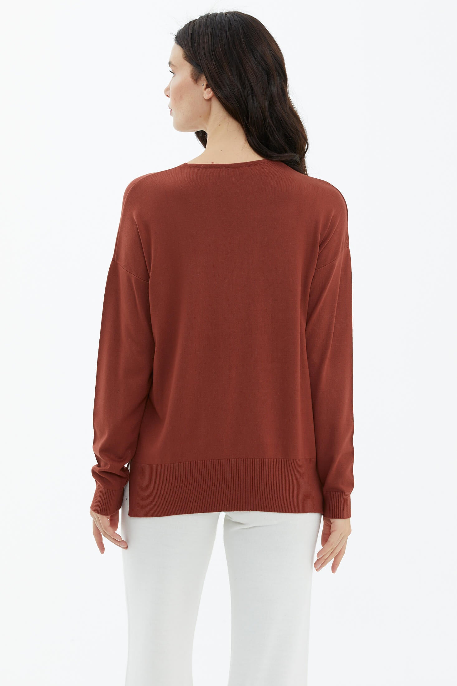 V yaka, uzun kollu, düşük omuzlu, etek ucu ve manşetleri lastik örgülü, basic triko kazak.