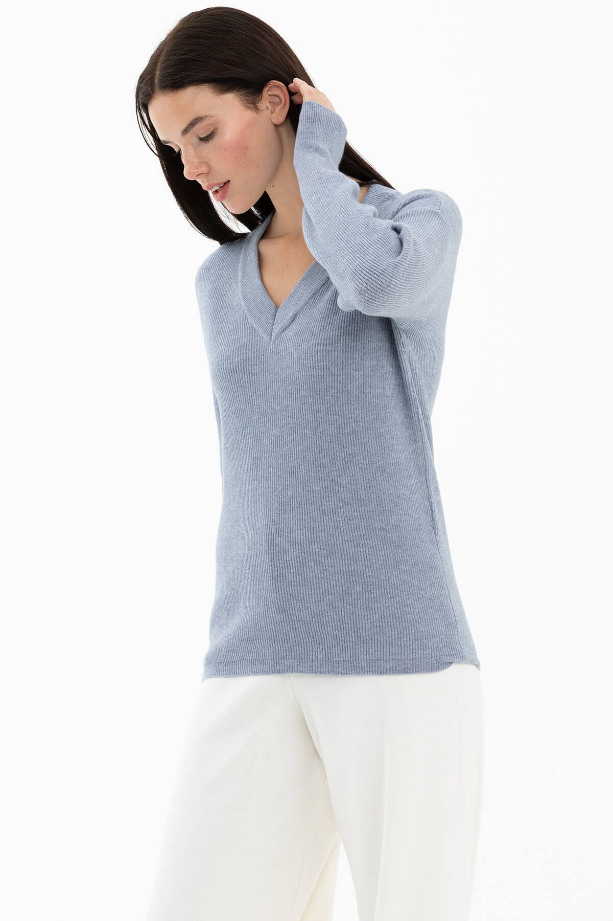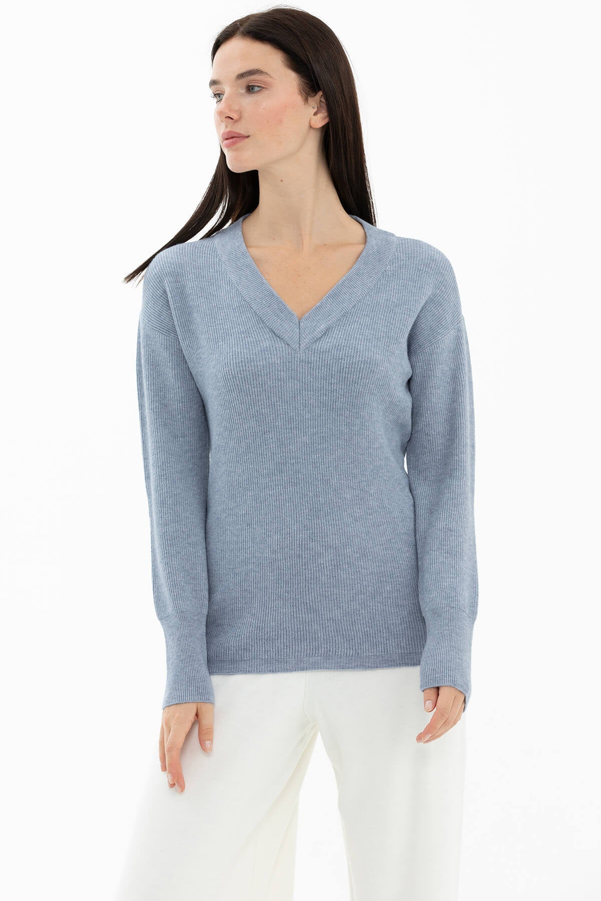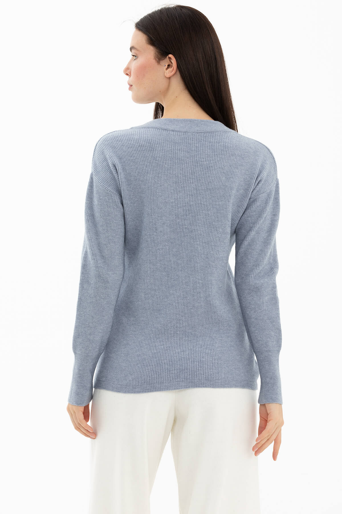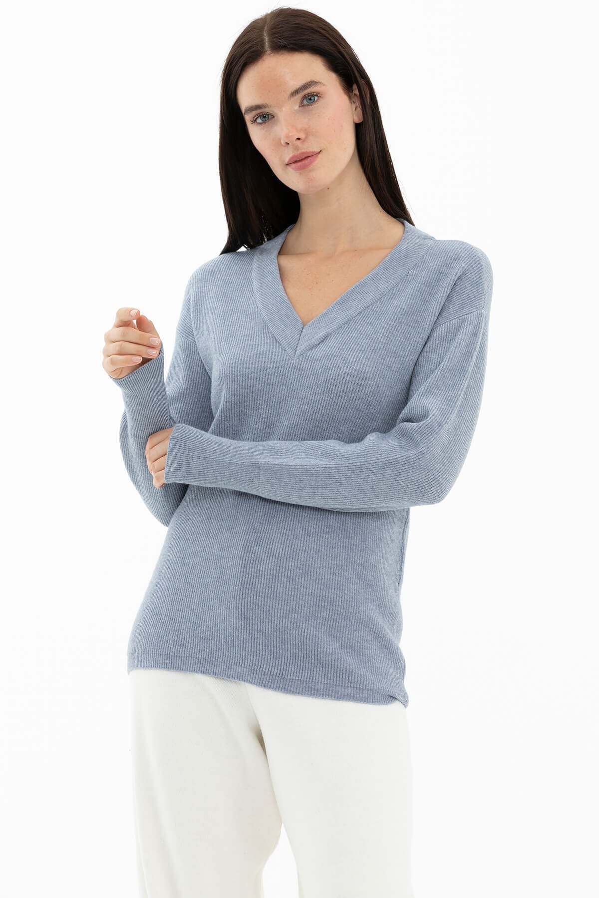 V yaka, uzun kollu, derbili yumuşak dokulu triko kazak.