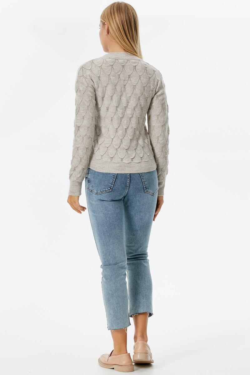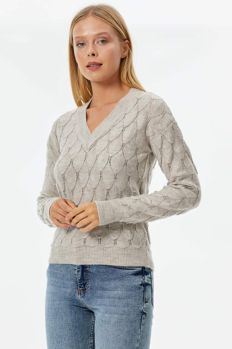 V Yaka Yaprak Desenli Triko Kazak - Açık Bej