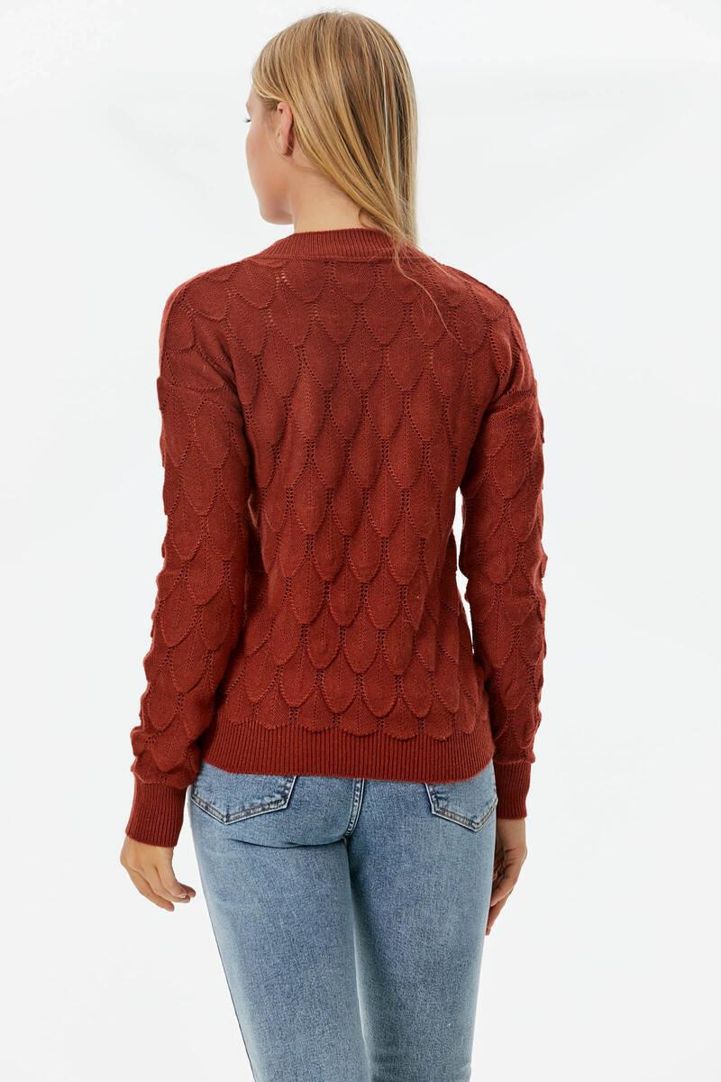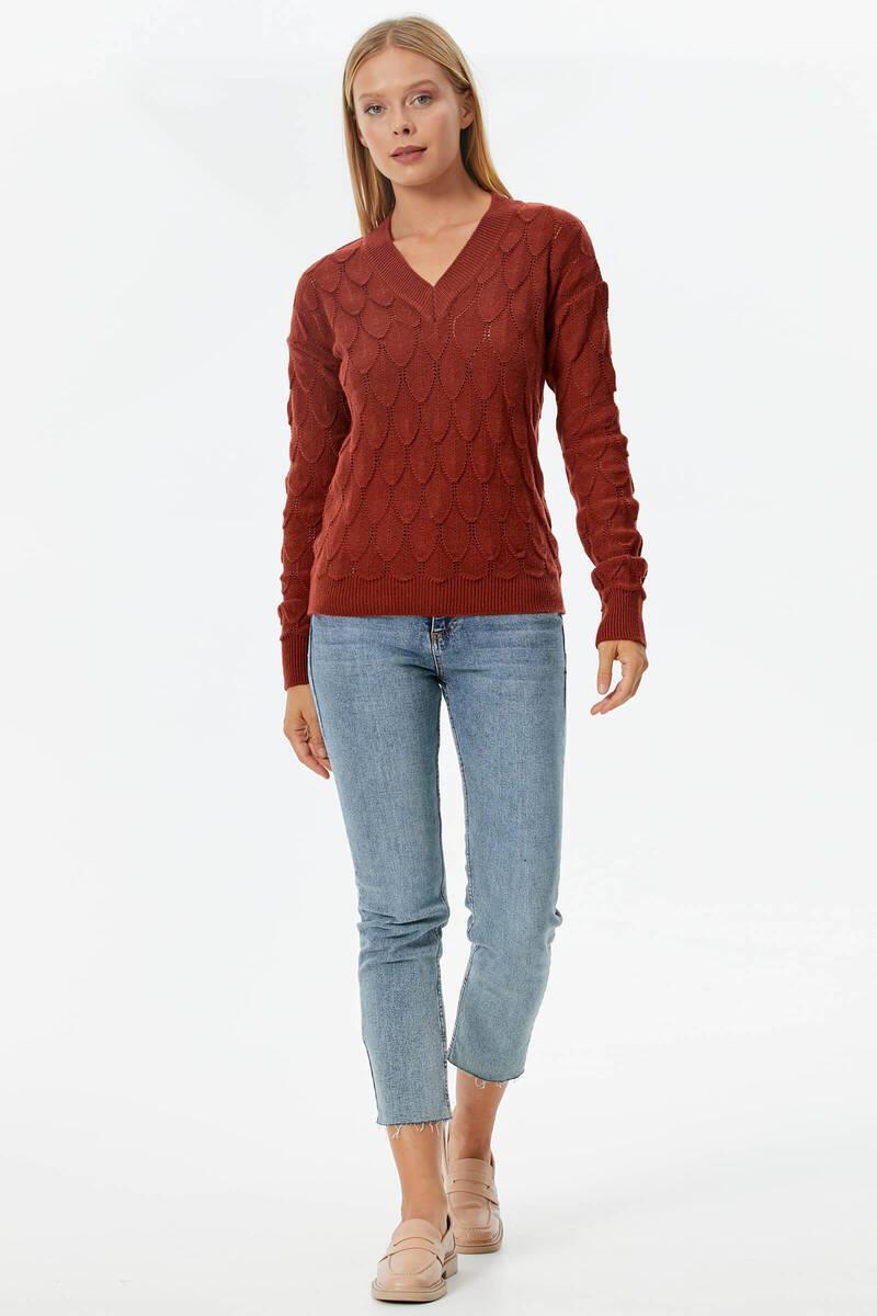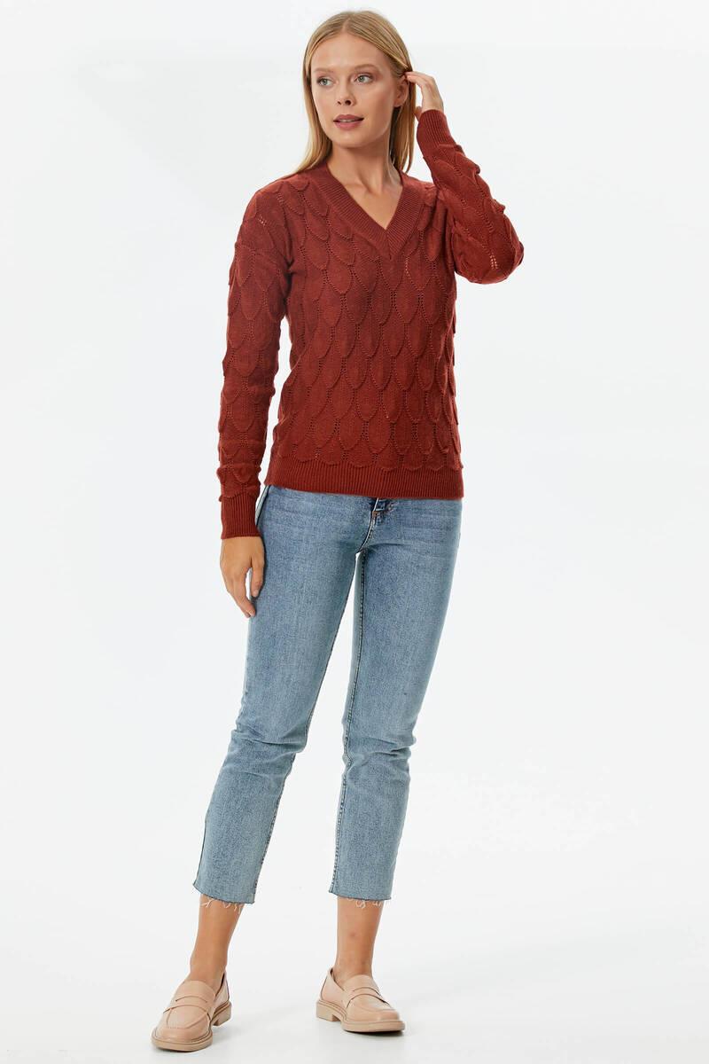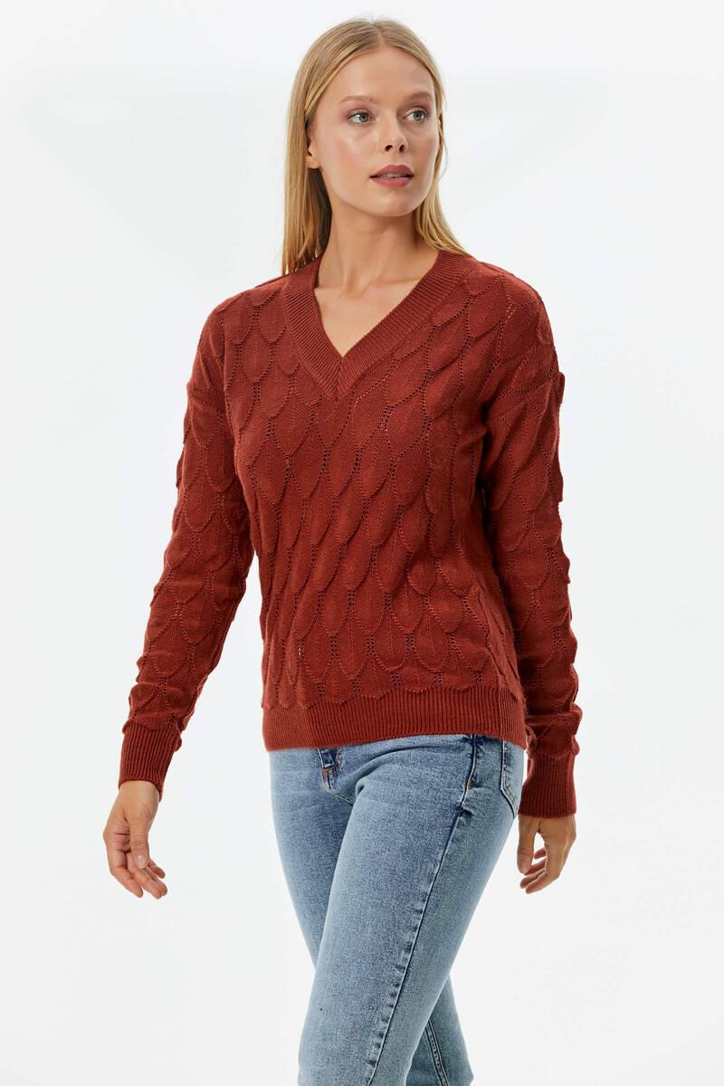 V Yaka Yaprak Desenli Triko Kazak - Koyu Kiremit
