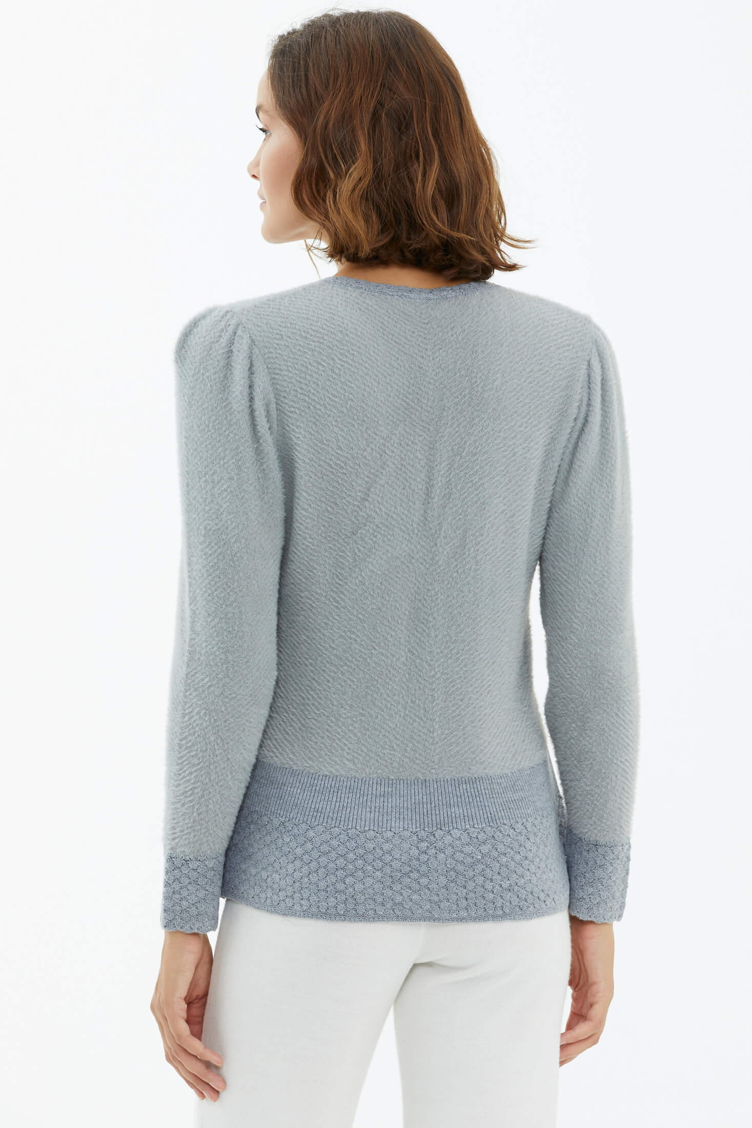 Yün karışımlı iplikten üretilmiş, v yaka, uzun kollu, yaka, manşetleri ve etek ucu örgü detaylı, ön etek ucu yırtmaçlı yumuşak triko kazak.