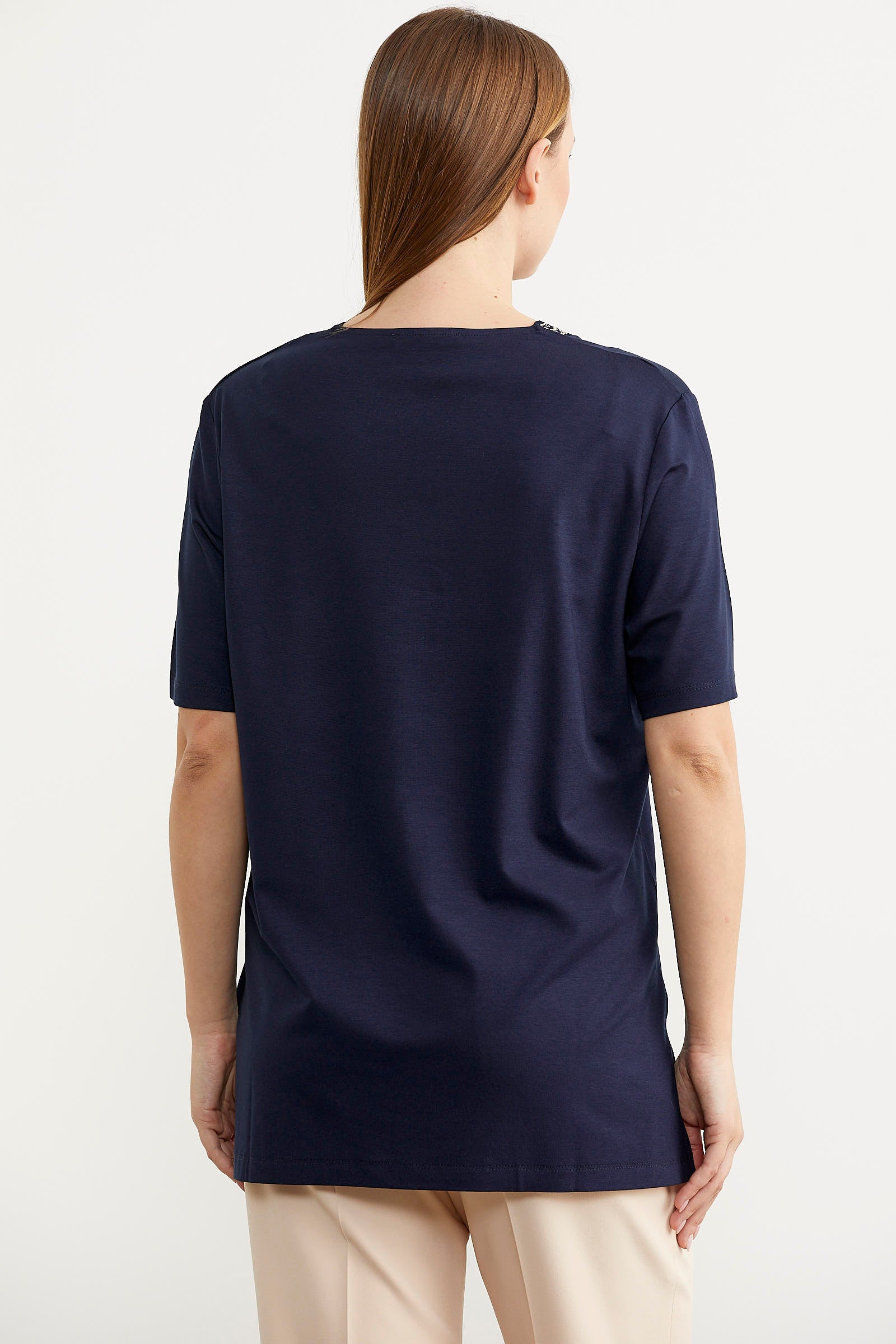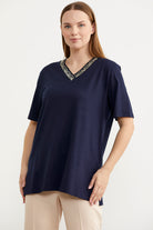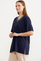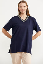 Yaka Detaylı Dökümlü Tişört - Lacivert