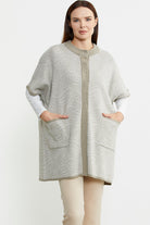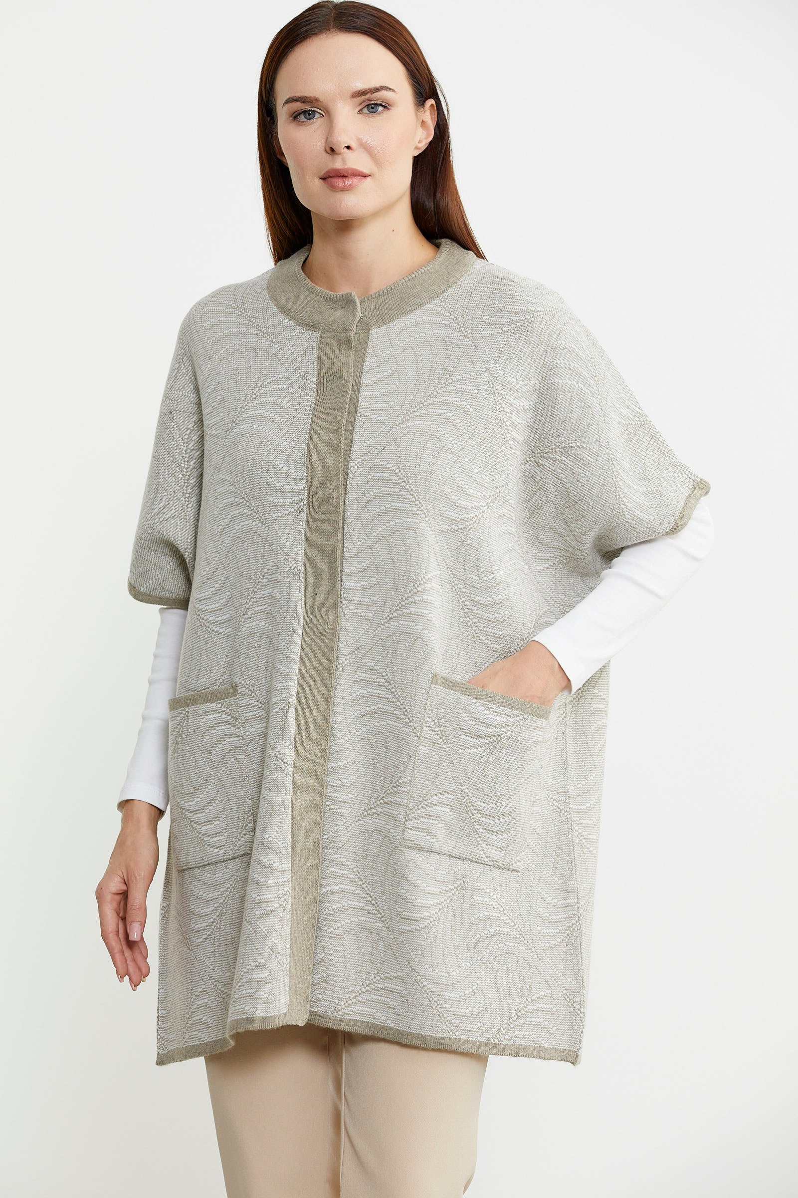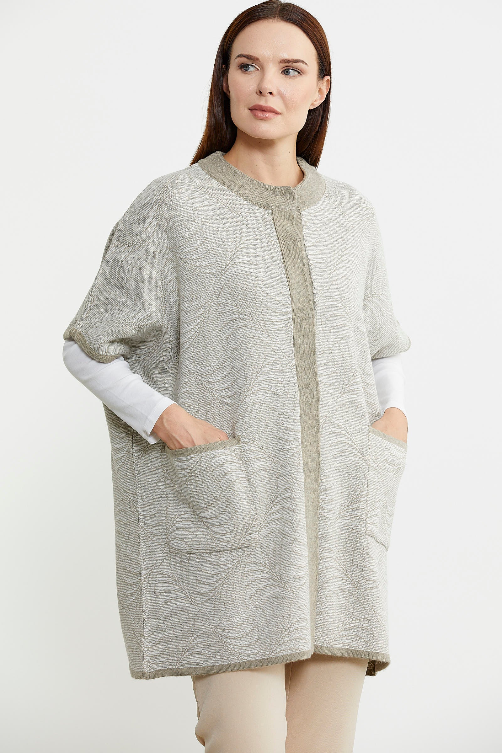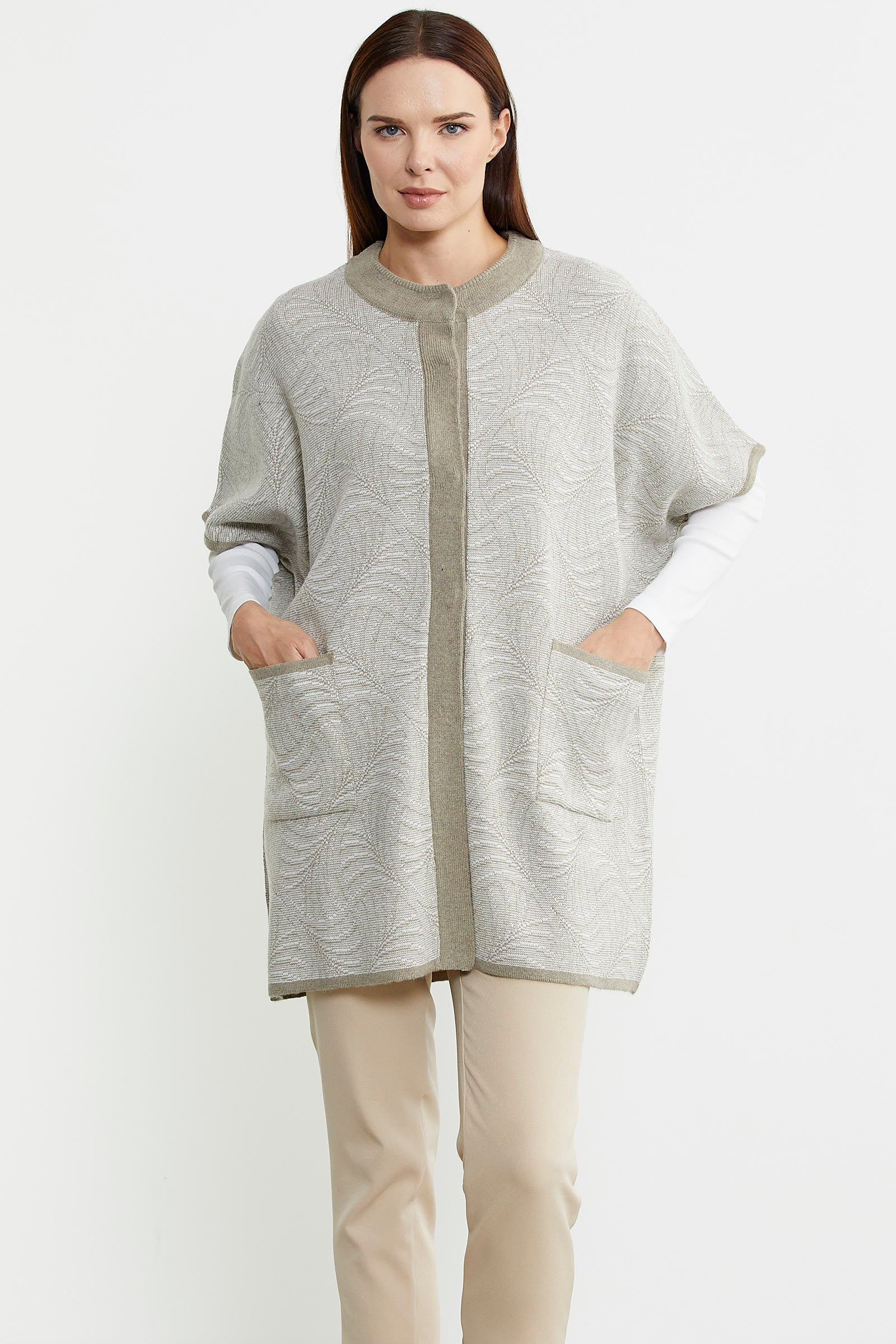 Jakarlı örgünün düz biyeyle birlikte kullanıldığı cepli triko hırka tunik boy üretilmiştir. Yüksek oranda yün içerir.