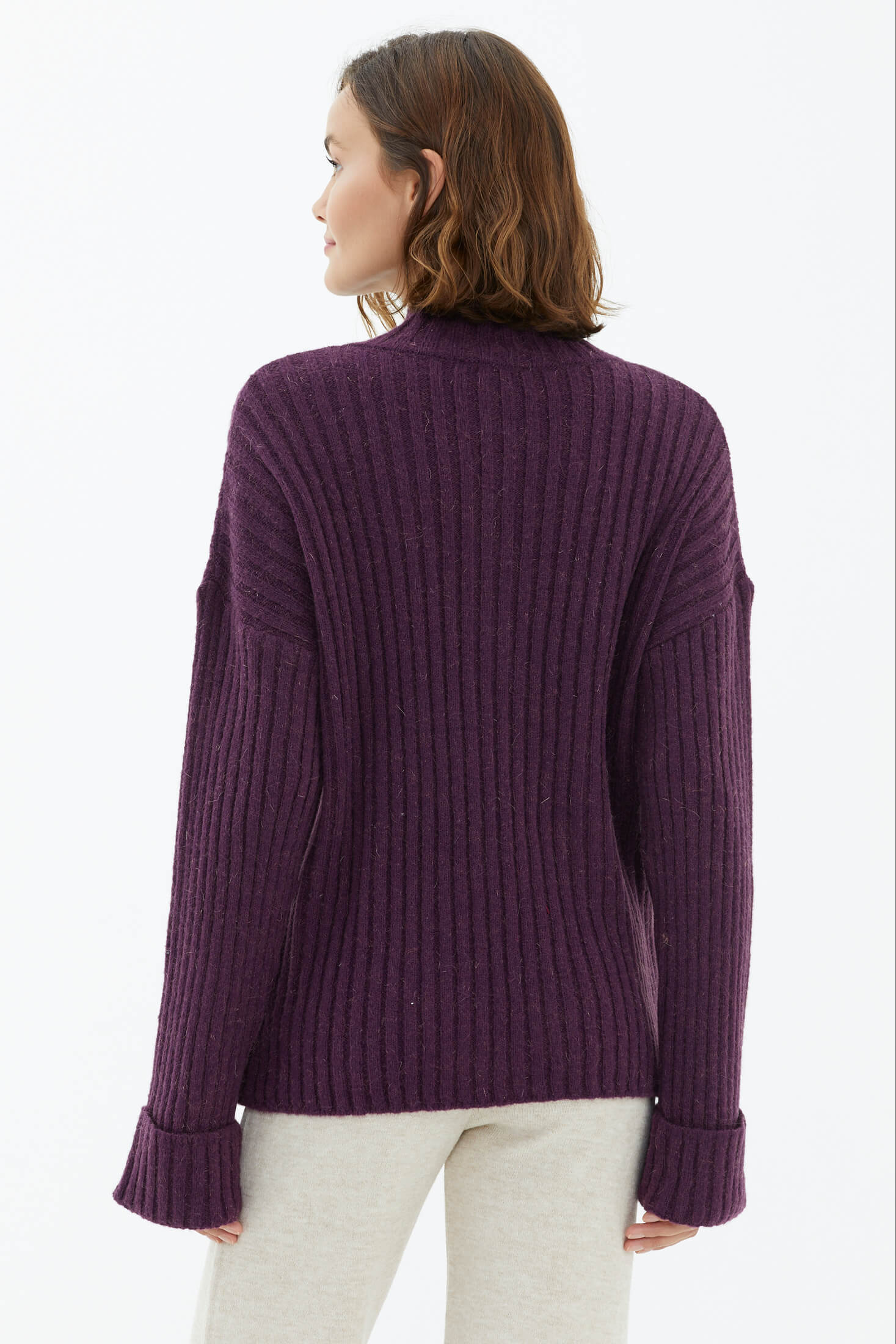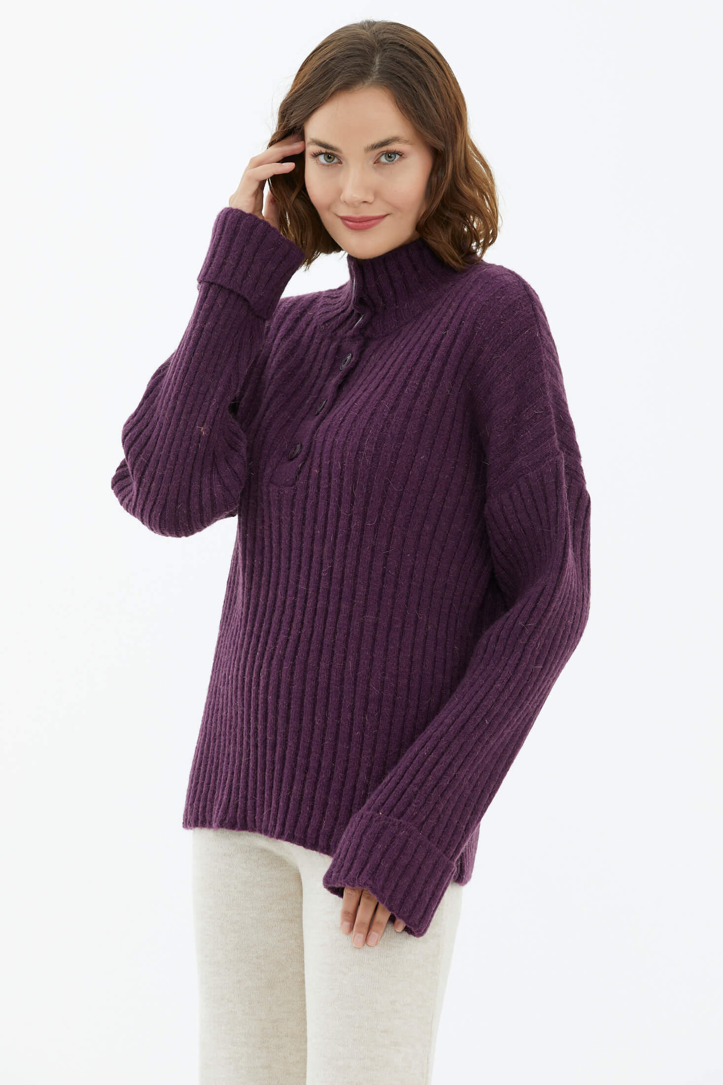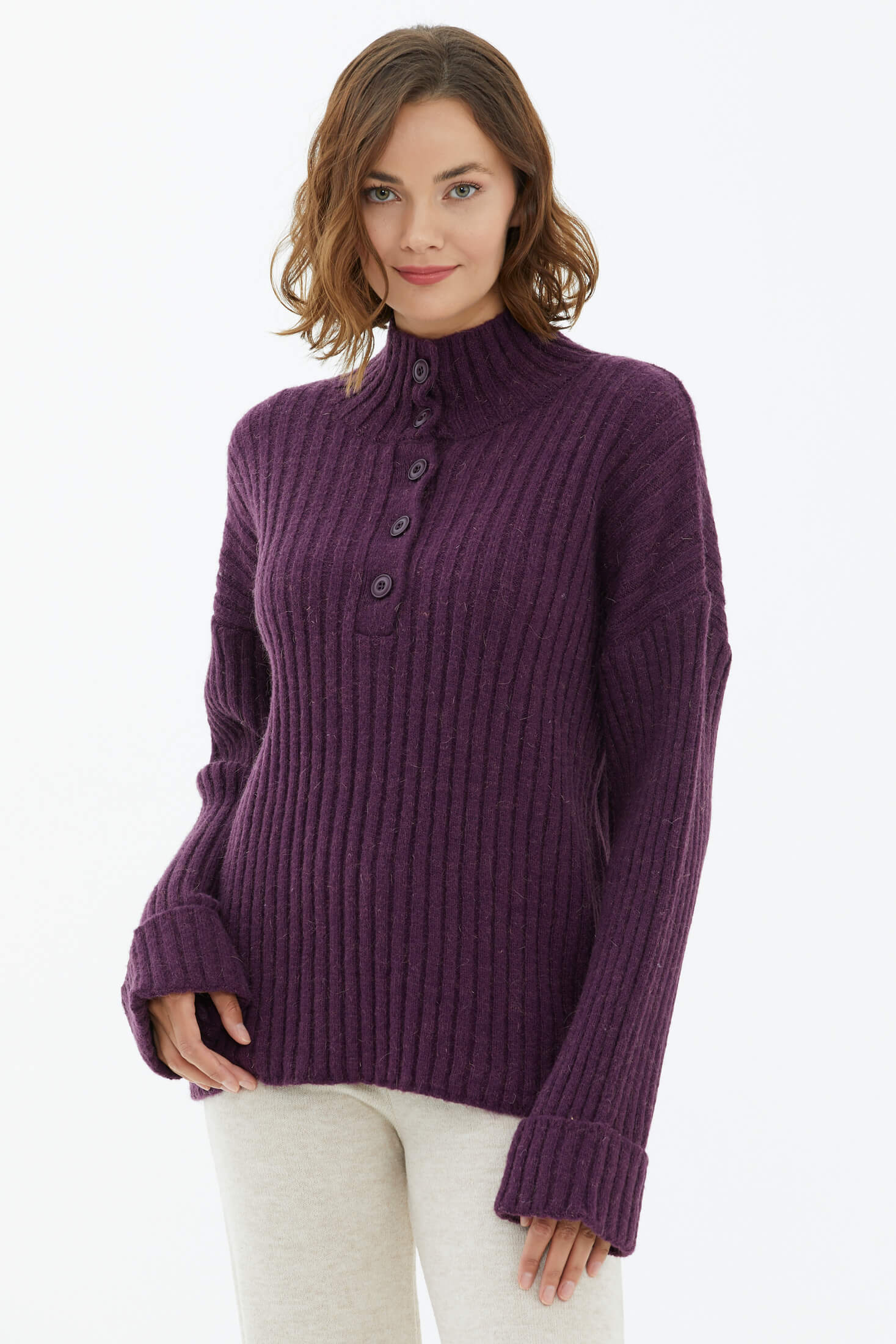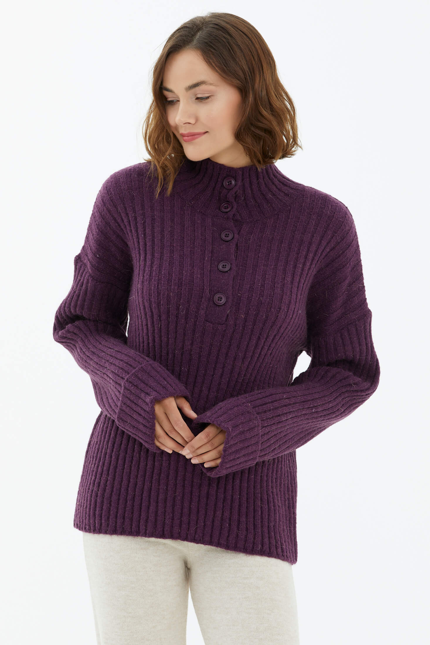 Yarım Balıkçı Yaka Düğmeli Kazak - Mor