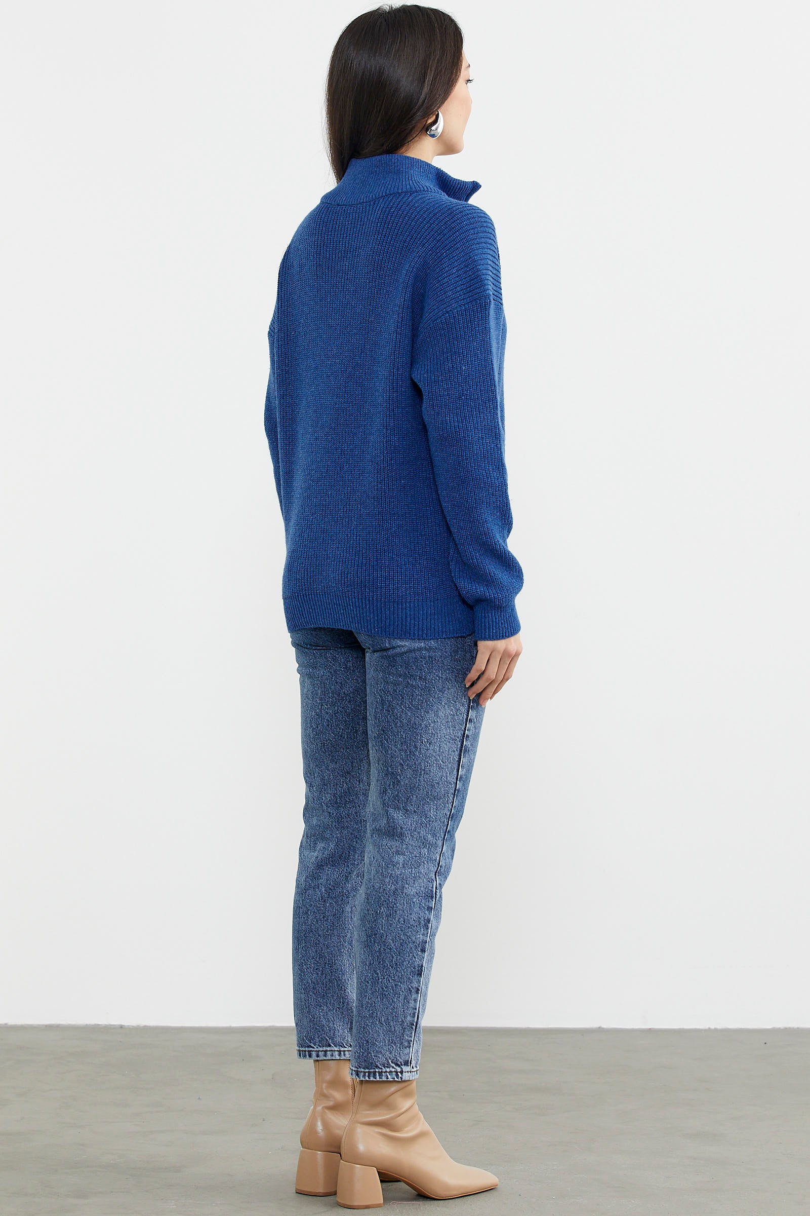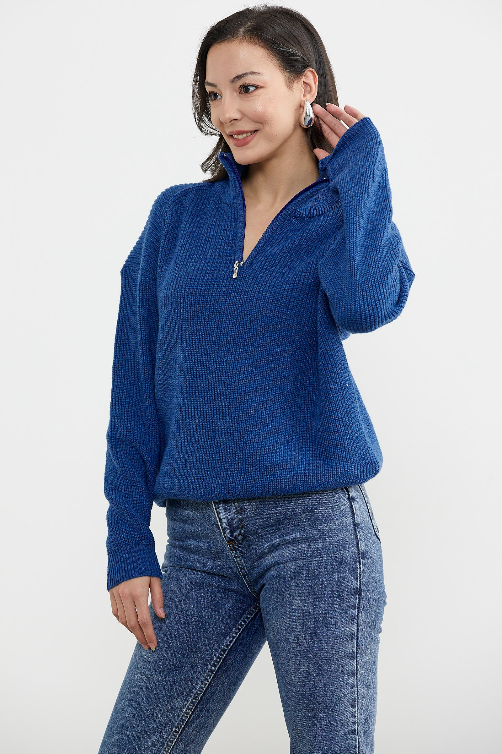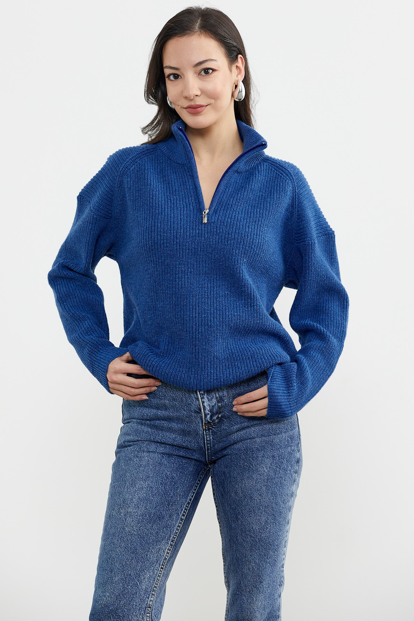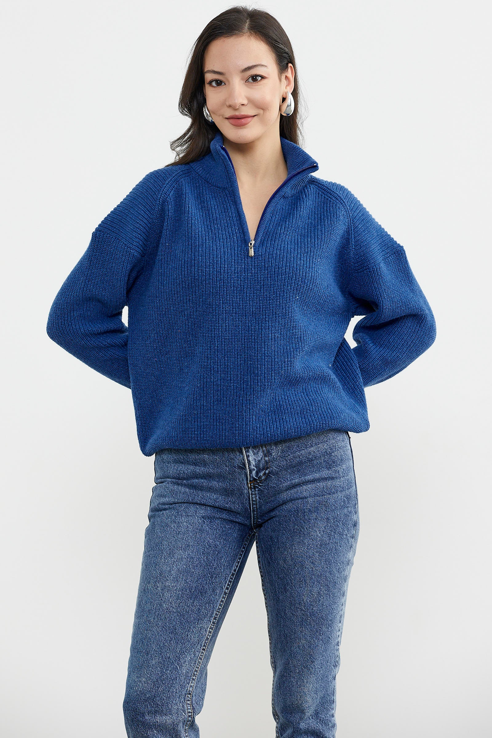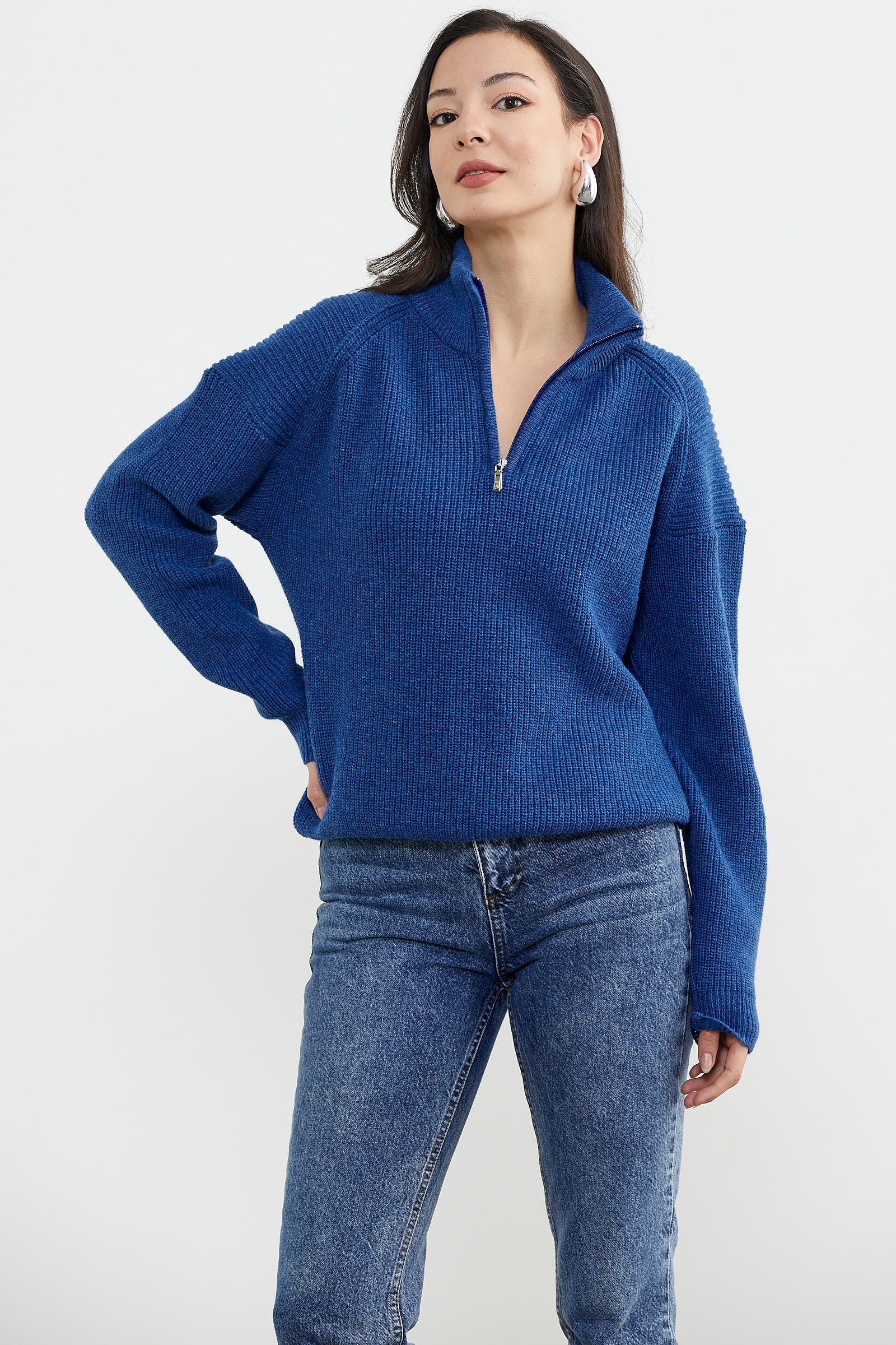 Yün karışımlı iplikten üretilmiş, uzun kollu, yarım balıkçı yaka, üstü fermuar kapamalı triko kazak.
