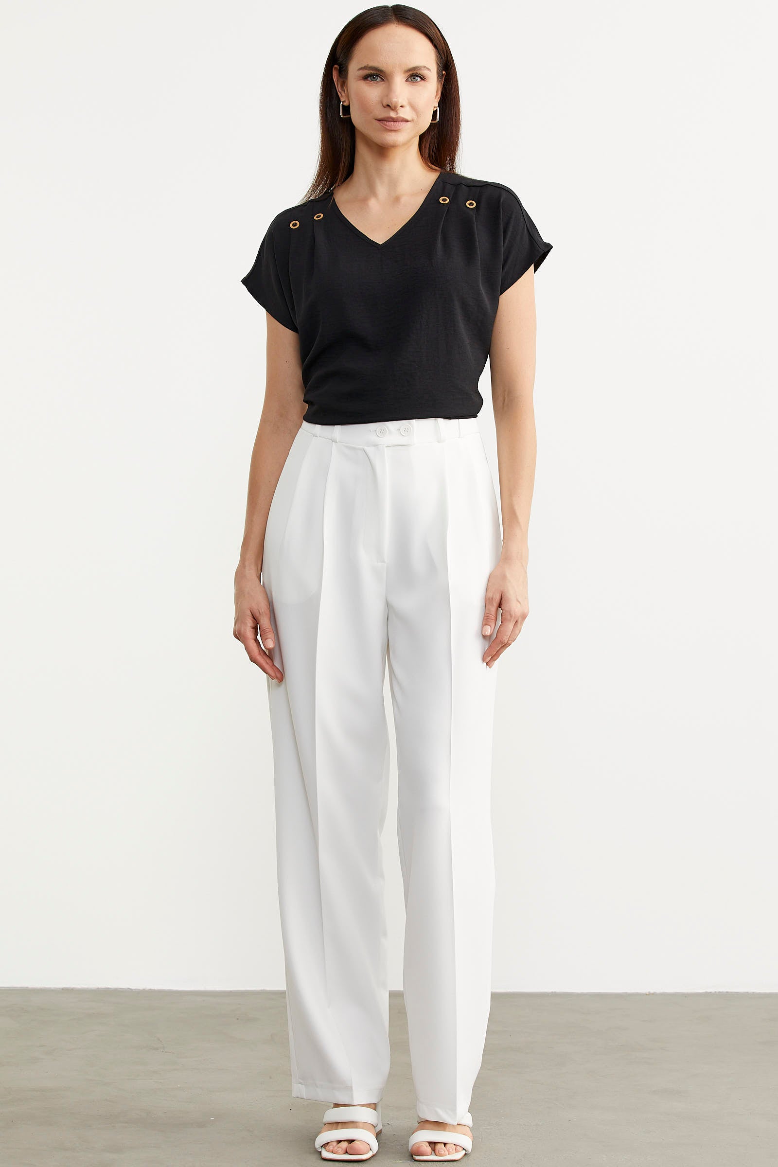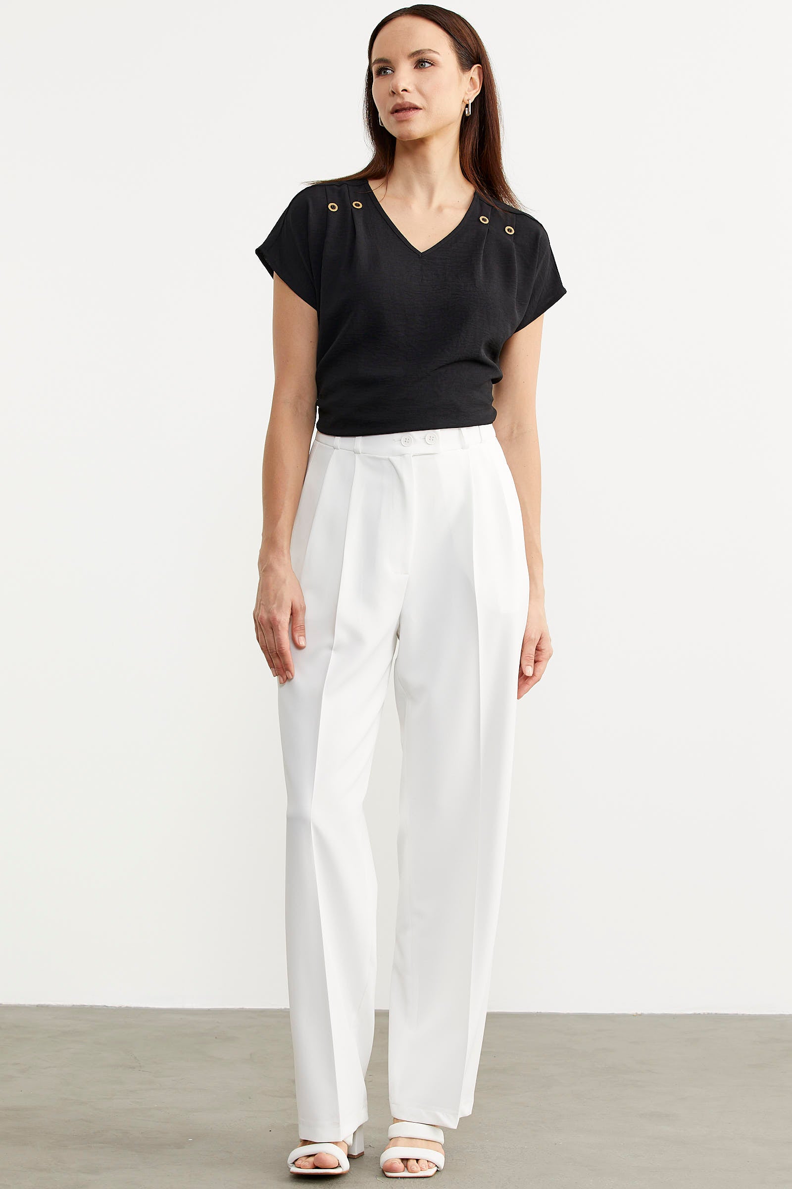 Yüksek bel pileli palazzo kumaş pantolon bol ve dökümlü duruşuyla her beden tipine uygundur. Topuklu ayakkabı veya spor sandaletlerle opsiyonel olarak kullanılabilir.