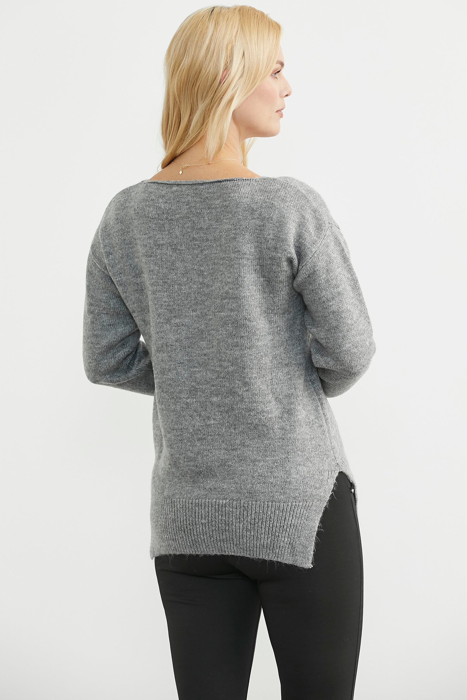V yaka, yumuşak dokulu, etek ucu yırtmaçlı, uzun boy, basic triko kazak.