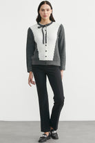 Fitilli, yumuşak örgülü, kontrast desenli triko hırka. Yaka detaylı ve rahat kalıp.