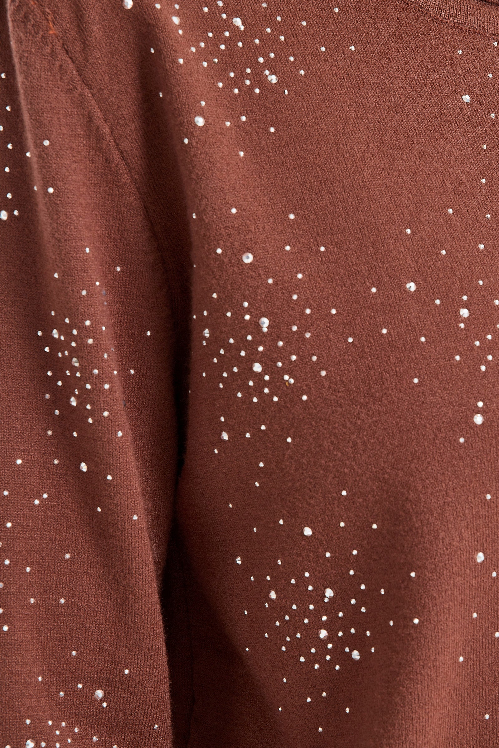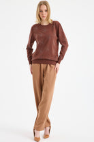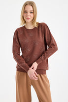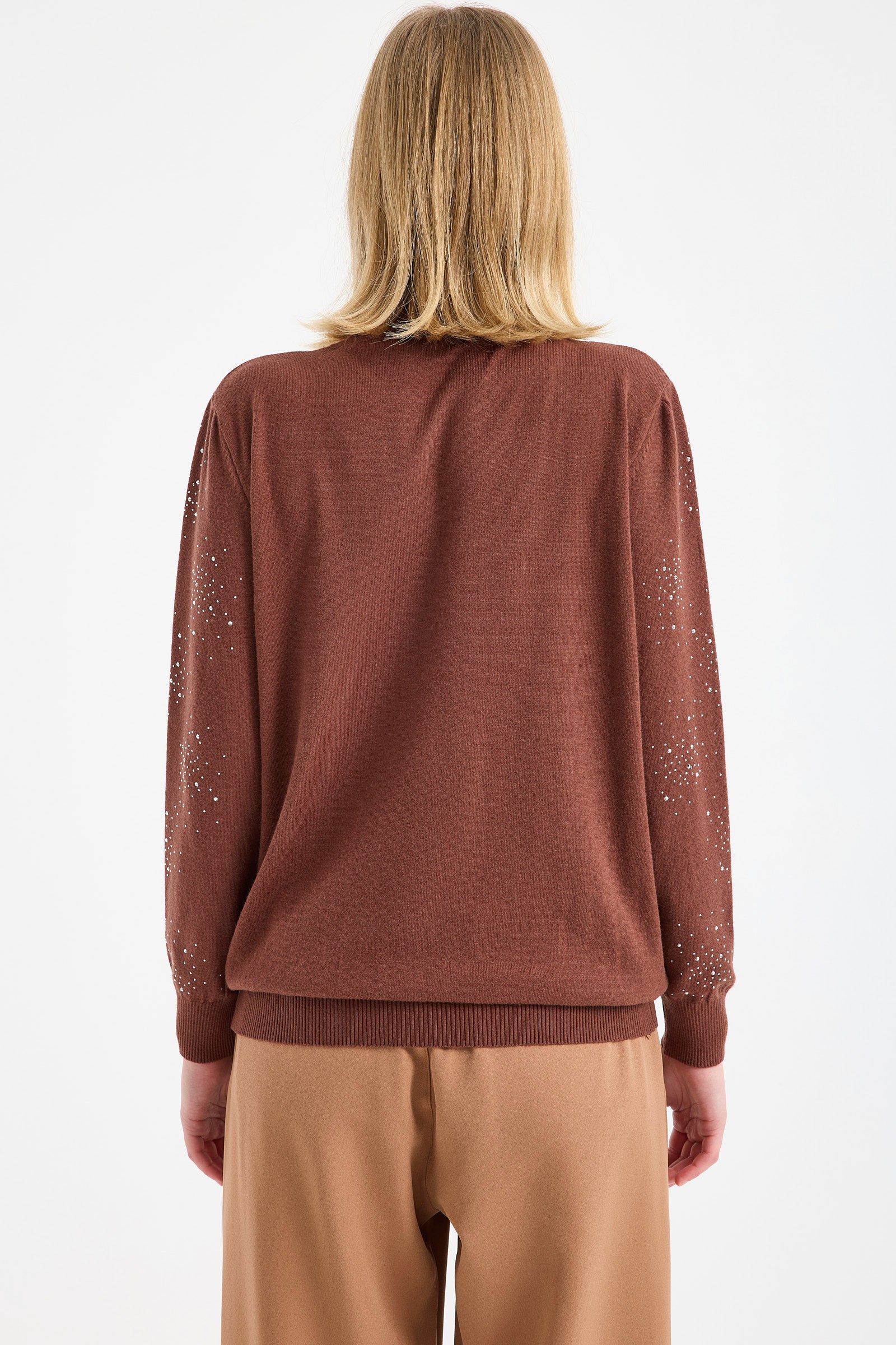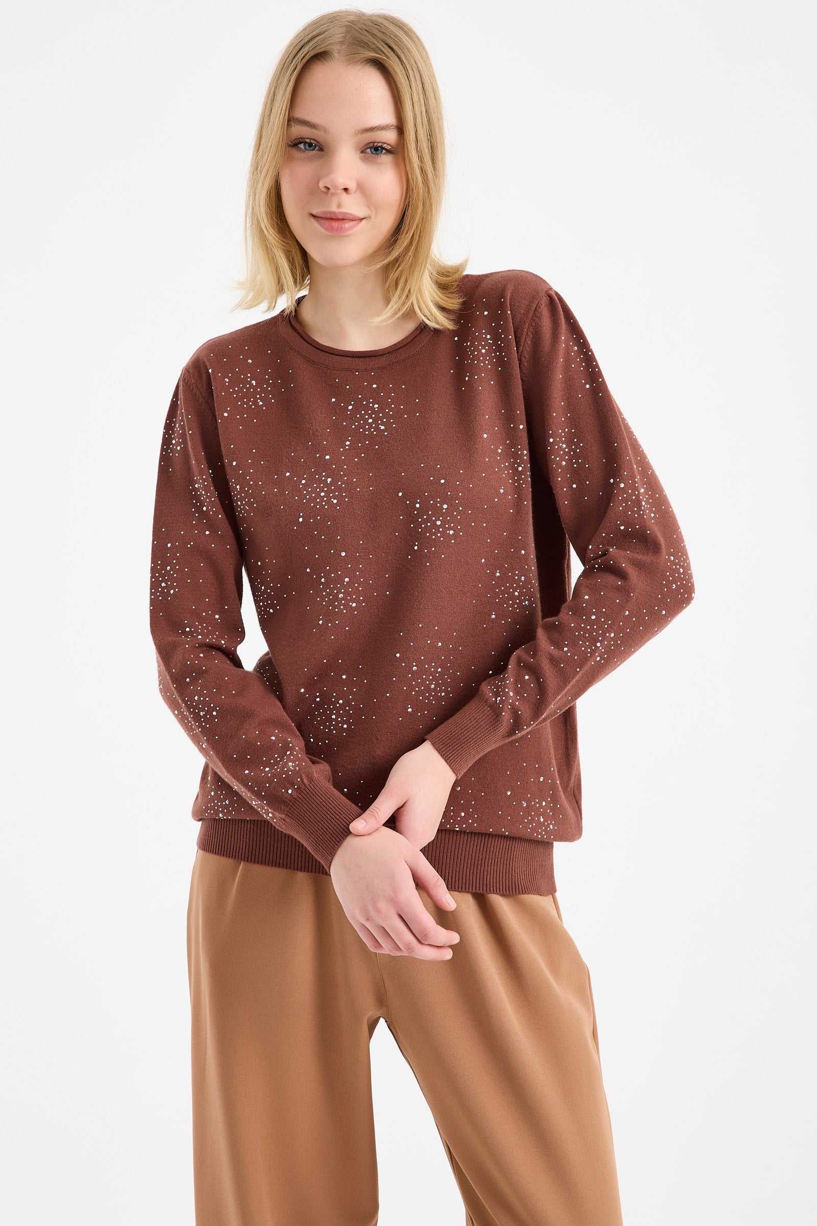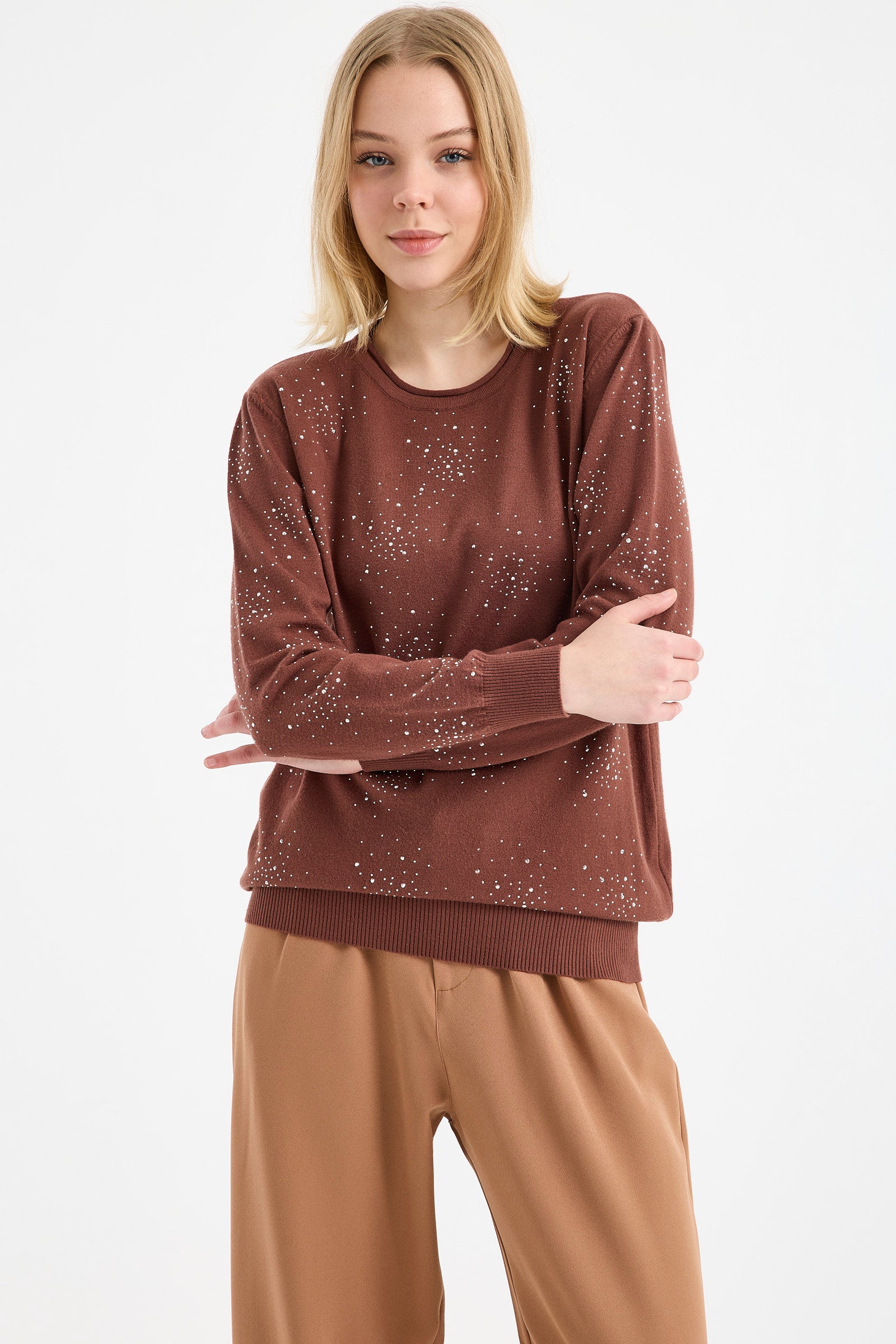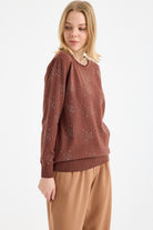 Yuvarlak Yaka Taşlı Triko Kazak - Kahve