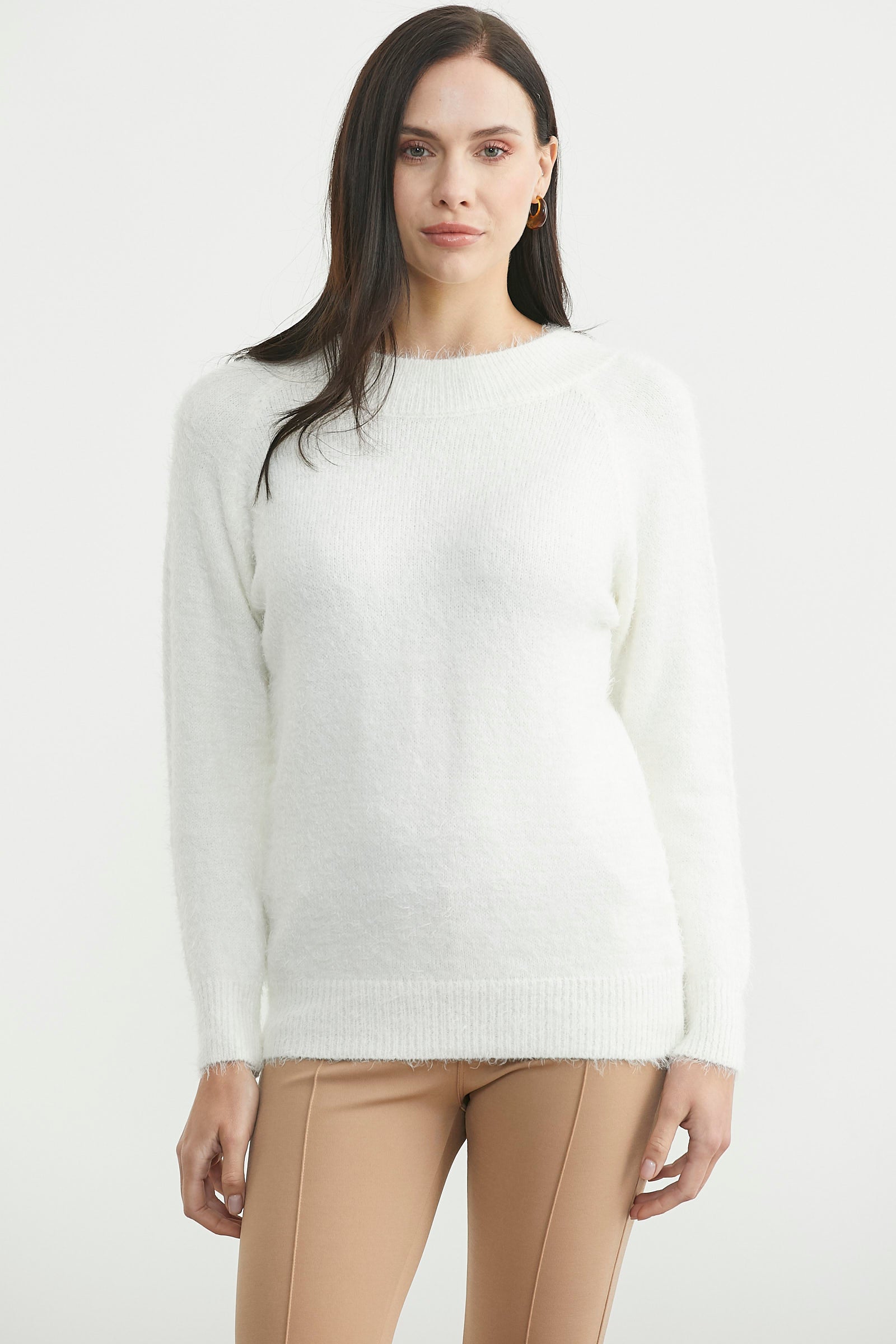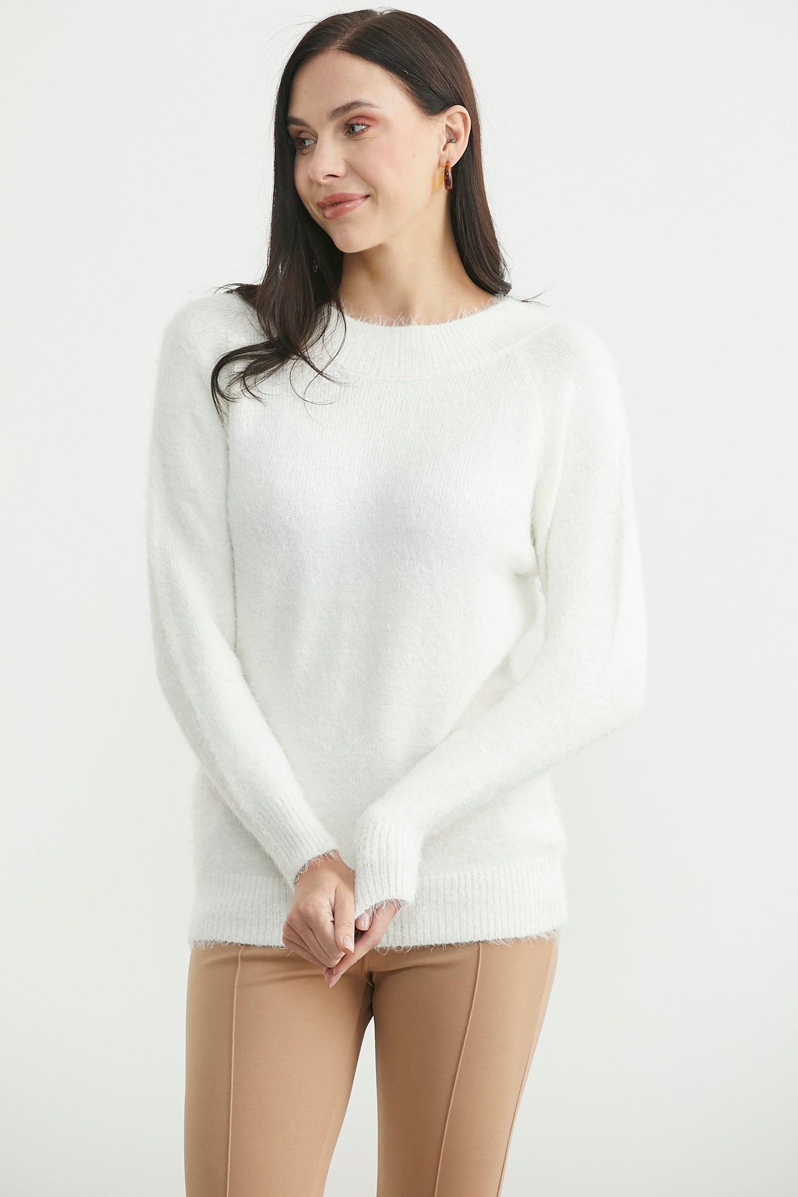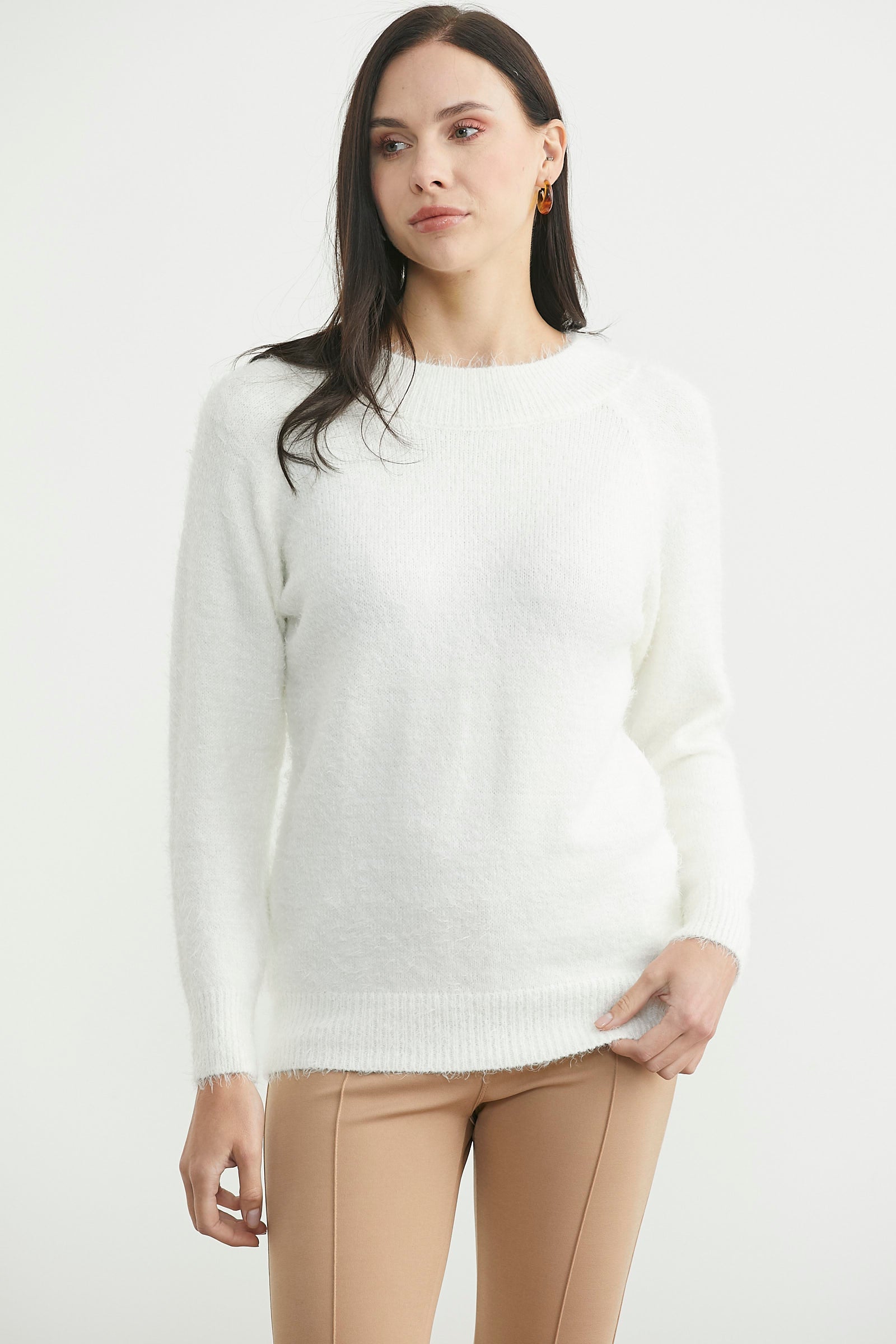Yuvarlak Yaka Yumoş Basic Triko Kazak - Beyaz