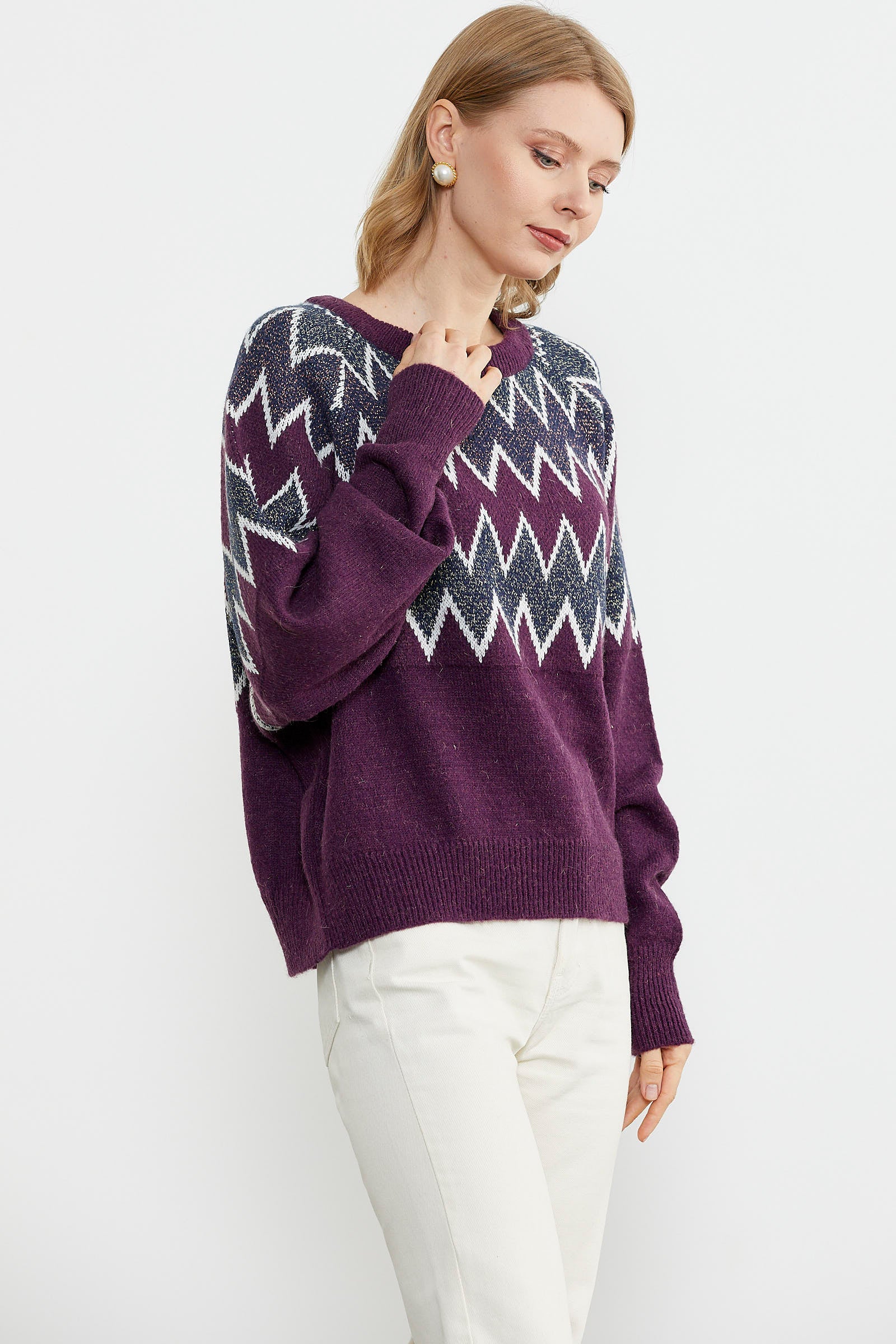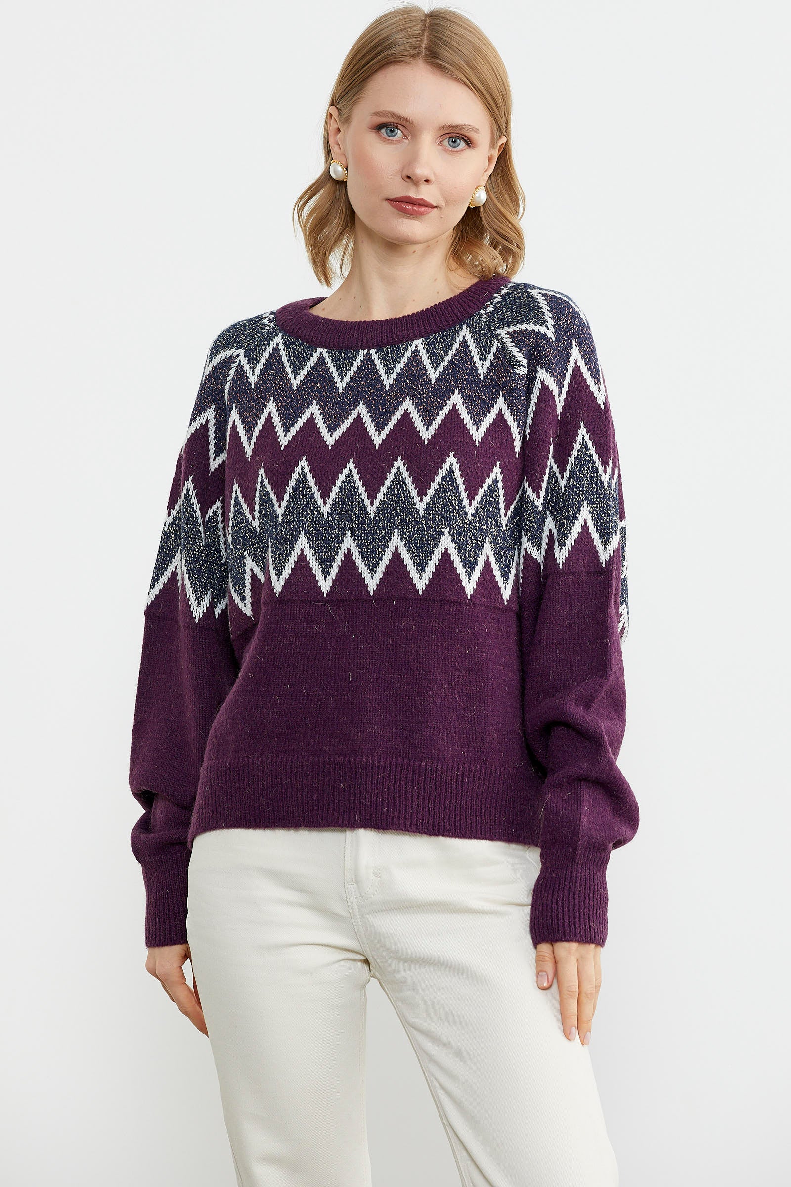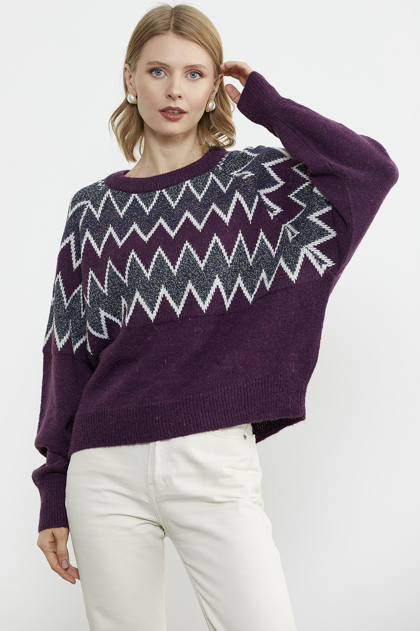 Zik Zak Desenli Kalın Triko Kazak - Mor