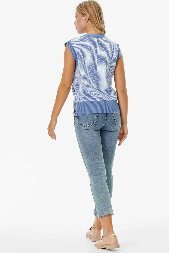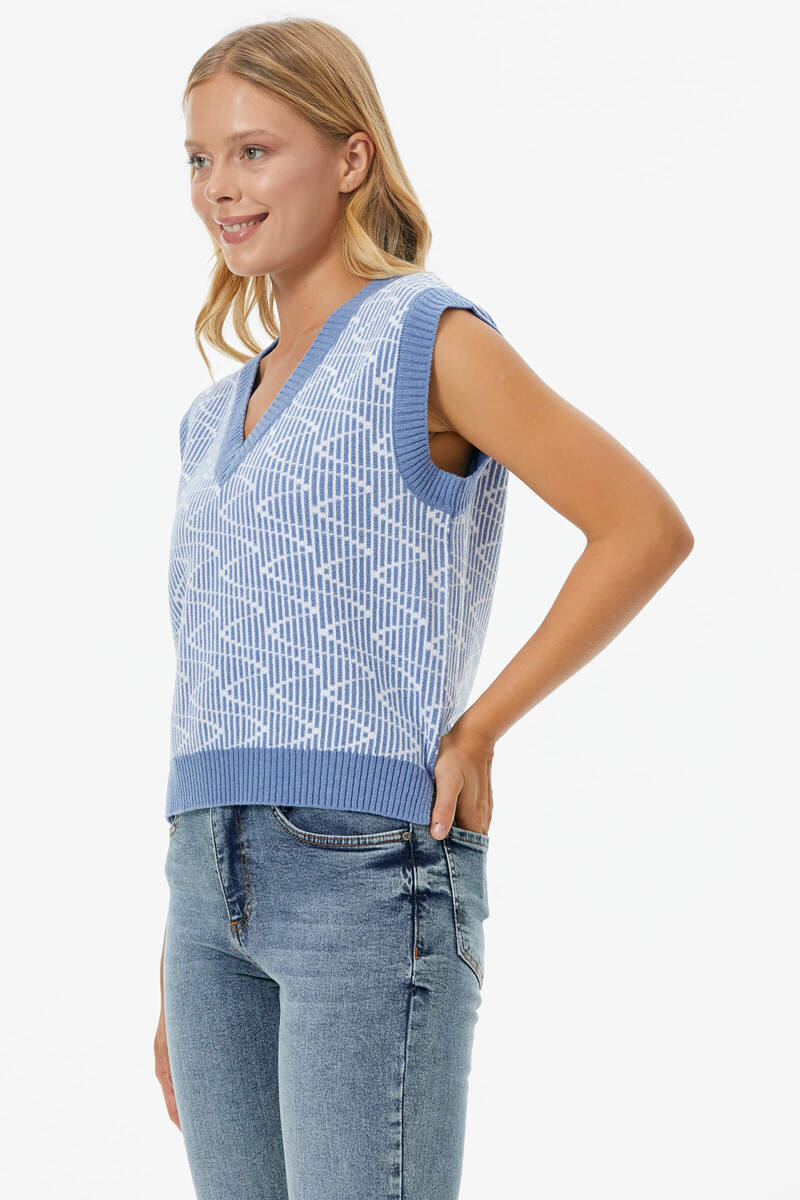 V yaka,kolsuz,kumaşı yumuşak dokulu ve desenli triko süveter.