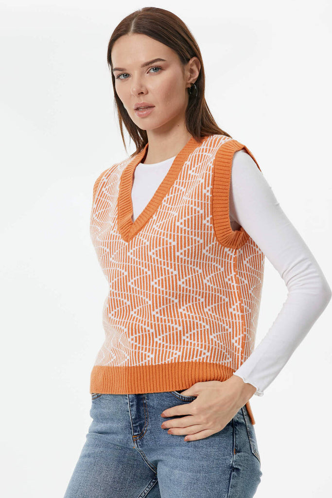 V yaka,kolsuz,kumaşı yumuşak dokulu ve desenli triko süveter.
