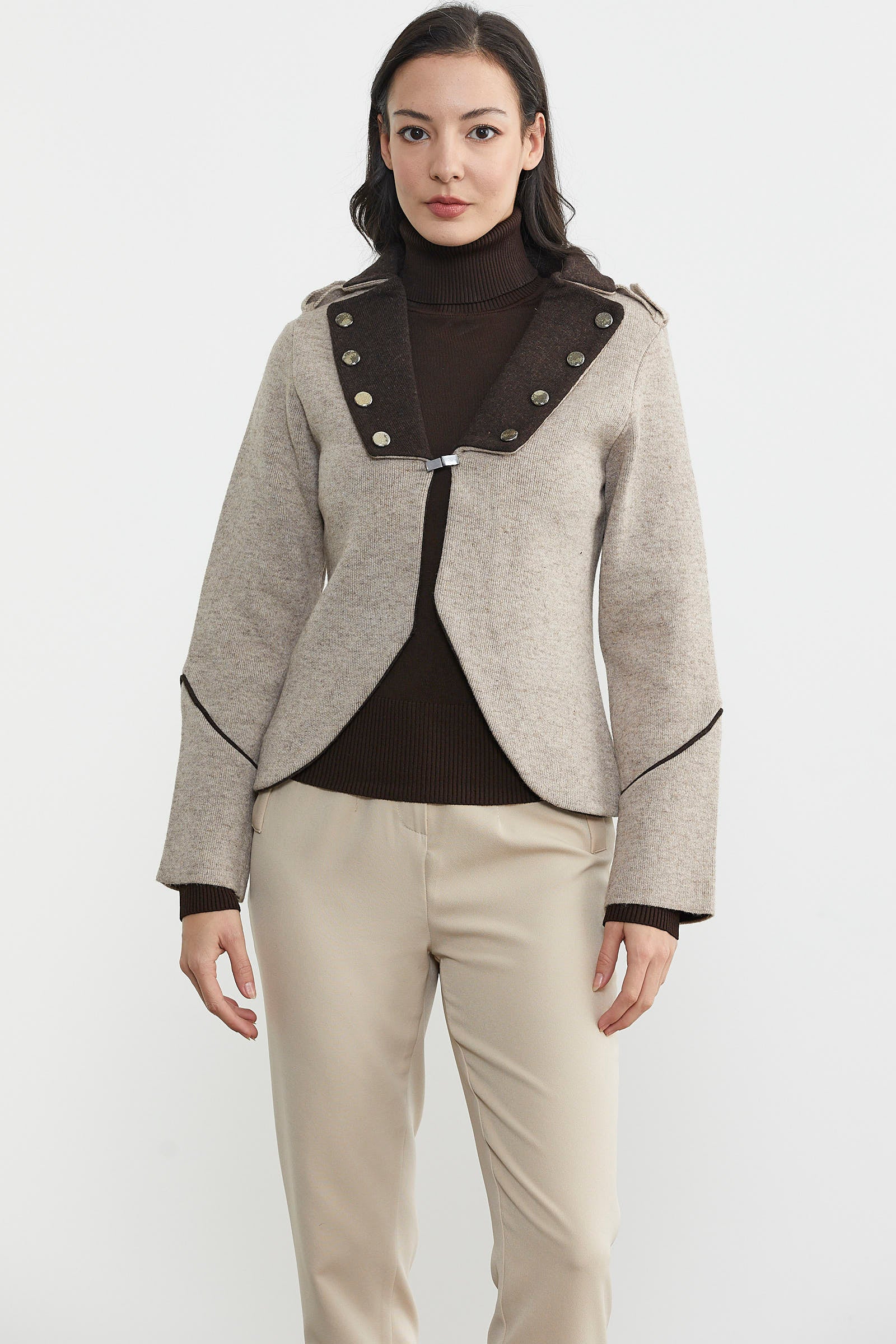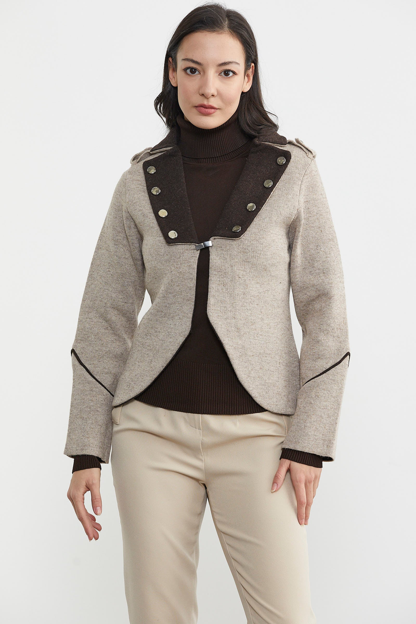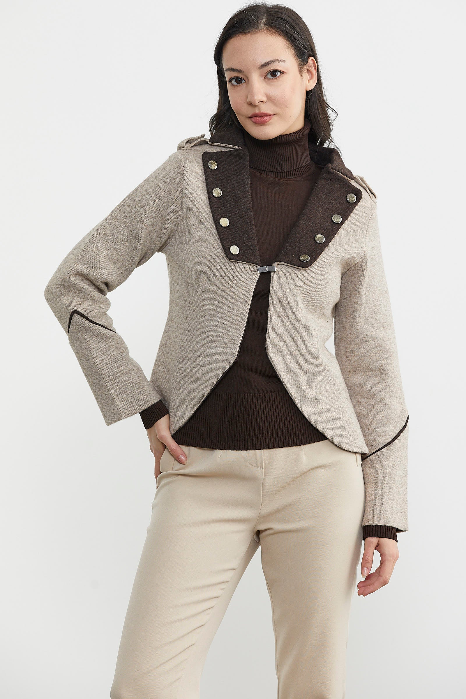 Zımba Detaylı Triko Ceket - Vizon - Kahverengi