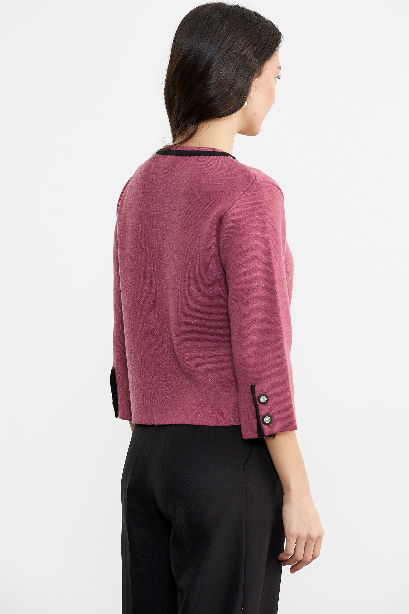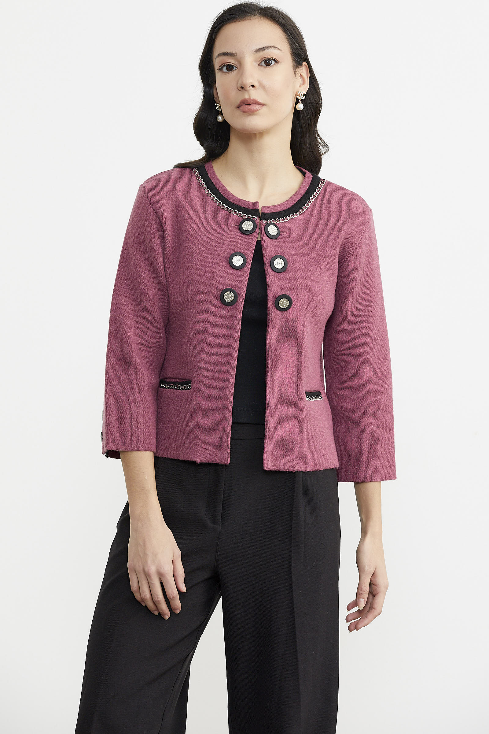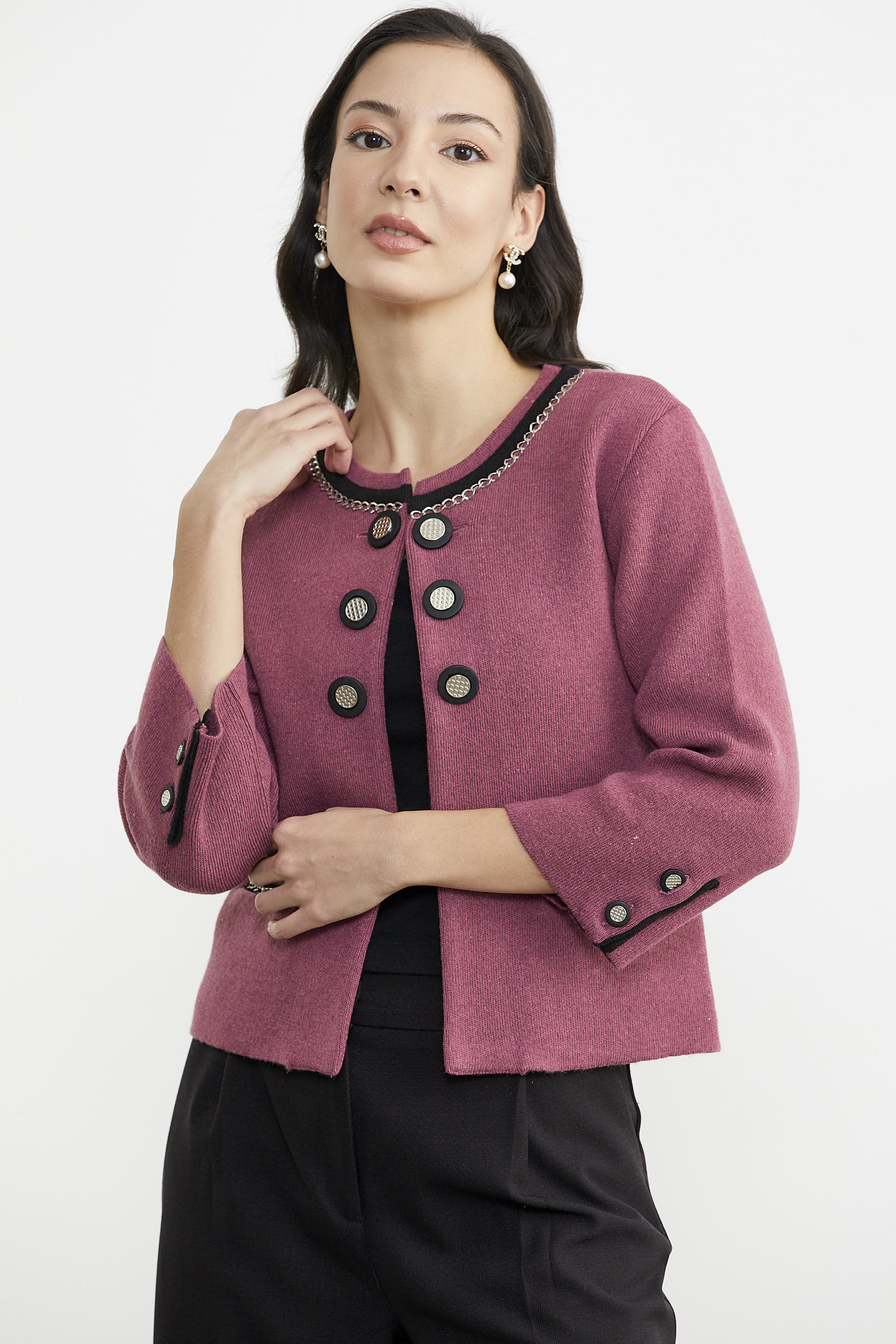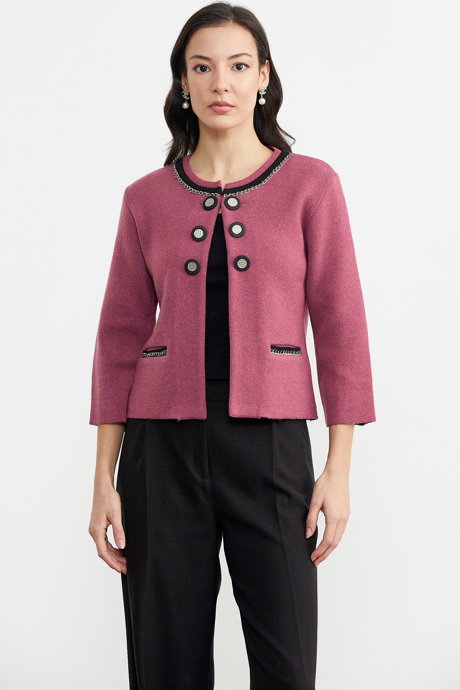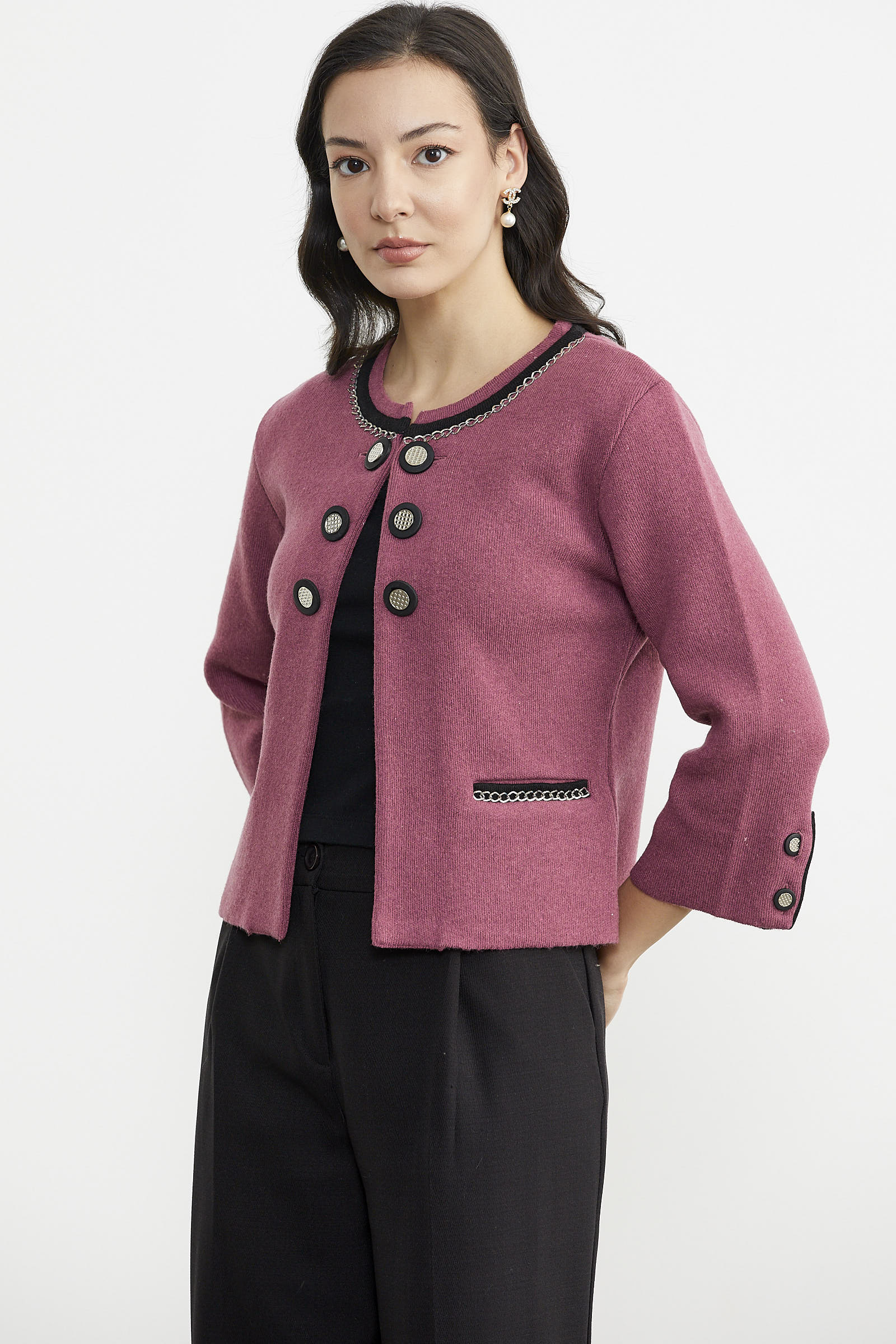 Zincir Detaylı Kalın Yünlü Triko Ceket - Gül - Siyah